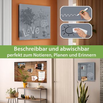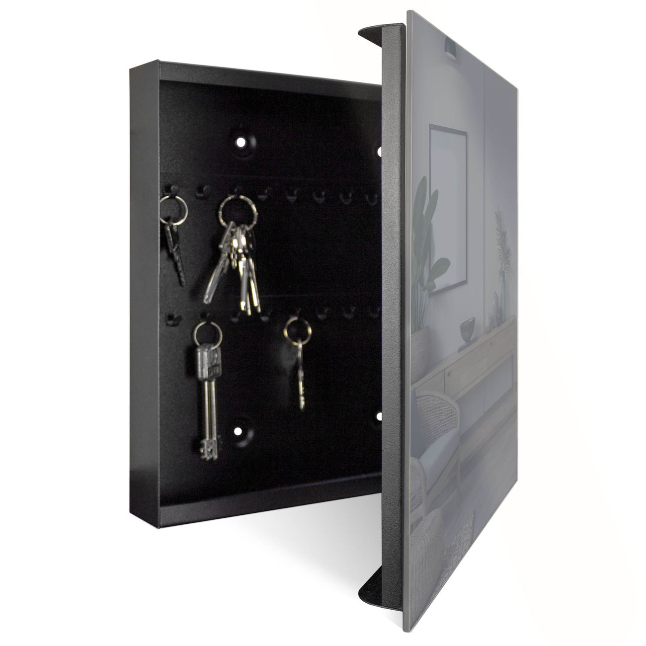 Bringe Ordnung und Eleganz in deinen Eingangsbereich mit dem banjado Schlüsselkasten Motiv Farbe Silber Metallic. Die moderne Schlüsselbox kombiniert funktionales Design mit hochwertiger Verarbeitung und wird so zu einem echten Hingucker in Flur, Büro oder Ferienwohnung. ✅ Stilvolle Schlüsselaufbewahrung mit Glasfront im Motiv Farbe Silber Metallic Der Design-Schlüsselkasten Motiv Farbe Silber Metallic bietet Platz für bis zu 50 Schlüssel, die auf 5 stabilen Reihen mit je 10 Haken übersichtlich verstaut werden. Mit seinen kompakten Maßen von 30 x 30 x 5 cm passt die Schlüsselbox perfekt auch in kleinere Räume. Der schwarz lackierte Stahlkorpus mit rechts angeschlagenem Türscharnier harmoniert mit der Glasfront und fügt sich nahtlos in jedes Wohnambiente ein. Ob als Schlüsselorganizer für Zuhause oder als praktische Lösung für Büros, Praxen und Gewerbe, der banjado Schlüsselkasten sorgt für Ordnung und Übersicht. Dank der magnetischen, mit Kreidestiften beschreibbaren Glasfront kannst du Notizen anheften oder Termine direkt auf der Oberfläche festhalten. Die Schlüsselbox Motiv Farbe Silber Metallic zur Wandmontage wird inklusive Befestigungsmaterial geliefert und ist schnell angebracht. So hast du deine Schlüssel jederzeit griffbereit und zugleich stilvoll verstaut. Mit diesem banjado Schlüsselkasten Motiv Farbe Silber Metallic kombinierst du praktische Aufbewahrung mit stilvollem Wohndesign. Ob privat oder geschäftlich, die Schlüsselbox sorgt für mehr Ordnung, Übersicht und ein wohnliches Ambiente.Vorteile im Überblick