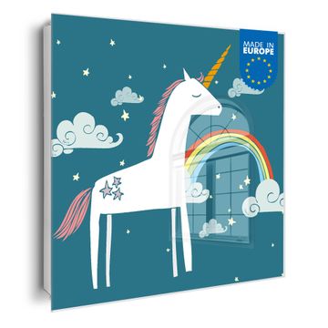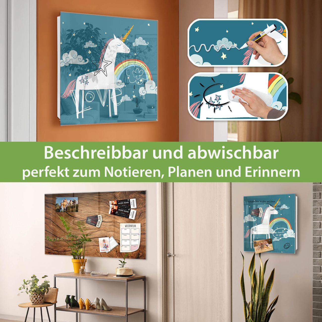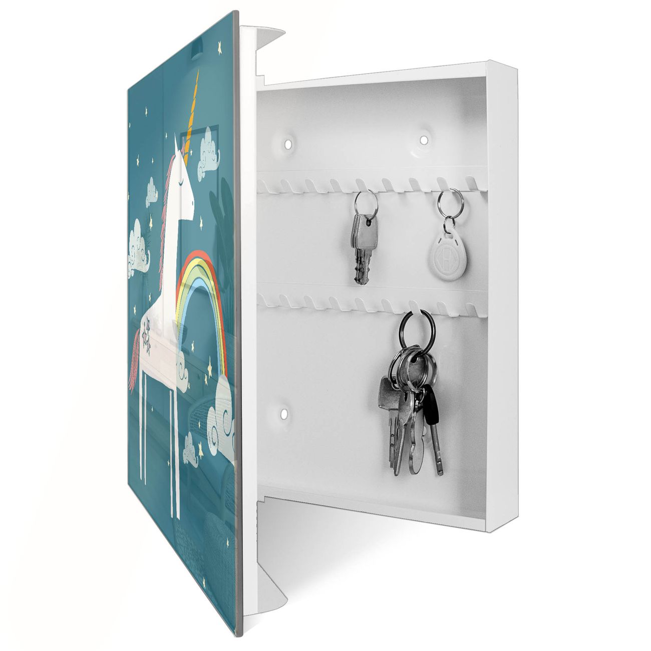 Bringe Ordnung und Eleganz in deinen Eingangsbereich mit dem banjado Schlüsselkasten Motiv Motiv Einhorn. Die moderne Schlüsselbox kombiniert funktionales Design mit hochwertiger Verarbeitung und wird so zu einem echten Hingucker in Flur, Büro oder Ferienwohnung. ✅ Stilvolle Schlüsselaufbewahrung mit Glasfront im Motiv Motiv Einhorn Der Design-Schlüsselkasten Motiv Motiv Einhorn bietet Platz für bis zu 50 Schlüssel, die auf 5 stabilen Reihen mit je 10 Haken übersichtlich verstaut werden. Mit seinen kompakten Maßen von 30 x 30 x 5 cm passt die Schlüsselbox perfekt auch in kleinere Räume. Der weiß lackierte Stahlkorpus mit rechts angeschlagenem Türscharnier harmoniert mit der Glasfront und fügt sich nahtlos in jedes Wohnambiente ein. Ob als Schlüsselorganizer für Zuhause oder als praktische Lösung für Büros, Praxen und Gewerbe, der banjado Schlüsselkasten sorgt für Ordnung und Übersicht. Dank der magnetischen, mit Kreidestiften beschreibbaren Glasfront kannst du Notizen anheften oder Termine direkt auf der Oberfläche festhalten. Die Schlüsselbox Motiv Motiv Einhorn zur Wandmontage wird inklusive Befestigungsmaterial geliefert und ist schnell angebracht. So hast du deine Schlüssel jederzeit griffbereit und zugleich stilvoll verstaut. Mit diesem banjado Schlüsselkasten Motiv Motiv Einhorn kombinierst du praktische Aufbewahrung mit stilvollem Wohndesign. Ob privat oder geschäftlich, die Schlüsselbox sorgt für mehr Ordnung, Übersicht und ein wohnliches Ambiente.Vorteile im Überblick