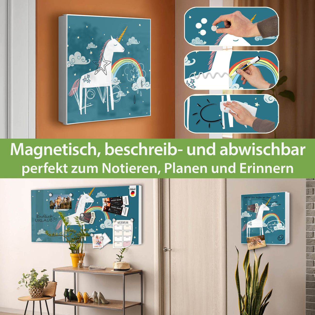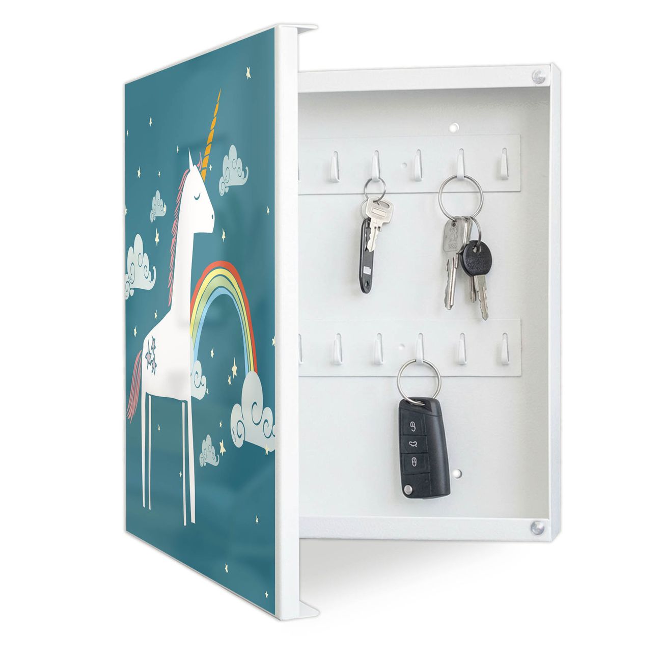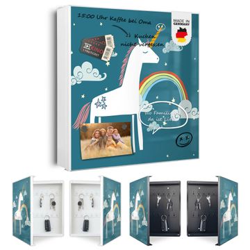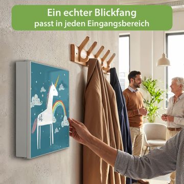 Bringe Ordnung und Eleganz in deinen Eingangsbereich mit dem banjado Schlüsselkasten Motiv Motiv Einhorn. Die moderne Schlüsselbox kombiniert funktionales Design mit hochwertiger Verarbeitung und wird so zu einem echten Hingucker in Flur, Büro oder Ferienwohnung. ✅ Stilvolle Schlüsselaufbewahrung mit Motiv Motiv Einhorn Der Design-Schlüsselkasten Motiv Motiv Einhorn bietet Platz für bis zu 32 Schlüssel, die auf 4 stabilen Reihen mit je 8 Haken übersichtlich verstaut werden. Mit seinen kompakten Maßen von 30 x 30 x 5 cm passt die Schlüsselbox perfekt auch in kleinere Räume. Der weiß lackierte Stahlkorpus mit links angeschlagenem Türscharnier harmoniert mit gedruckten Folie auf der Front und fügt sich nahtlos in jedes Wohnambiente ein. Ob als Schlüsselorganizer für Zuhause oder als praktische Lösung für Büros, Praxen und Gewerbe, der banjado Schlüsselkasten sorgt für Ordnung und Übersicht. Dank der magnetischen, mit Kreidestiften beschreibbaren Folie auf der Front kannst du Notizen anheften oder Termine direkt auf der Oberfläche festhalten. Die Schlüsselbox Motiv Motiv Einhorn zur Wandmontage wird inklusive Befestigungsmaterial geliefert und ist schnell angebracht. So hast du deine Schlüssel jederzeit griffbereit und zugleich stilvoll verstaut. Mit diesem banjado Schlüsselkasten Motiv Motiv Einhorn kombinierst du praktische Aufbewahrung mit stilvollem Wohndesign. Ob privat oder geschäftlich, die Schlüsselbox sorgt für mehr Ordnung, Übersicht und ein wohnliches Ambiente.Vorteile im Überblick