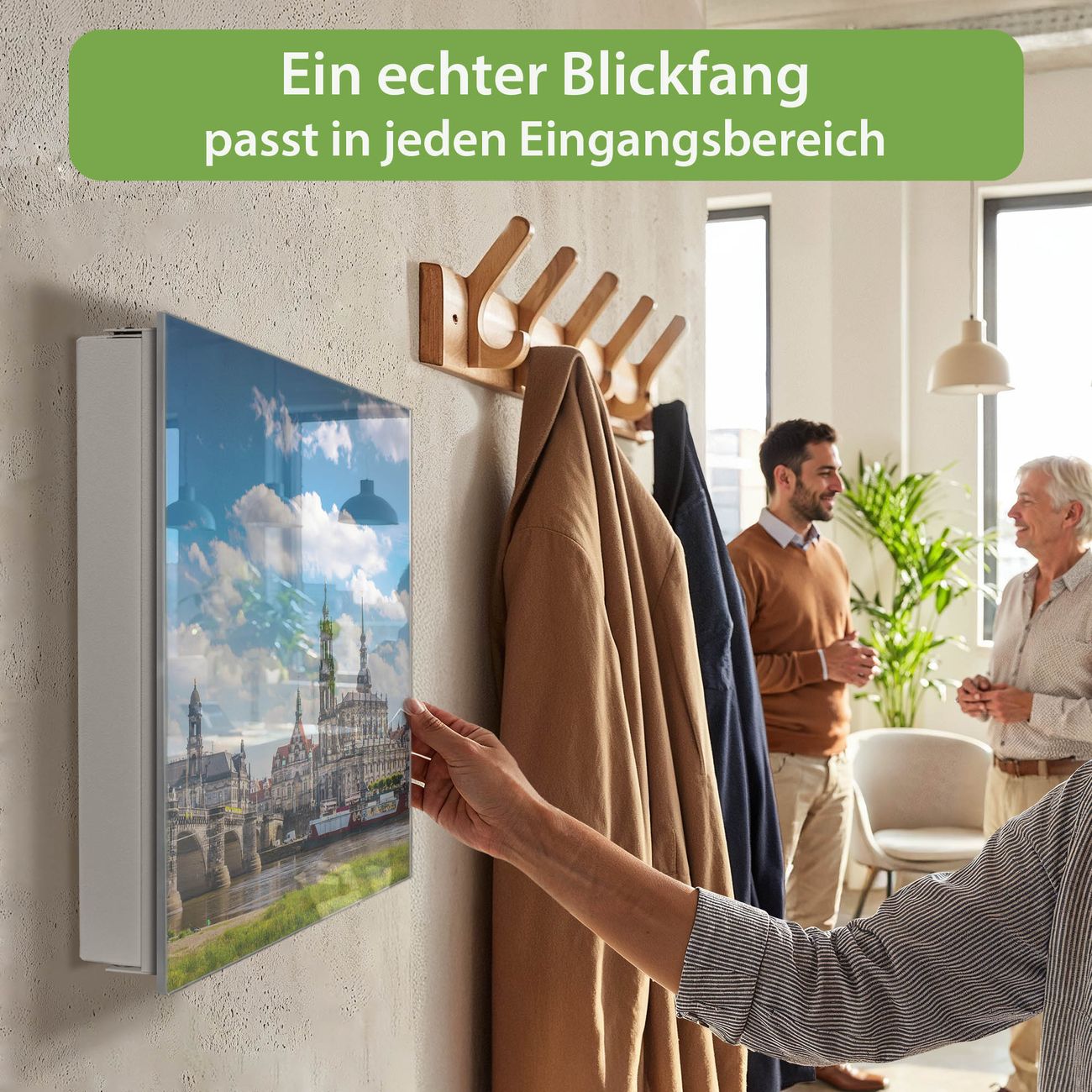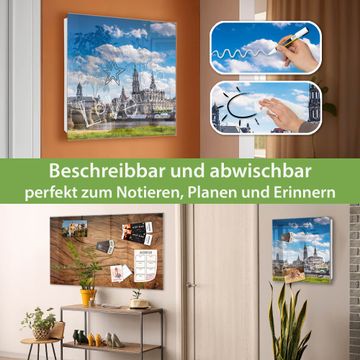 Bringe Ordnung und Eleganz in deinen Eingangsbereich mit dem banjado Schlüsselkasten Motiv Motiv Elbflorenz. Die moderne Schlüsselbox kombiniert funktionales Design mit hochwertiger Verarbeitung und wird so zu einem echten Hingucker in Flur, Büro oder Ferienwohnung. ✅ Stilvolle Schlüsselaufbewahrung mit Glasfront im Motiv Motiv Elbflorenz Der Design-Schlüsselkasten Motiv Motiv Elbflorenz bietet Platz für bis zu 50 Schlüssel, die auf 5 stabilen Reihen mit je 10 Haken übersichtlich verstaut werden. Mit seinen kompakten Maßen von 30 x 30 x 5 cm passt die Schlüsselbox perfekt auch in kleinere Räume. Der weiß lackierte Stahlkorpus mit rechts angeschlagenem Türscharnier harmoniert mit der Glasfront und fügt sich nahtlos in jedes Wohnambiente ein. Ob als Schlüsselorganizer für Zuhause oder als praktische Lösung für Büros, Praxen und Gewerbe, der banjado Schlüsselkasten sorgt für Ordnung und Übersicht. Dank der magnetischen, mit Kreidestiften beschreibbaren Glasfront kannst du Notizen anheften oder Termine direkt auf der Oberfläche festhalten. Die Schlüsselbox Motiv Motiv Elbflorenz zur Wandmontage wird inklusive Befestigungsmaterial geliefert und ist schnell angebracht. So hast du deine Schlüssel jederzeit griffbereit und zugleich stilvoll verstaut. Mit diesem banjado Schlüsselkasten Motiv Motiv Elbflorenz kombinierst du praktische Aufbewahrung mit stilvollem Wohndesign. Ob privat oder geschäftlich, die Schlüsselbox sorgt für mehr Ordnung, Übersicht und ein wohnliches Ambiente.Vorteile im Überblick