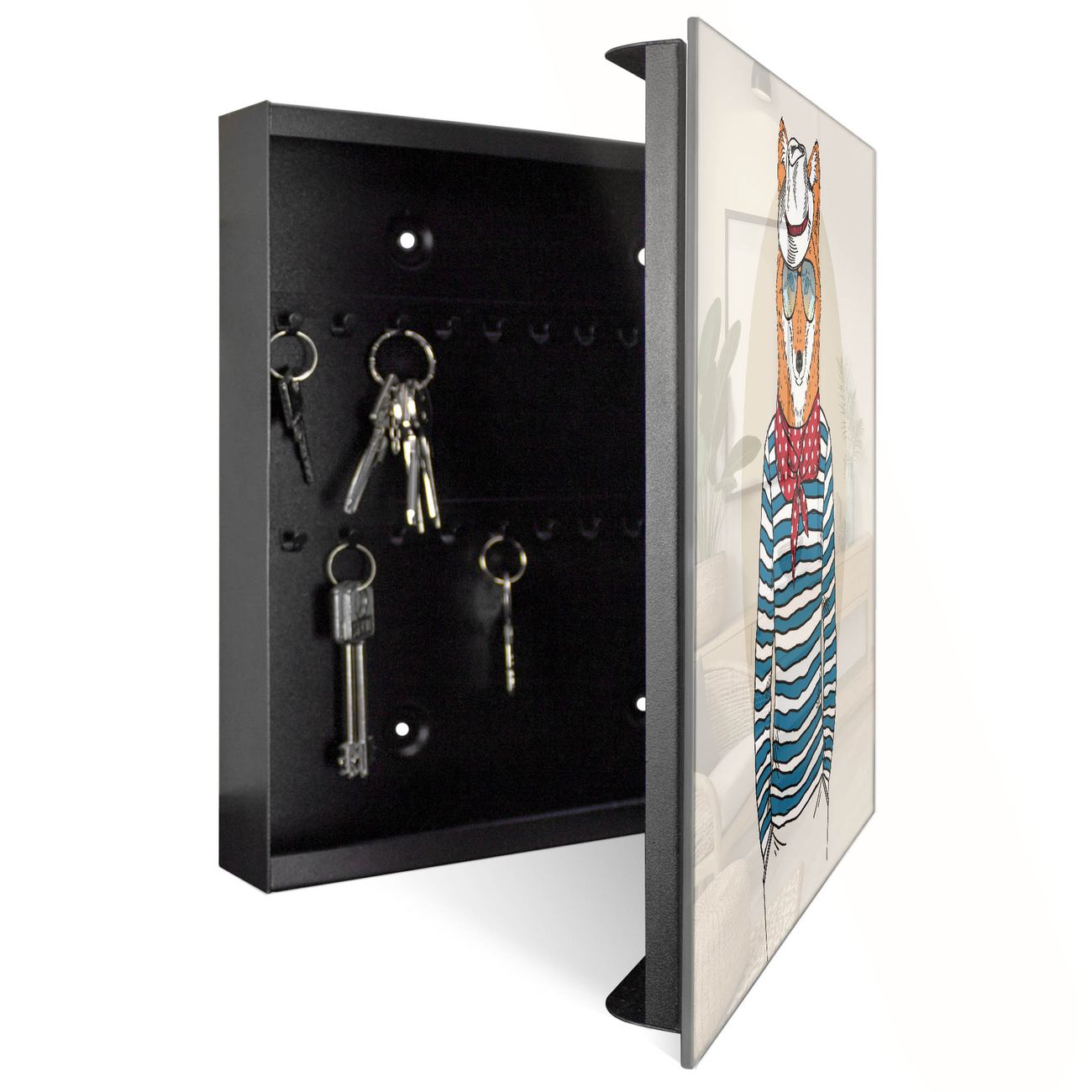 Bringe Ordnung und Eleganz in deinen Eingangsbereich mit dem banjado Schlüsselkasten Motiv Motiv Fancy Fox. Die moderne Schlüsselbox kombiniert funktionales Design mit hochwertiger Verarbeitung und wird so zu einem echten Hingucker in Flur, Büro oder Ferienwohnung. ✅ Stilvolle Schlüsselaufbewahrung mit Glasfront im Motiv Motiv Fancy Fox Der Design-Schlüsselkasten Motiv Motiv Fancy Fox bietet Platz für bis zu 50 Schlüssel, die auf 5 stabilen Reihen mit je 10 Haken übersichtlich verstaut werden. Mit seinen kompakten Maßen von 30 x 30 x 5 cm passt die Schlüsselbox perfekt auch in kleinere Räume. Der schwarz lackierte Stahlkorpus mit rechts angeschlagenem Türscharnier harmoniert mit der Glasfront und fügt sich nahtlos in jedes Wohnambiente ein. Ob als Schlüsselorganizer für Zuhause oder als praktische Lösung für Büros, Praxen und Gewerbe, der banjado Schlüsselkasten sorgt für Ordnung und Übersicht. Dank der magnetischen, mit Kreidestiften beschreibbaren Glasfront kannst du Notizen anheften oder Termine direkt auf der Oberfläche festhalten. Die Schlüsselbox Motiv Motiv Fancy Fox zur Wandmontage wird inklusive Befestigungsmaterial geliefert und ist schnell angebracht. So hast du deine Schlüssel jederzeit griffbereit und zugleich stilvoll verstaut. Mit diesem banjado Schlüsselkasten Motiv Motiv Fancy Fox kombinierst du praktische Aufbewahrung mit stilvollem Wohndesign. Ob privat oder geschäftlich, die Schlüsselbox sorgt für mehr Ordnung, Übersicht und ein wohnliches Ambiente.Vorteile im Überblick