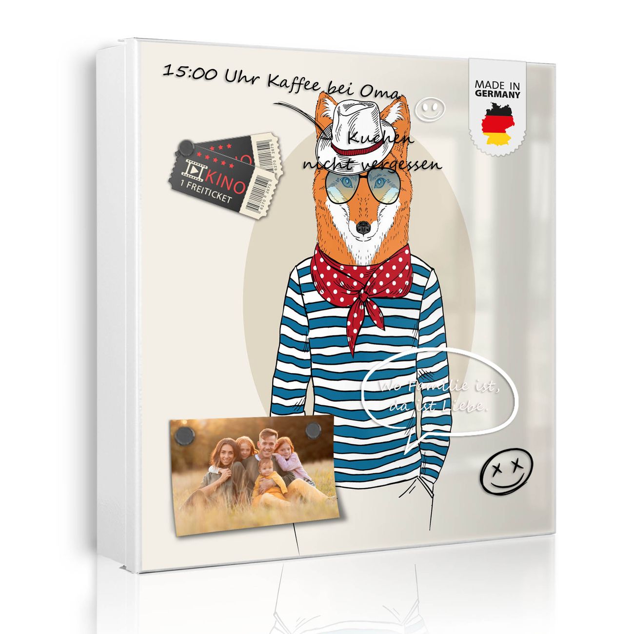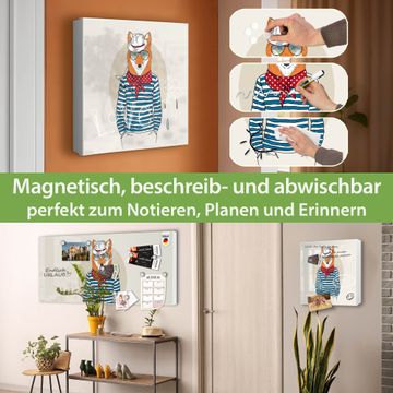 Bringe Ordnung und Eleganz in deinen Eingangsbereich mit dem banjado Schlüsselkasten Motiv Motiv Fancy Fox. Die moderne Schlüsselbox kombiniert funktionales Design mit hochwertiger Verarbeitung und wird so zu einem echten Hingucker in Flur, Büro oder Ferienwohnung. ✅ Stilvolle Schlüsselaufbewahrung mit Motiv Motiv Fancy Fox Der Design-Schlüsselkasten Motiv Motiv Fancy Fox bietet Platz für bis zu 32 Schlüssel, die auf 4 stabilen Reihen mit je 8 Haken übersichtlich verstaut werden. Mit seinen kompakten Maßen von 30 x 30 x 5 cm passt die Schlüsselbox perfekt auch in kleinere Räume. Der weiß lackierte Stahlkorpus mit links angeschlagenem Türscharnier harmoniert mit gedruckten Folie auf der Front und fügt sich nahtlos in jedes Wohnambiente ein. Ob als Schlüsselorganizer für Zuhause oder als praktische Lösung für Büros, Praxen und Gewerbe, der banjado Schlüsselkasten sorgt für Ordnung und Übersicht. Dank der magnetischen, mit Kreidestiften beschreibbaren Folie auf der Front kannst du Notizen anheften oder Termine direkt auf der Oberfläche festhalten. Die Schlüsselbox Motiv Motiv Fancy Fox zur Wandmontage wird inklusive Befestigungsmaterial geliefert und ist schnell angebracht. So hast du deine Schlüssel jederzeit griffbereit und zugleich stilvoll verstaut. Mit diesem banjado Schlüsselkasten Motiv Motiv Fancy Fox kombinierst du praktische Aufbewahrung mit stilvollem Wohndesign. Ob privat oder geschäftlich, die Schlüsselbox sorgt für mehr Ordnung, Übersicht und ein wohnliches Ambiente.Vorteile im Überblick