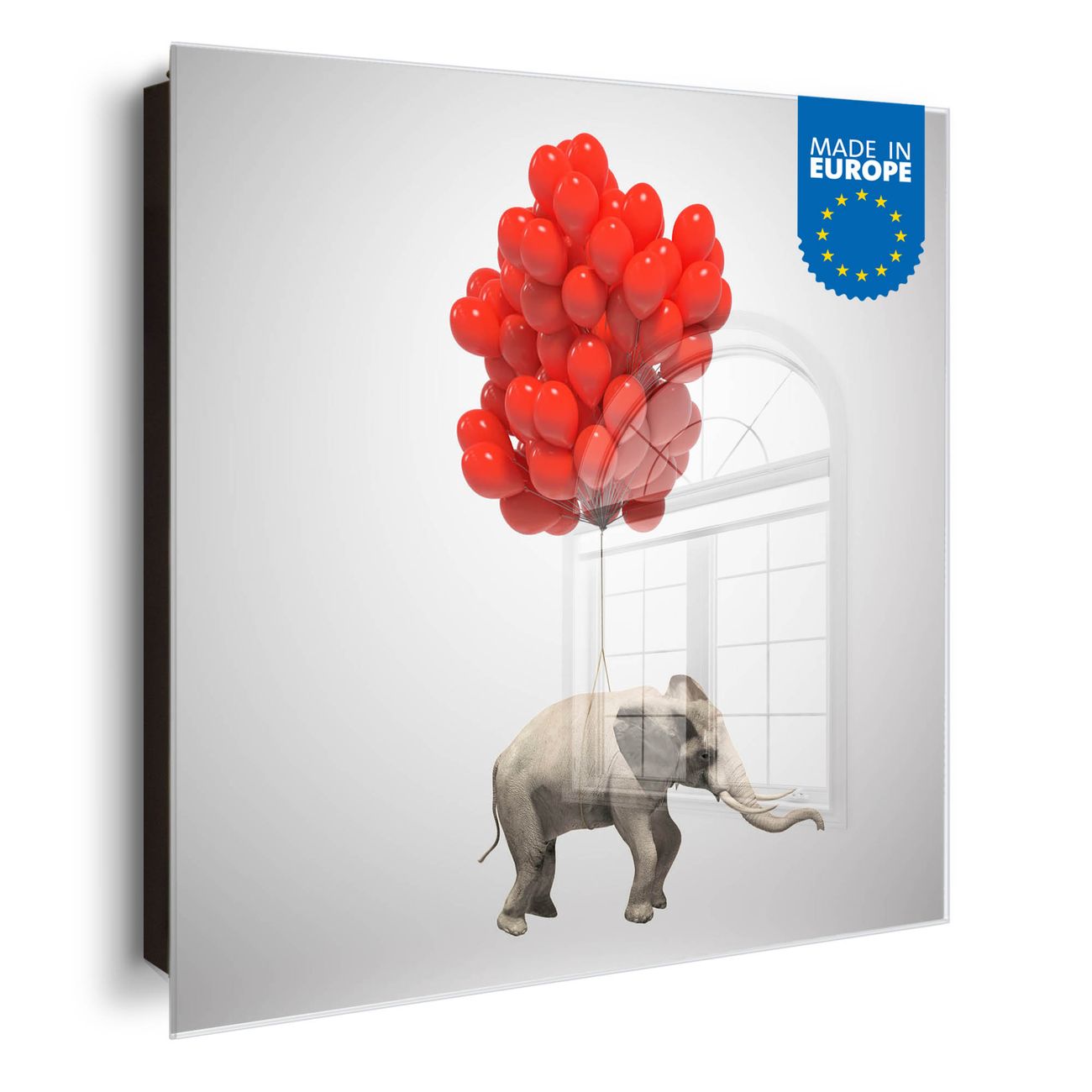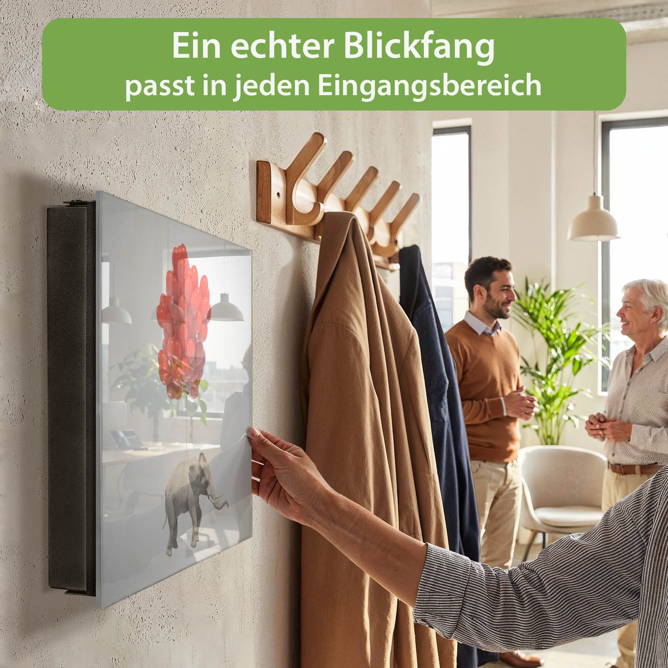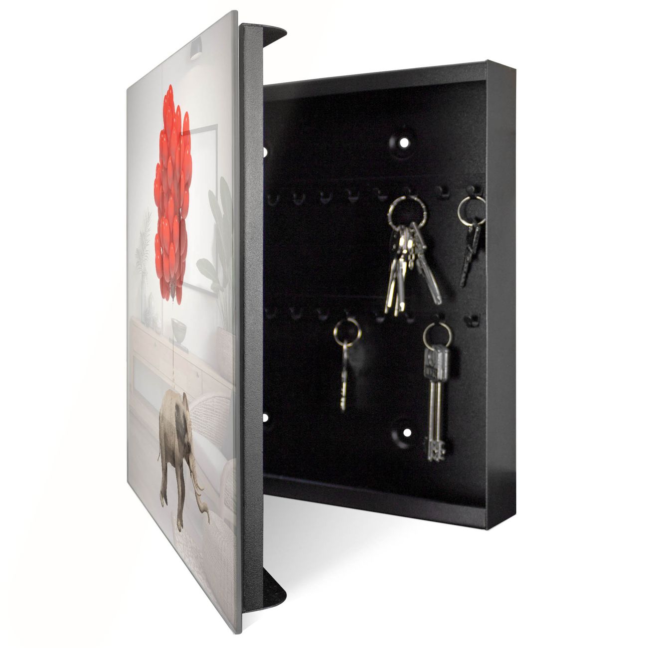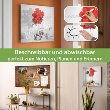 Bringe Ordnung und Eleganz in deinen Eingangsbereich mit dem banjado Schlüsselkasten Motiv Motiv Fliegender Elefant. Die moderne Schlüsselbox kombiniert funktionales Design mit hochwertiger Verarbeitung und wird so zu einem echten Hingucker in Flur, Büro oder Ferienwohnung. ✅ Stilvolle Schlüsselaufbewahrung mit Glasfront im Motiv Motiv Fliegender Elefant Der Design-Schlüsselkasten Motiv Motiv Fliegender Elefant bietet Platz für bis zu 50 Schlüssel, die auf 5 stabilen Reihen mit je 10 Haken übersichtlich verstaut werden. Mit seinen kompakten Maßen von 30 x 30 x 5 cm passt die Schlüsselbox perfekt auch in kleinere Räume. Der schwarz lackierte Stahlkorpus mit rechts angeschlagenem Türscharnier harmoniert mit der Glasfront und fügt sich nahtlos in jedes Wohnambiente ein. Ob als Schlüsselorganizer für Zuhause oder als praktische Lösung für Büros, Praxen und Gewerbe, der banjado Schlüsselkasten sorgt für Ordnung und Übersicht. Dank der magnetischen, mit Kreidestiften beschreibbaren Glasfront kannst du Notizen anheften oder Termine direkt auf der Oberfläche festhalten. Die Schlüsselbox Motiv Motiv Fliegender Elefant zur Wandmontage wird inklusive Befestigungsmaterial geliefert und ist schnell angebracht. So hast du deine Schlüssel jederzeit griffbereit und zugleich stilvoll verstaut. Mit diesem banjado Schlüsselkasten Motiv Motiv Fliegender Elefant kombinierst du praktische Aufbewahrung mit stilvollem Wohndesign. Ob privat oder geschäftlich, die Schlüsselbox sorgt für mehr Ordnung, Übersicht und ein wohnliches Ambiente.Vorteile im Überblick
