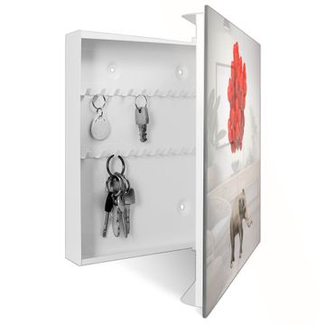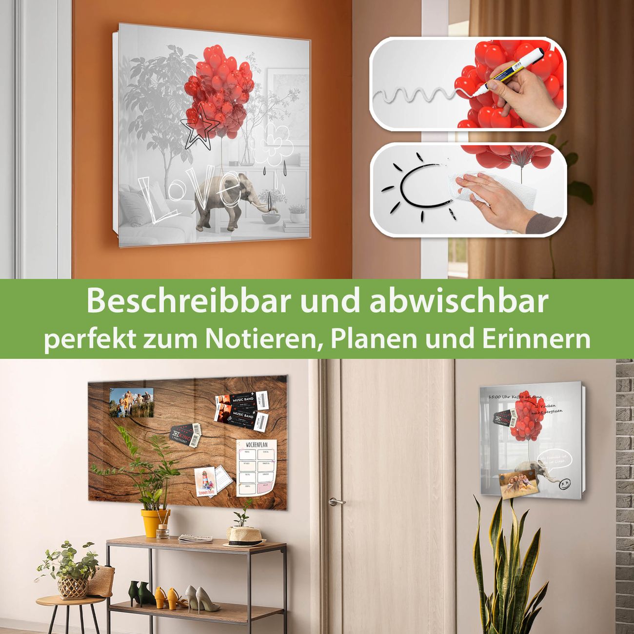 Bringe Ordnung und Eleganz in deinen Eingangsbereich mit dem banjado Schlüsselkasten Motiv Motiv Fliegender Elefant. Die moderne Schlüsselbox kombiniert funktionales Design mit hochwertiger Verarbeitung und wird so zu einem echten Hingucker in Flur, Büro oder Ferienwohnung. ✅ Stilvolle Schlüsselaufbewahrung mit Glasfront im Motiv Motiv Fliegender Elefant Der Design-Schlüsselkasten Motiv Motiv Fliegender Elefant bietet Platz für bis zu 50 Schlüssel, die auf 5 stabilen Reihen mit je 10 Haken übersichtlich verstaut werden. Mit seinen kompakten Maßen von 30 x 30 x 5 cm passt die Schlüsselbox perfekt auch in kleinere Räume. Der weiß lackierte Stahlkorpus mit rechts angeschlagenem Türscharnier harmoniert mit der Glasfront und fügt sich nahtlos in jedes Wohnambiente ein. Ob als Schlüsselorganizer für Zuhause oder als praktische Lösung für Büros, Praxen und Gewerbe, der banjado Schlüsselkasten sorgt für Ordnung und Übersicht. Dank der magnetischen, mit Kreidestiften beschreibbaren Glasfront kannst du Notizen anheften oder Termine direkt auf der Oberfläche festhalten. Die Schlüsselbox Motiv Motiv Fliegender Elefant zur Wandmontage wird inklusive Befestigungsmaterial geliefert und ist schnell angebracht. So hast du deine Schlüssel jederzeit griffbereit und zugleich stilvoll verstaut. Mit diesem banjado Schlüsselkasten Motiv Motiv Fliegender Elefant kombinierst du praktische Aufbewahrung mit stilvollem Wohndesign. Ob privat oder geschäftlich, die Schlüsselbox sorgt für mehr Ordnung, Übersicht und ein wohnliches Ambiente.Vorteile im Überblick