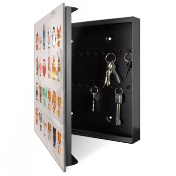 Bringe Ordnung und Eleganz in deinen Eingangsbereich mit dem banjado Schlüsselkasten Motiv Motiv Freunde. Die moderne Schlüsselbox kombiniert funktionales Design mit hochwertiger Verarbeitung und wird so zu einem echten Hingucker in Flur, Büro oder Ferienwohnung. ✅ Stilvolle Schlüsselaufbewahrung mit Glasfront im Motiv Motiv Freunde Der Design-Schlüsselkasten Motiv Motiv Freunde bietet Platz für bis zu 50 Schlüssel, die auf 5 stabilen Reihen mit je 10 Haken übersichtlich verstaut werden. Mit seinen kompakten Maßen von 30 x 30 x 5 cm passt die Schlüsselbox perfekt auch in kleinere Räume. Der schwarz lackierte Stahlkorpus mit rechts angeschlagenem Türscharnier harmoniert mit der Glasfront und fügt sich nahtlos in jedes Wohnambiente ein. Ob als Schlüsselorganizer für Zuhause oder als praktische Lösung für Büros, Praxen und Gewerbe, der banjado Schlüsselkasten sorgt für Ordnung und Übersicht. Dank der magnetischen, mit Kreidestiften beschreibbaren Glasfront kannst du Notizen anheften oder Termine direkt auf der Oberfläche festhalten. Die Schlüsselbox Motiv Motiv Freunde zur Wandmontage wird inklusive Befestigungsmaterial geliefert und ist schnell angebracht. So hast du deine Schlüssel jederzeit griffbereit und zugleich stilvoll verstaut. Mit diesem banjado Schlüsselkasten Motiv Motiv Freunde kombinierst du praktische Aufbewahrung mit stilvollem Wohndesign. Ob privat oder geschäftlich, die Schlüsselbox sorgt für mehr Ordnung, Übersicht und ein wohnliches Ambiente.Vorteile im Überblick
