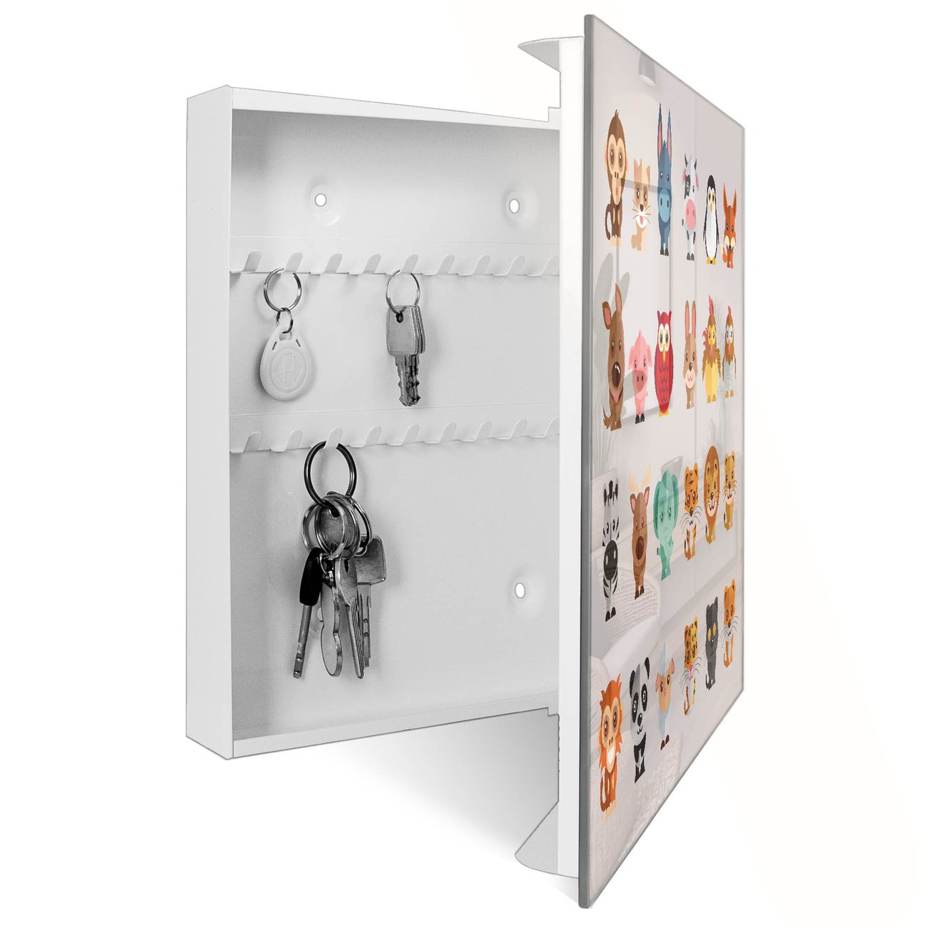 Bringe Ordnung und Eleganz in deinen Eingangsbereich mit dem banjado Schlüsselkasten Motiv Motiv Freunde. Die moderne Schlüsselbox kombiniert funktionales Design mit hochwertiger Verarbeitung und wird so zu einem echten Hingucker in Flur, Büro oder Ferienwohnung. ✅ Stilvolle Schlüsselaufbewahrung mit Glasfront im Motiv Motiv Freunde Der Design-Schlüsselkasten Motiv Motiv Freunde bietet Platz für bis zu 50 Schlüssel, die auf 5 stabilen Reihen mit je 10 Haken übersichtlich verstaut werden. Mit seinen kompakten Maßen von 30 x 30 x 5 cm passt die Schlüsselbox perfekt auch in kleinere Räume. Der weiß lackierte Stahlkorpus mit rechts angeschlagenem Türscharnier harmoniert mit der Glasfront und fügt sich nahtlos in jedes Wohnambiente ein. Ob als Schlüsselorganizer für Zuhause oder als praktische Lösung für Büros, Praxen und Gewerbe, der banjado Schlüsselkasten sorgt für Ordnung und Übersicht. Dank der magnetischen, mit Kreidestiften beschreibbaren Glasfront kannst du Notizen anheften oder Termine direkt auf der Oberfläche festhalten. Die Schlüsselbox Motiv Motiv Freunde zur Wandmontage wird inklusive Befestigungsmaterial geliefert und ist schnell angebracht. So hast du deine Schlüssel jederzeit griffbereit und zugleich stilvoll verstaut. Mit diesem banjado Schlüsselkasten Motiv Motiv Freunde kombinierst du praktische Aufbewahrung mit stilvollem Wohndesign. Ob privat oder geschäftlich, die Schlüsselbox sorgt für mehr Ordnung, Übersicht und ein wohnliches Ambiente.Vorteile im Überblick