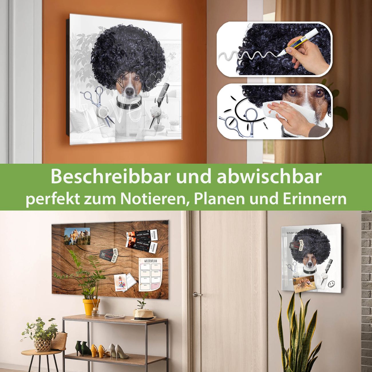 Bringe Ordnung und Eleganz in deinen Eingangsbereich mit dem banjado Schlüsselkasten Motiv Motiv Friseur Jack Russel. Die moderne Schlüsselbox kombiniert funktionales Design mit hochwertiger Verarbeitung und wird so zu einem echten Hingucker in Flur, Büro oder Ferienwohnung. ✅ Stilvolle Schlüsselaufbewahrung mit Glasfront im Motiv Motiv Friseur Jack Russel Der Design-Schlüsselkasten Motiv Motiv Friseur Jack Russel bietet Platz für bis zu 50 Schlüssel, die auf 5 stabilen Reihen mit je 10 Haken übersichtlich verstaut werden. Mit seinen kompakten Maßen von 30 x 30 x 5 cm passt die Schlüsselbox perfekt auch in kleinere Räume. Der schwarz lackierte Stahlkorpus mit rechts angeschlagenem Türscharnier harmoniert mit der Glasfront und fügt sich nahtlos in jedes Wohnambiente ein. Ob als Schlüsselorganizer für Zuhause oder als praktische Lösung für Büros, Praxen und Gewerbe, der banjado Schlüsselkasten sorgt für Ordnung und Übersicht. Dank der magnetischen, mit Kreidestiften beschreibbaren Glasfront kannst du Notizen anheften oder Termine direkt auf der Oberfläche festhalten. Die Schlüsselbox Motiv Motiv Friseur Jack Russel zur Wandmontage wird inklusive Befestigungsmaterial geliefert und ist schnell angebracht. So hast du deine Schlüssel jederzeit griffbereit und zugleich stilvoll verstaut. Mit diesem banjado Schlüsselkasten Motiv Motiv Friseur Jack Russel kombinierst du praktische Aufbewahrung mit stilvollem Wohndesign. Ob privat oder geschäftlich, die Schlüsselbox sorgt für mehr Ordnung, Übersicht und ein wohnliches Ambiente.Vorteile im Überblick