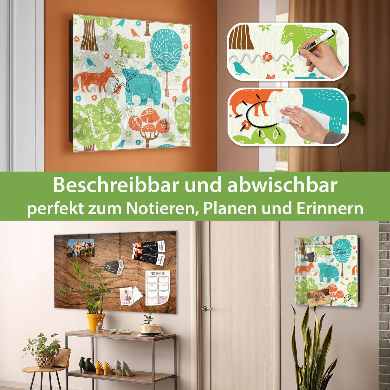 Bringe Ordnung und Eleganz in deinen Eingangsbereich mit dem banjado Schlüsselkasten Motiv Motiv Fuchs Bär Wald. Die moderne Schlüsselbox kombiniert funktionales Design mit hochwertiger Verarbeitung und wird so zu einem echten Hingucker in Flur, Büro oder Ferienwohnung. ✅ Stilvolle Schlüsselaufbewahrung mit Glasfront im Motiv Motiv Fuchs Bär Wald Der Design-Schlüsselkasten Motiv Motiv Fuchs Bär Wald bietet Platz für bis zu 50 Schlüssel, die auf 5 stabilen Reihen mit je 10 Haken übersichtlich verstaut werden. Mit seinen kompakten Maßen von 30 x 30 x 5 cm passt die Schlüsselbox perfekt auch in kleinere Räume. Der schwarz lackierte Stahlkorpus mit rechts angeschlagenem Türscharnier harmoniert mit der Glasfront und fügt sich nahtlos in jedes Wohnambiente ein. Ob als Schlüsselorganizer für Zuhause oder als praktische Lösung für Büros, Praxen und Gewerbe, der banjado Schlüsselkasten sorgt für Ordnung und Übersicht. Dank der magnetischen, mit Kreidestiften beschreibbaren Glasfront kannst du Notizen anheften oder Termine direkt auf der Oberfläche festhalten. Die Schlüsselbox Motiv Motiv Fuchs Bär Wald zur Wandmontage wird inklusive Befestigungsmaterial geliefert und ist schnell angebracht. So hast du deine Schlüssel jederzeit griffbereit und zugleich stilvoll verstaut. Mit diesem banjado Schlüsselkasten Motiv Motiv Fuchs Bär Wald kombinierst du praktische Aufbewahrung mit stilvollem Wohndesign. Ob privat oder geschäftlich, die Schlüsselbox sorgt für mehr Ordnung, Übersicht und ein wohnliches Ambiente.Vorteile im Überblick