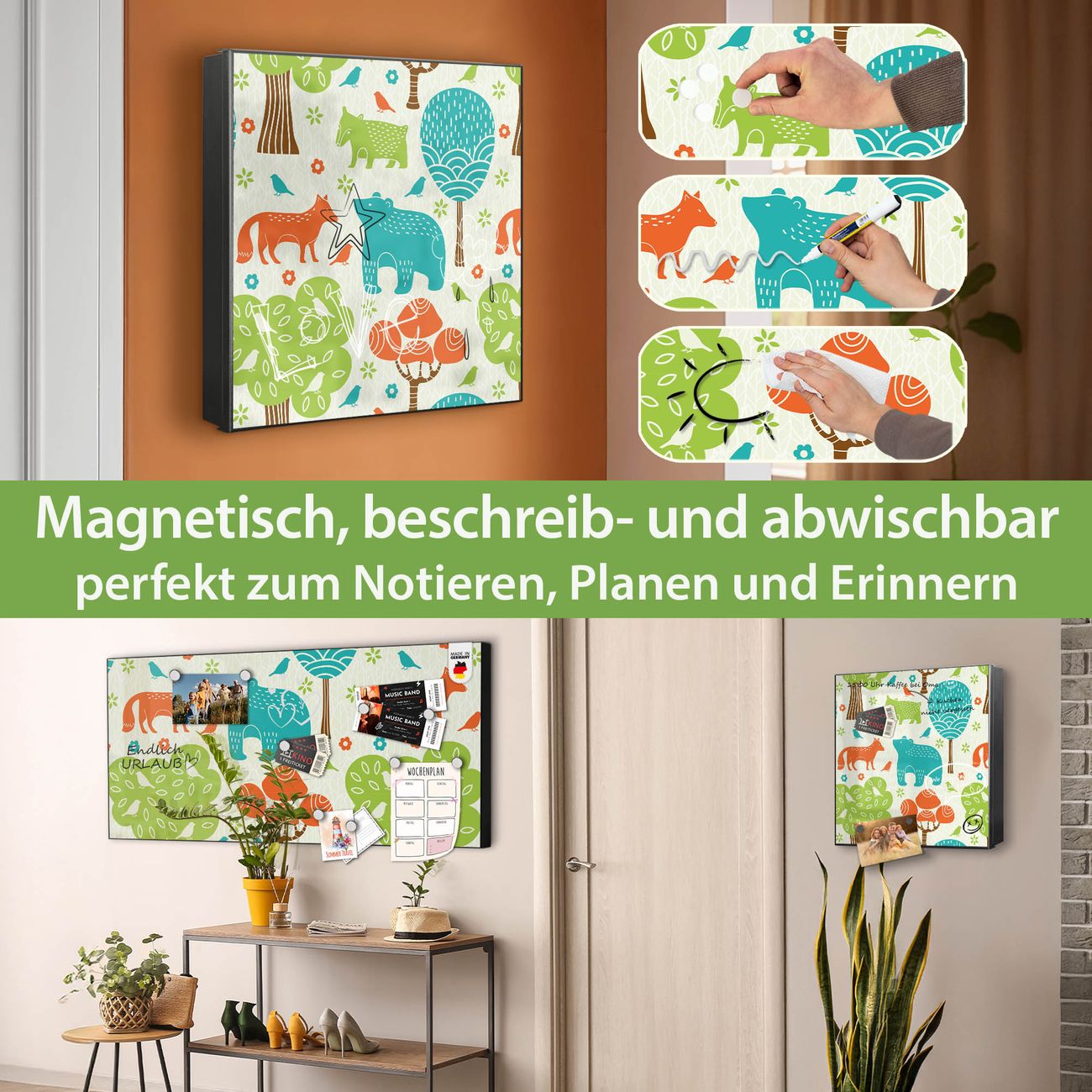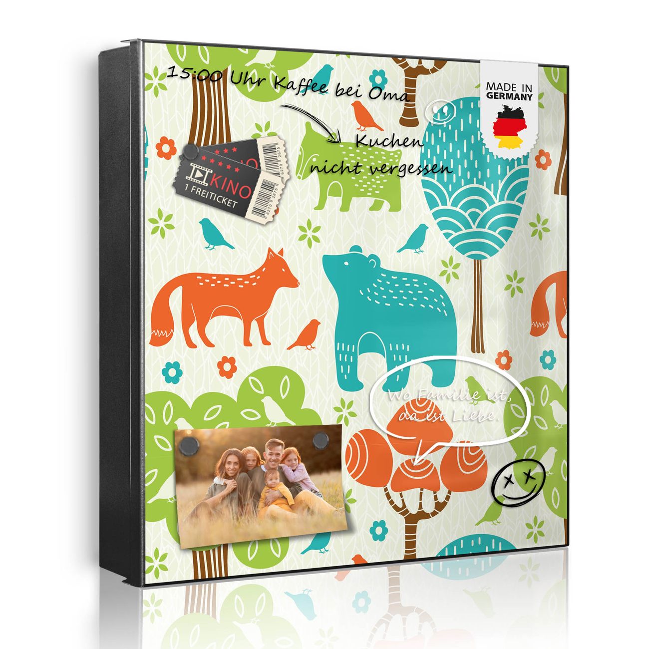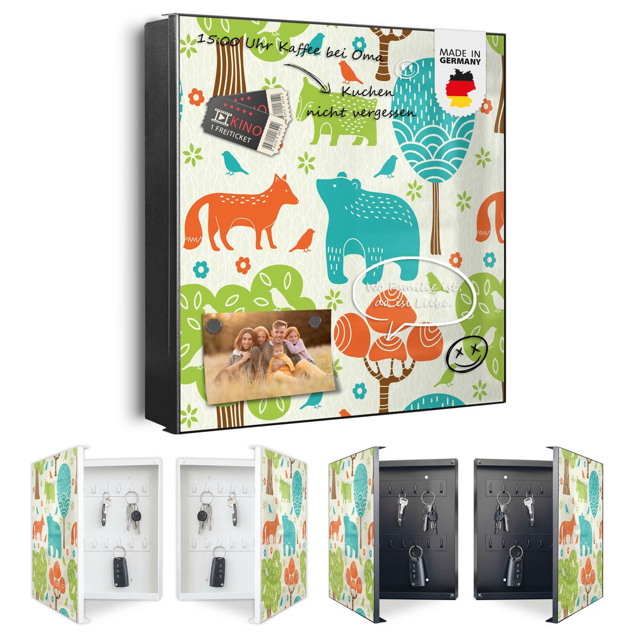 Bringe Ordnung und Eleganz in deinen Eingangsbereich mit dem banjado Schlüsselkasten Motiv Motiv Fuchs Bär Wald. Die moderne Schlüsselbox kombiniert funktionales Design mit hochwertiger Verarbeitung und wird so zu einem echten Hingucker in Flur, Büro oder Ferienwohnung. ✅ Stilvolle Schlüsselaufbewahrung mit Motiv Motiv Fuchs Bär Wald Der Design-Schlüsselkasten Motiv Motiv Fuchs Bär Wald bietet Platz für bis zu 32 Schlüssel, die auf 4 stabilen Reihen mit je 8 Haken übersichtlich verstaut werden. Mit seinen kompakten Maßen von 30 x 30 x 5 cm passt die Schlüsselbox perfekt auch in kleinere Räume. Der schwarz lackierte Stahlkorpus mit links angeschlagenem Türscharnier harmoniert mit gedruckten Folie auf der Front und fügt sich nahtlos in jedes Wohnambiente ein. Ob als Schlüsselorganizer für Zuhause oder als praktische Lösung für Büros, Praxen und Gewerbe, der banjado Schlüsselkasten sorgt für Ordnung und Übersicht. Dank der magnetischen, mit Kreidestiften beschreibbaren Folie auf der Front kannst du Notizen anheften oder Termine direkt auf der Oberfläche festhalten. Die Schlüsselbox Motiv Motiv Fuchs Bär Wald zur Wandmontage wird inklusive Befestigungsmaterial geliefert und ist schnell angebracht. So hast du deine Schlüssel jederzeit griffbereit und zugleich stilvoll verstaut. Mit diesem banjado Schlüsselkasten Motiv Motiv Fuchs Bär Wald kombinierst du praktische Aufbewahrung mit stilvollem Wohndesign. Ob privat oder geschäftlich, die Schlüsselbox sorgt für mehr Ordnung, Übersicht und ein wohnliches Ambiente.Vorteile im Überblick
