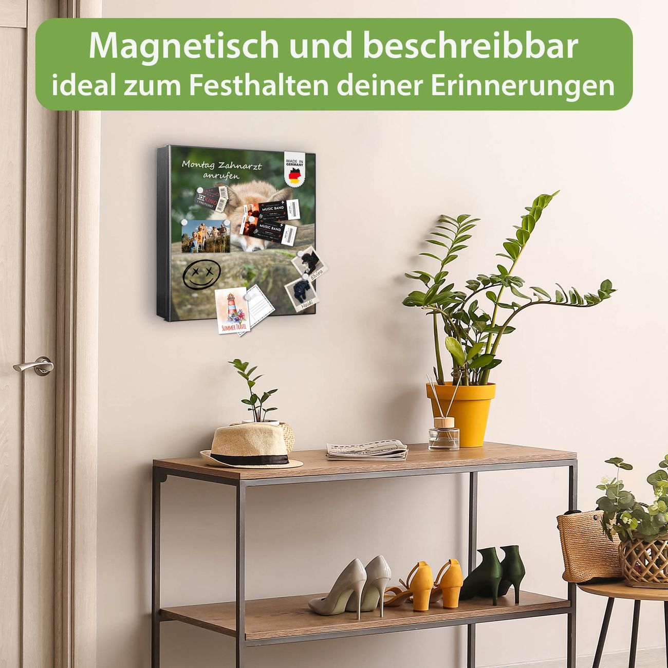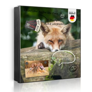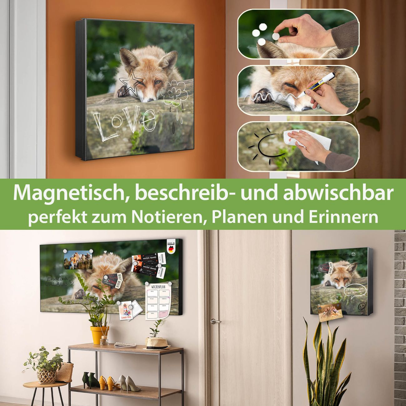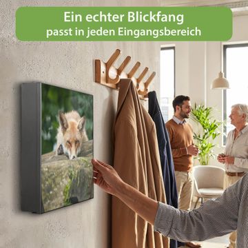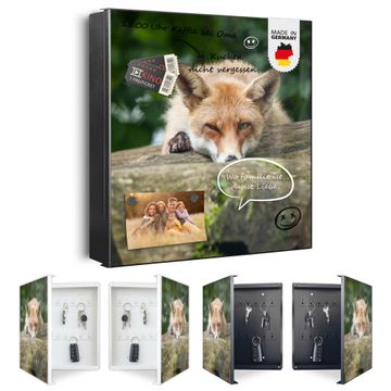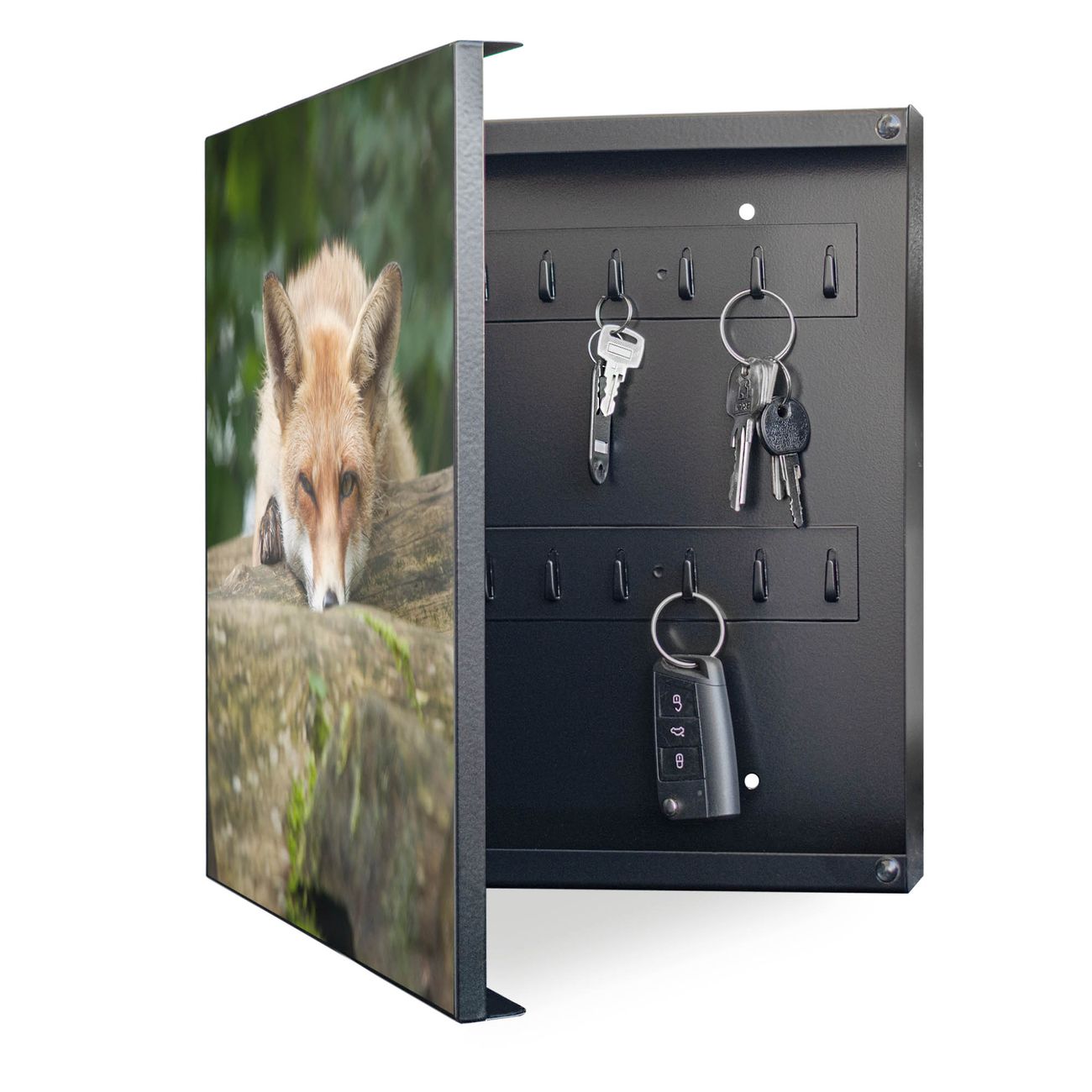 Bringe Ordnung und Eleganz in deinen Eingangsbereich mit dem banjado Schlüsselkasten Motiv Motiv Fuchs Relax. Die moderne Schlüsselbox kombiniert funktionales Design mit hochwertiger Verarbeitung und wird so zu einem echten Hingucker in Flur, Büro oder Ferienwohnung. ✅ Stilvolle Schlüsselaufbewahrung mit Motiv Motiv Fuchs Relax Der Design-Schlüsselkasten Motiv Motiv Fuchs Relax bietet Platz für bis zu 32 Schlüssel, die auf 4 stabilen Reihen mit je 8 Haken übersichtlich verstaut werden. Mit seinen kompakten Maßen von 30 x 30 x 5 cm passt die Schlüsselbox perfekt auch in kleinere Räume. Der schwarz lackierte Stahlkorpus mit links angeschlagenem Türscharnier harmoniert mit gedruckten Folie auf der Front und fügt sich nahtlos in jedes Wohnambiente ein. Ob als Schlüsselorganizer für Zuhause oder als praktische Lösung für Büros, Praxen und Gewerbe, der banjado Schlüsselkasten sorgt für Ordnung und Übersicht. Dank der magnetischen, mit Kreidestiften beschreibbaren Folie auf der Front kannst du Notizen anheften oder Termine direkt auf der Oberfläche festhalten. Die Schlüsselbox Motiv Motiv Fuchs Relax zur Wandmontage wird inklusive Befestigungsmaterial geliefert und ist schnell angebracht. So hast du deine Schlüssel jederzeit griffbereit und zugleich stilvoll verstaut. Mit diesem banjado Schlüsselkasten Motiv Motiv Fuchs Relax kombinierst du praktische Aufbewahrung mit stilvollem Wohndesign. Ob privat oder geschäftlich, die Schlüsselbox sorgt für mehr Ordnung, Übersicht und ein wohnliches Ambiente.Vorteile im Überblick
