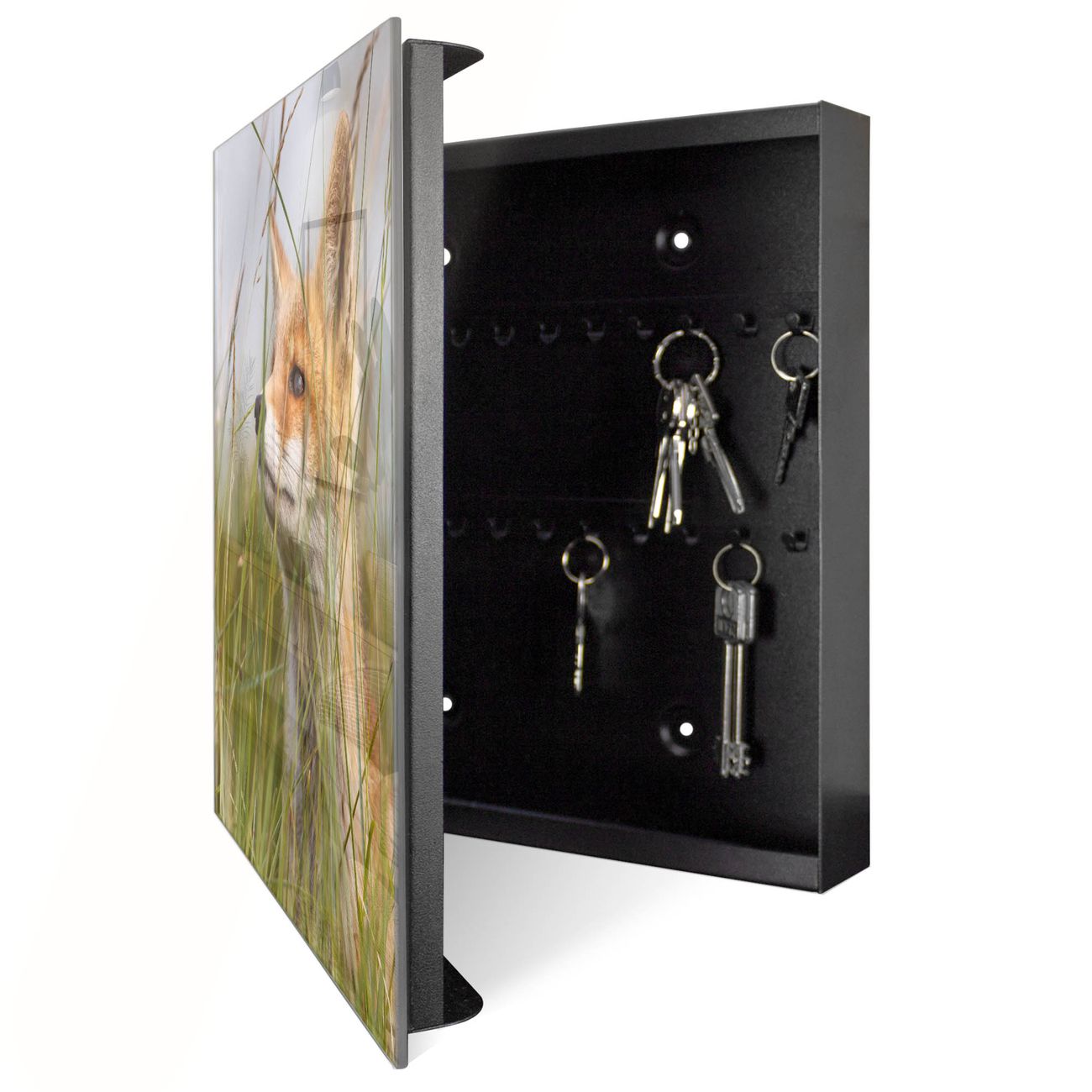 Bringe Ordnung und Eleganz in deinen Eingangsbereich mit dem banjado Schlüsselkasten Motiv Motiv Fuchs. Die moderne Schlüsselbox kombiniert funktionales Design mit hochwertiger Verarbeitung und wird so zu einem echten Hingucker in Flur, Büro oder Ferienwohnung. ✅ Stilvolle Schlüsselaufbewahrung mit Glasfront im Motiv Motiv Fuchs Der Design-Schlüsselkasten Motiv Motiv Fuchs bietet Platz für bis zu 50 Schlüssel, die auf 5 stabilen Reihen mit je 10 Haken übersichtlich verstaut werden. Mit seinen kompakten Maßen von 30 x 30 x 5 cm passt die Schlüsselbox perfekt auch in kleinere Räume. Der schwarz lackierte Stahlkorpus mit rechts angeschlagenem Türscharnier harmoniert mit der Glasfront und fügt sich nahtlos in jedes Wohnambiente ein. Ob als Schlüsselorganizer für Zuhause oder als praktische Lösung für Büros, Praxen und Gewerbe, der banjado Schlüsselkasten sorgt für Ordnung und Übersicht. Dank der magnetischen, mit Kreidestiften beschreibbaren Glasfront kannst du Notizen anheften oder Termine direkt auf der Oberfläche festhalten. Die Schlüsselbox Motiv Motiv Fuchs zur Wandmontage wird inklusive Befestigungsmaterial geliefert und ist schnell angebracht. So hast du deine Schlüssel jederzeit griffbereit und zugleich stilvoll verstaut. Mit diesem banjado Schlüsselkasten Motiv Motiv Fuchs kombinierst du praktische Aufbewahrung mit stilvollem Wohndesign. Ob privat oder geschäftlich, die Schlüsselbox sorgt für mehr Ordnung, Übersicht und ein wohnliches Ambiente.Vorteile im Überblick
