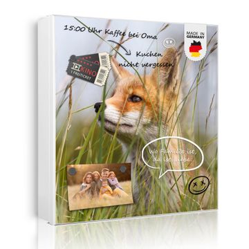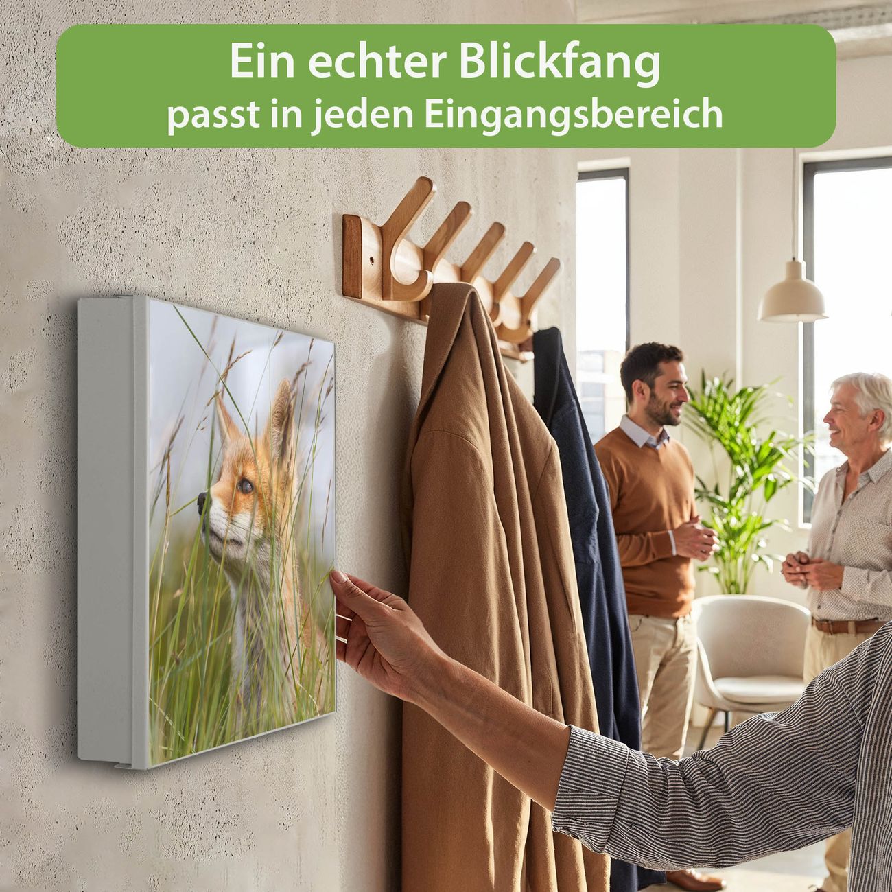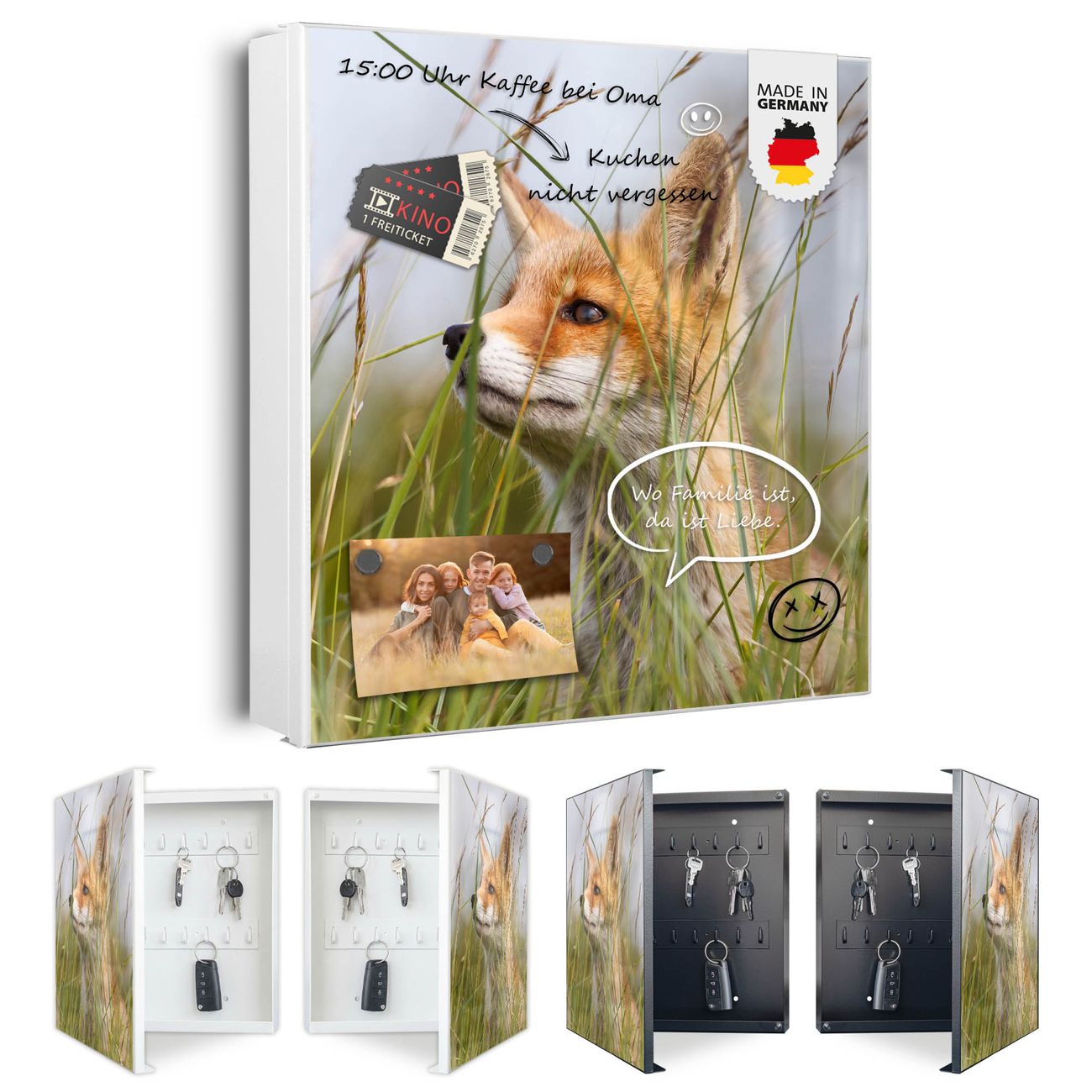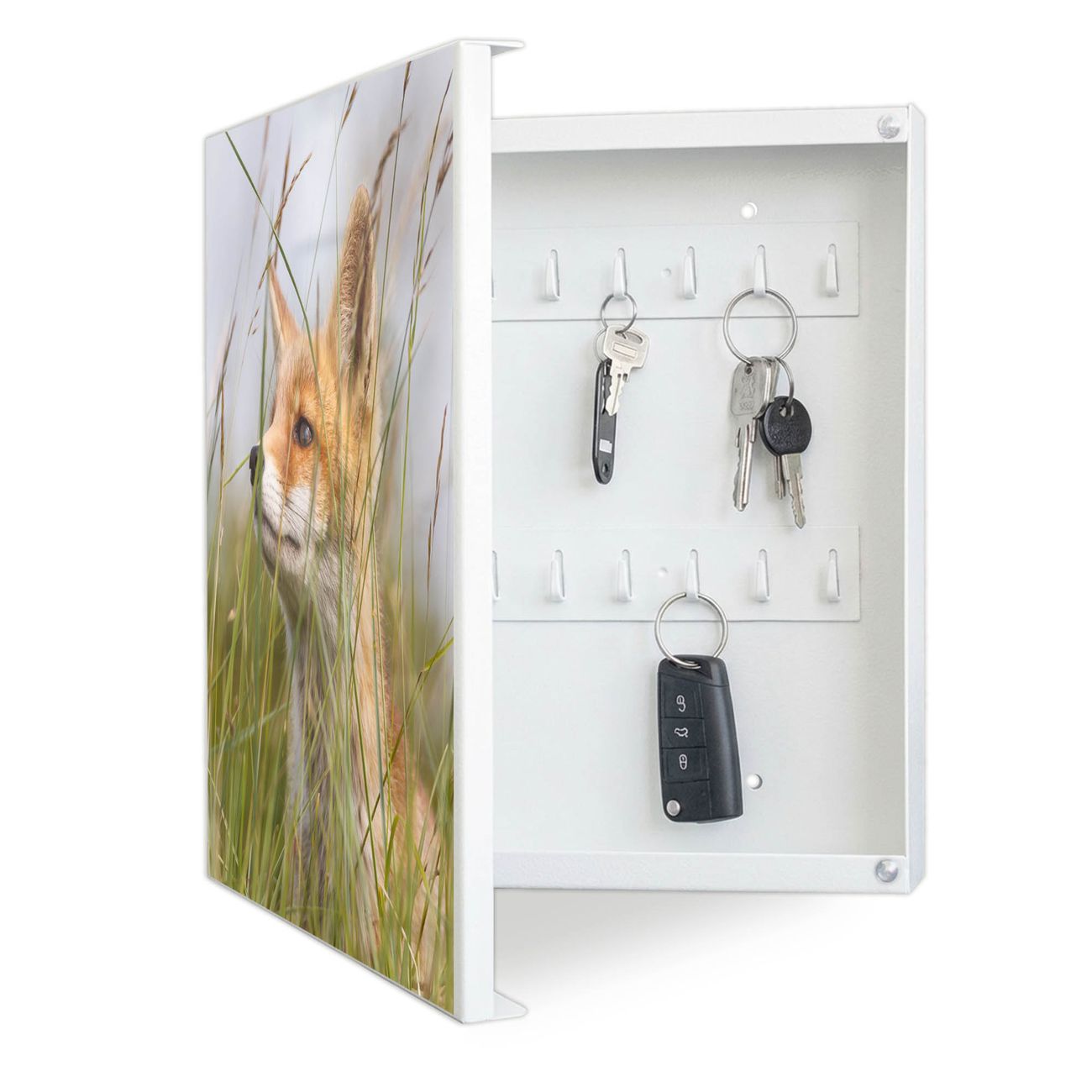 Bringe Ordnung und Eleganz in deinen Eingangsbereich mit dem banjado Schlüsselkasten Motiv Motiv Fuchs. Die moderne Schlüsselbox kombiniert funktionales Design mit hochwertiger Verarbeitung und wird so zu einem echten Hingucker in Flur, Büro oder Ferienwohnung. ✅ Stilvolle Schlüsselaufbewahrung mit Motiv Motiv Fuchs Der Design-Schlüsselkasten Motiv Motiv Fuchs bietet Platz für bis zu 32 Schlüssel, die auf 4 stabilen Reihen mit je 8 Haken übersichtlich verstaut werden. Mit seinen kompakten Maßen von 30 x 30 x 5 cm passt die Schlüsselbox perfekt auch in kleinere Räume. Der weiß lackierte Stahlkorpus mit links angeschlagenem Türscharnier harmoniert mit gedruckten Folie auf der Front und fügt sich nahtlos in jedes Wohnambiente ein. Ob als Schlüsselorganizer für Zuhause oder als praktische Lösung für Büros, Praxen und Gewerbe, der banjado Schlüsselkasten sorgt für Ordnung und Übersicht. Dank der magnetischen, mit Kreidestiften beschreibbaren Folie auf der Front kannst du Notizen anheften oder Termine direkt auf der Oberfläche festhalten. Die Schlüsselbox Motiv Motiv Fuchs zur Wandmontage wird inklusive Befestigungsmaterial geliefert und ist schnell angebracht. So hast du deine Schlüssel jederzeit griffbereit und zugleich stilvoll verstaut. Mit diesem banjado Schlüsselkasten Motiv Motiv Fuchs kombinierst du praktische Aufbewahrung mit stilvollem Wohndesign. Ob privat oder geschäftlich, die Schlüsselbox sorgt für mehr Ordnung, Übersicht und ein wohnliches Ambiente.Vorteile im Überblick