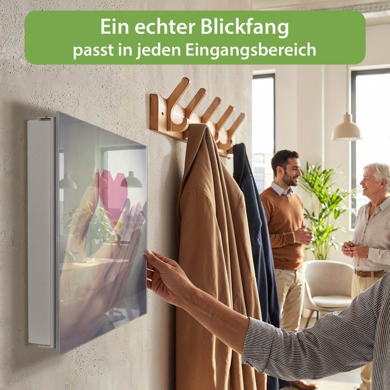 Bringe Ordnung und Eleganz in deinen Eingangsbereich mit dem banjado Schlüsselkasten Motiv Motiv Hand Aufs Herz. Die moderne Schlüsselbox kombiniert funktionales Design mit hochwertiger Verarbeitung und wird so zu einem echten Hingucker in Flur, Büro oder Ferienwohnung. ✅ Stilvolle Schlüsselaufbewahrung mit Glasfront im Motiv Motiv Hand Aufs Herz Der Design-Schlüsselkasten Motiv Motiv Hand Aufs Herz bietet Platz für bis zu 50 Schlüssel, die auf 5 stabilen Reihen mit je 10 Haken übersichtlich verstaut werden. Mit seinen kompakten Maßen von 30 x 30 x 5 cm passt die Schlüsselbox perfekt auch in kleinere Räume. Der weiß lackierte Stahlkorpus mit rechts angeschlagenem Türscharnier harmoniert mit der Glasfront und fügt sich nahtlos in jedes Wohnambiente ein. Ob als Schlüsselorganizer für Zuhause oder als praktische Lösung für Büros, Praxen und Gewerbe, der banjado Schlüsselkasten sorgt für Ordnung und Übersicht. Dank der magnetischen, mit Kreidestiften beschreibbaren Glasfront kannst du Notizen anheften oder Termine direkt auf der Oberfläche festhalten. Die Schlüsselbox Motiv Motiv Hand Aufs Herz zur Wandmontage wird inklusive Befestigungsmaterial geliefert und ist schnell angebracht. So hast du deine Schlüssel jederzeit griffbereit und zugleich stilvoll verstaut. Mit diesem banjado Schlüsselkasten Motiv Motiv Hand Aufs Herz kombinierst du praktische Aufbewahrung mit stilvollem Wohndesign. Ob privat oder geschäftlich, die Schlüsselbox sorgt für mehr Ordnung, Übersicht und ein wohnliches Ambiente.Vorteile im Überblick