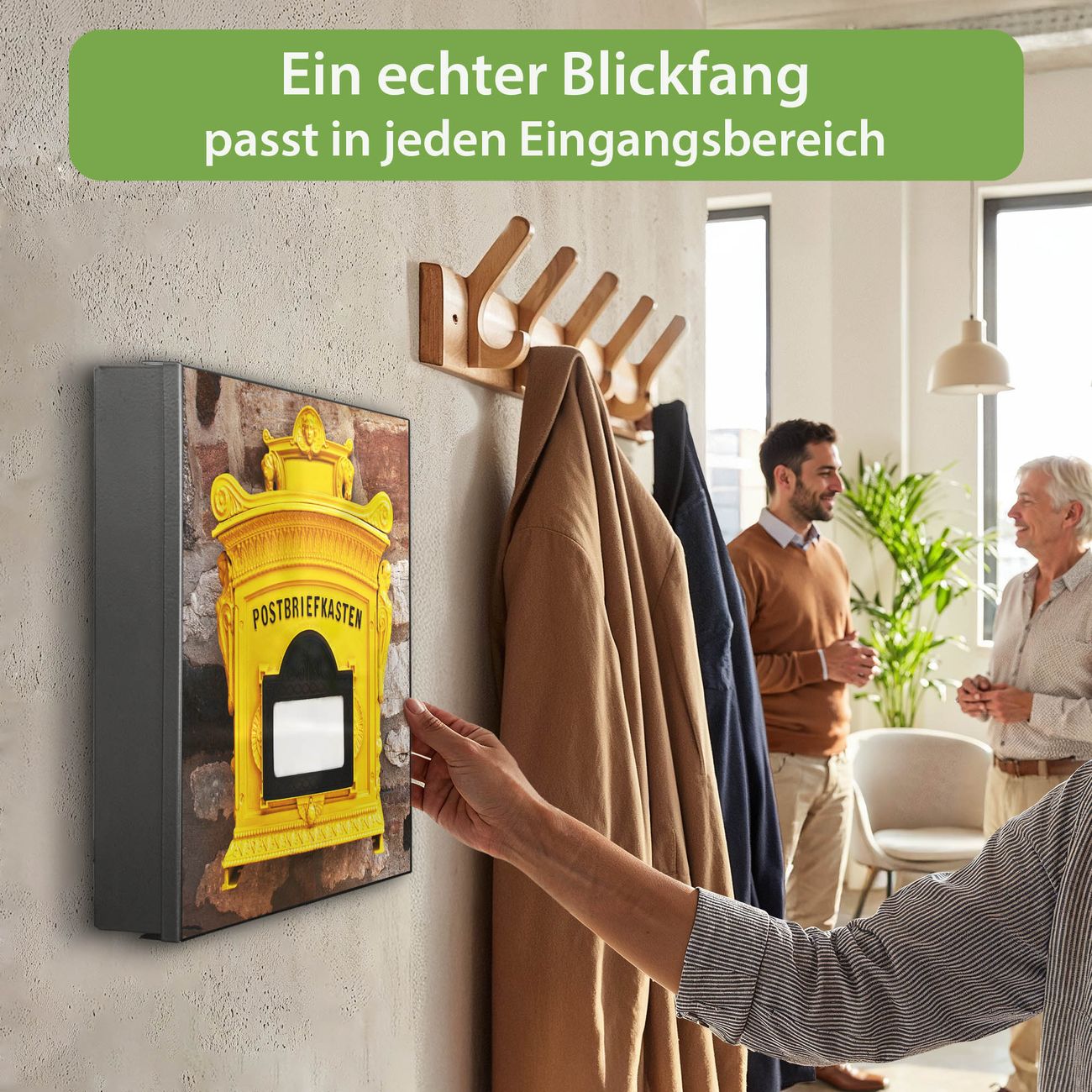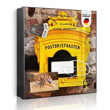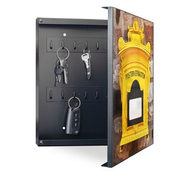 Bringe Ordnung und Eleganz in deinen Eingangsbereich mit dem banjado Schlüsselkasten Motiv Motiv Historischer Postkasten. Die moderne Schlüsselbox kombiniert funktionales Design mit hochwertiger Verarbeitung und wird so zu einem echten Hingucker in Flur, Büro oder Ferienwohnung. ✅ Stilvolle Schlüsselaufbewahrung mit Motiv Motiv Historischer Postkasten Der Design-Schlüsselkasten Motiv Motiv Historischer Postkasten bietet Platz für bis zu 32 Schlüssel, die auf 4 stabilen Reihen mit je 8 Haken übersichtlich verstaut werden. Mit seinen kompakten Maßen von 30 x 30 x 5 cm passt die Schlüsselbox perfekt auch in kleinere Räume. Der schwarz lackierte Stahlkorpus mit rechts angeschlagenem Türscharnier harmoniert mit gedruckten Folie auf der Front und fügt sich nahtlos in jedes Wohnambiente ein. Ob als Schlüsselorganizer für Zuhause oder als praktische Lösung für Büros, Praxen und Gewerbe, der banjado Schlüsselkasten sorgt für Ordnung und Übersicht. Dank der magnetischen, mit Kreidestiften beschreibbaren Folie auf der Front kannst du Notizen anheften oder Termine direkt auf der Oberfläche festhalten. Die Schlüsselbox Motiv Motiv Historischer Postkasten zur Wandmontage wird inklusive Befestigungsmaterial geliefert und ist schnell angebracht. So hast du deine Schlüssel jederzeit griffbereit und zugleich stilvoll verstaut. Mit diesem banjado Schlüsselkasten Motiv Motiv Historischer Postkasten kombinierst du praktische Aufbewahrung mit stilvollem Wohndesign. Ob privat oder geschäftlich, die Schlüsselbox sorgt für mehr Ordnung, Übersicht und ein wohnliches Ambiente.Vorteile im Überblick