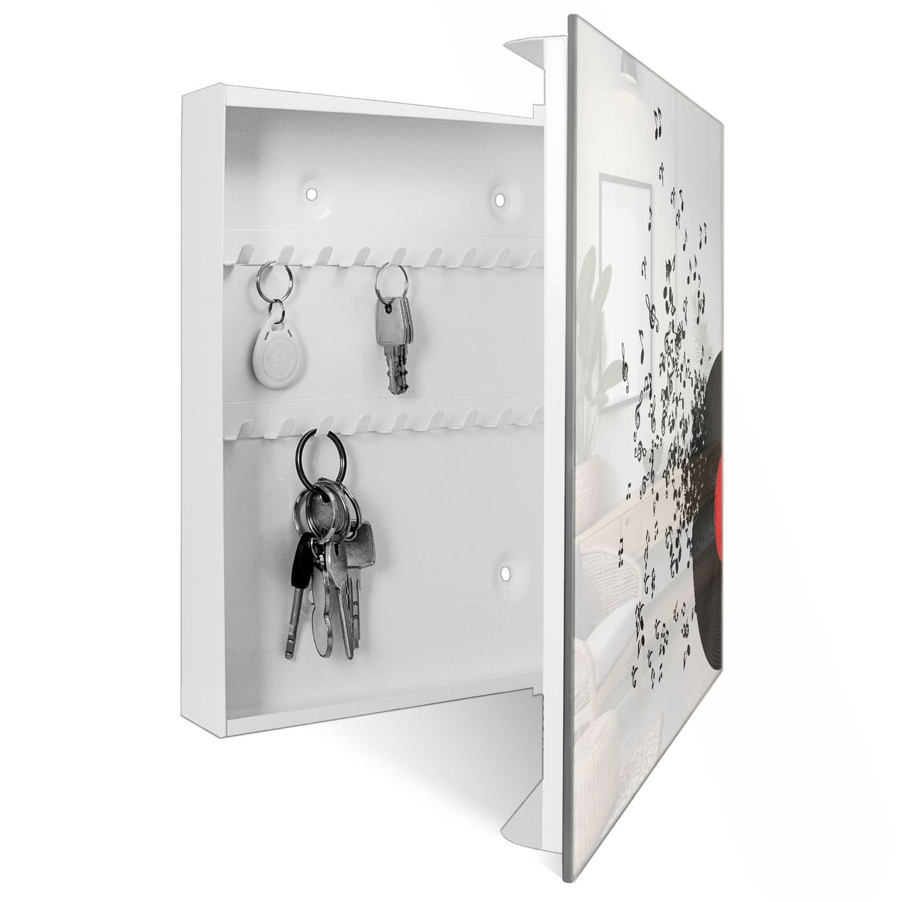 Bringe Ordnung und Eleganz in deinen Eingangsbereich mit dem banjado Schlüsselkasten Motiv Motiv Juke Box. Die moderne Schlüsselbox kombiniert funktionales Design mit hochwertiger Verarbeitung und wird so zu einem echten Hingucker in Flur, Büro oder Ferienwohnung. ✅ Stilvolle Schlüsselaufbewahrung mit Glasfront im Motiv Motiv Juke Box Der Design-Schlüsselkasten Motiv Motiv Juke Box bietet Platz für bis zu 50 Schlüssel, die auf 5 stabilen Reihen mit je 10 Haken übersichtlich verstaut werden. Mit seinen kompakten Maßen von 30 x 30 x 5 cm passt die Schlüsselbox perfekt auch in kleinere Räume. Der weiß lackierte Stahlkorpus mit rechts angeschlagenem Türscharnier harmoniert mit der Glasfront und fügt sich nahtlos in jedes Wohnambiente ein. Ob als Schlüsselorganizer für Zuhause oder als praktische Lösung für Büros, Praxen und Gewerbe, der banjado Schlüsselkasten sorgt für Ordnung und Übersicht. Dank der magnetischen, mit Kreidestiften beschreibbaren Glasfront kannst du Notizen anheften oder Termine direkt auf der Oberfläche festhalten. Die Schlüsselbox Motiv Motiv Juke Box zur Wandmontage wird inklusive Befestigungsmaterial geliefert und ist schnell angebracht. So hast du deine Schlüssel jederzeit griffbereit und zugleich stilvoll verstaut. Mit diesem banjado Schlüsselkasten Motiv Motiv Juke Box kombinierst du praktische Aufbewahrung mit stilvollem Wohndesign. Ob privat oder geschäftlich, die Schlüsselbox sorgt für mehr Ordnung, Übersicht und ein wohnliches Ambiente.Vorteile im Überblick