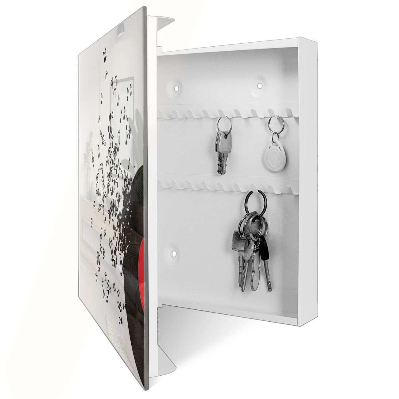 Bringe Ordnung und Eleganz in deinen Eingangsbereich mit dem banjado Schlüsselkasten Motiv Motiv Juke Box. Die moderne Schlüsselbox kombiniert funktionales Design mit hochwertiger Verarbeitung und wird so zu einem echten Hingucker in Flur, Büro oder Ferienwohnung. ✅ Stilvolle Schlüsselaufbewahrung mit Glasfront im Motiv Motiv Juke Box Der Design-Schlüsselkasten Motiv Motiv Juke Box bietet Platz für bis zu 50 Schlüssel, die auf 5 stabilen Reihen mit je 10 Haken übersichtlich verstaut werden. Mit seinen kompakten Maßen von 30 x 30 x 5 cm passt die Schlüsselbox perfekt auch in kleinere Räume. Der weiß lackierte Stahlkorpus mit rechts angeschlagenem Türscharnier harmoniert mit der Glasfront und fügt sich nahtlos in jedes Wohnambiente ein. Ob als Schlüsselorganizer für Zuhause oder als praktische Lösung für Büros, Praxen und Gewerbe, der banjado Schlüsselkasten sorgt für Ordnung und Übersicht. Dank der magnetischen, mit Kreidestiften beschreibbaren Glasfront kannst du Notizen anheften oder Termine direkt auf der Oberfläche festhalten. Die Schlüsselbox Motiv Motiv Juke Box zur Wandmontage wird inklusive Befestigungsmaterial geliefert und ist schnell angebracht. So hast du deine Schlüssel jederzeit griffbereit und zugleich stilvoll verstaut. Mit diesem banjado Schlüsselkasten Motiv Motiv Juke Box kombinierst du praktische Aufbewahrung mit stilvollem Wohndesign. Ob privat oder geschäftlich, die Schlüsselbox sorgt für mehr Ordnung, Übersicht und ein wohnliches Ambiente.Vorteile im Überblick