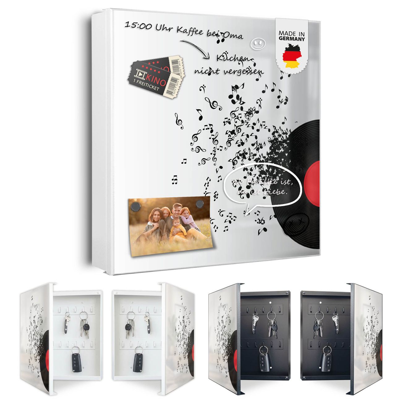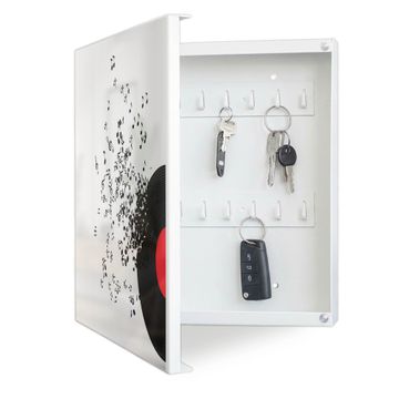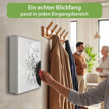 Bringe Ordnung und Eleganz in deinen Eingangsbereich mit dem banjado Schlüsselkasten Motiv Motiv Juke Box. Die moderne Schlüsselbox kombiniert funktionales Design mit hochwertiger Verarbeitung und wird so zu einem echten Hingucker in Flur, Büro oder Ferienwohnung. ✅ Stilvolle Schlüsselaufbewahrung mit Motiv Motiv Juke Box Der Design-Schlüsselkasten Motiv Motiv Juke Box bietet Platz für bis zu 32 Schlüssel, die auf 4 stabilen Reihen mit je 8 Haken übersichtlich verstaut werden. Mit seinen kompakten Maßen von 30 x 30 x 5 cm passt die Schlüsselbox perfekt auch in kleinere Räume. Der weiß lackierte Stahlkorpus mit links angeschlagenem Türscharnier harmoniert mit gedruckten Folie auf der Front und fügt sich nahtlos in jedes Wohnambiente ein. Ob als Schlüsselorganizer für Zuhause oder als praktische Lösung für Büros, Praxen und Gewerbe, der banjado Schlüsselkasten sorgt für Ordnung und Übersicht. Dank der magnetischen, mit Kreidestiften beschreibbaren Folie auf der Front kannst du Notizen anheften oder Termine direkt auf der Oberfläche festhalten. Die Schlüsselbox Motiv Motiv Juke Box zur Wandmontage wird inklusive Befestigungsmaterial geliefert und ist schnell angebracht. So hast du deine Schlüssel jederzeit griffbereit und zugleich stilvoll verstaut. Mit diesem banjado Schlüsselkasten Motiv Motiv Juke Box kombinierst du praktische Aufbewahrung mit stilvollem Wohndesign. Ob privat oder geschäftlich, die Schlüsselbox sorgt für mehr Ordnung, Übersicht und ein wohnliches Ambiente.Vorteile im Überblick