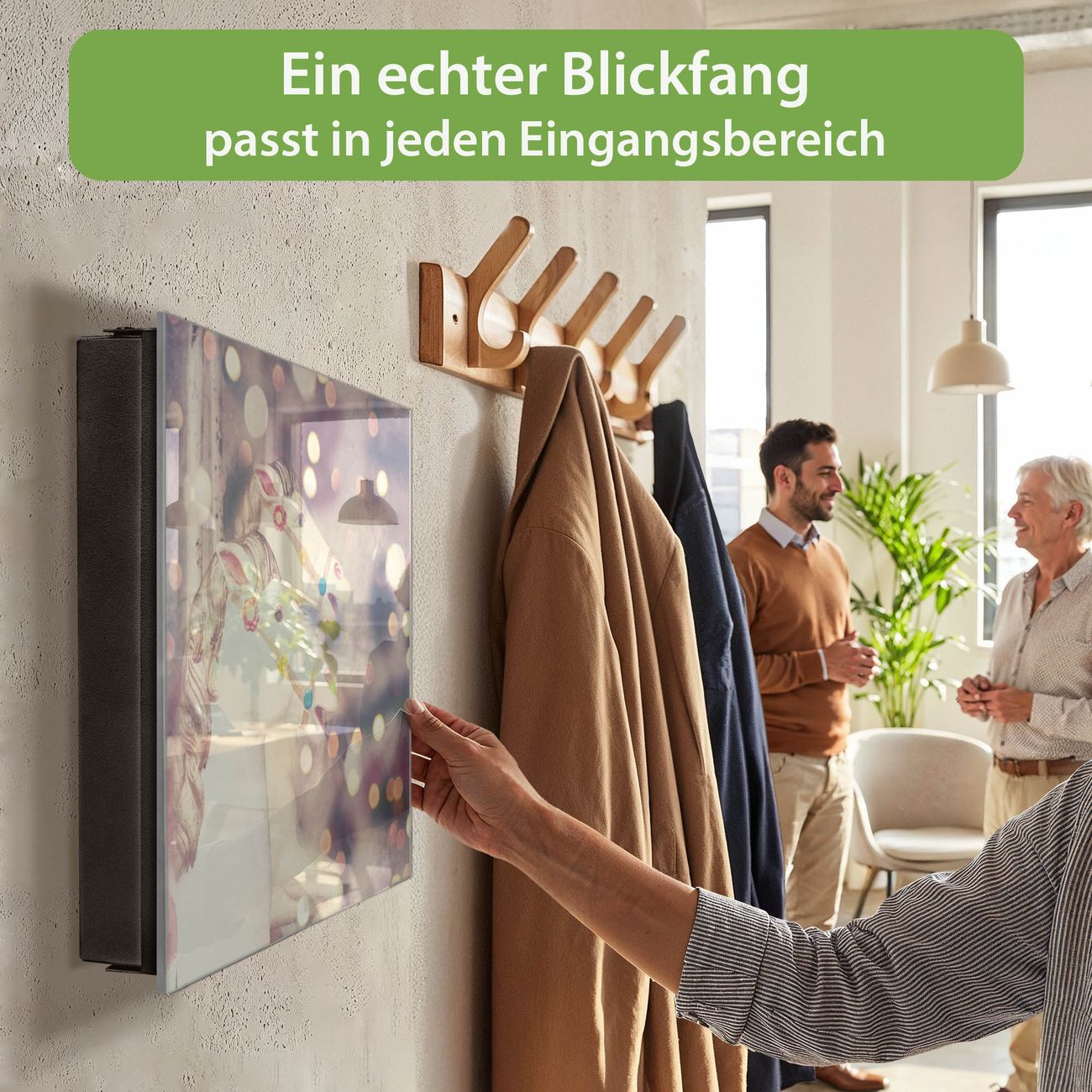 Bringe Ordnung und Eleganz in deinen Eingangsbereich mit dem banjado Schlüsselkasten Motiv Motiv Kinderkarussell. Die moderne Schlüsselbox kombiniert funktionales Design mit hochwertiger Verarbeitung und wird so zu einem echten Hingucker in Flur, Büro oder Ferienwohnung. ✅ Stilvolle Schlüsselaufbewahrung mit Glasfront im Motiv Motiv Kinderkarussell Der Design-Schlüsselkasten Motiv Motiv Kinderkarussell bietet Platz für bis zu 50 Schlüssel, die auf 5 stabilen Reihen mit je 10 Haken übersichtlich verstaut werden. Mit seinen kompakten Maßen von 30 x 30 x 5 cm passt die Schlüsselbox perfekt auch in kleinere Räume. Der schwarz lackierte Stahlkorpus mit rechts angeschlagenem Türscharnier harmoniert mit der Glasfront und fügt sich nahtlos in jedes Wohnambiente ein. Ob als Schlüsselorganizer für Zuhause oder als praktische Lösung für Büros, Praxen und Gewerbe, der banjado Schlüsselkasten sorgt für Ordnung und Übersicht. Dank der magnetischen, mit Kreidestiften beschreibbaren Glasfront kannst du Notizen anheften oder Termine direkt auf der Oberfläche festhalten. Die Schlüsselbox Motiv Motiv Kinderkarussell zur Wandmontage wird inklusive Befestigungsmaterial geliefert und ist schnell angebracht. So hast du deine Schlüssel jederzeit griffbereit und zugleich stilvoll verstaut. Mit diesem banjado Schlüsselkasten Motiv Motiv Kinderkarussell kombinierst du praktische Aufbewahrung mit stilvollem Wohndesign. Ob privat oder geschäftlich, die Schlüsselbox sorgt für mehr Ordnung, Übersicht und ein wohnliches Ambiente.Vorteile im Überblick