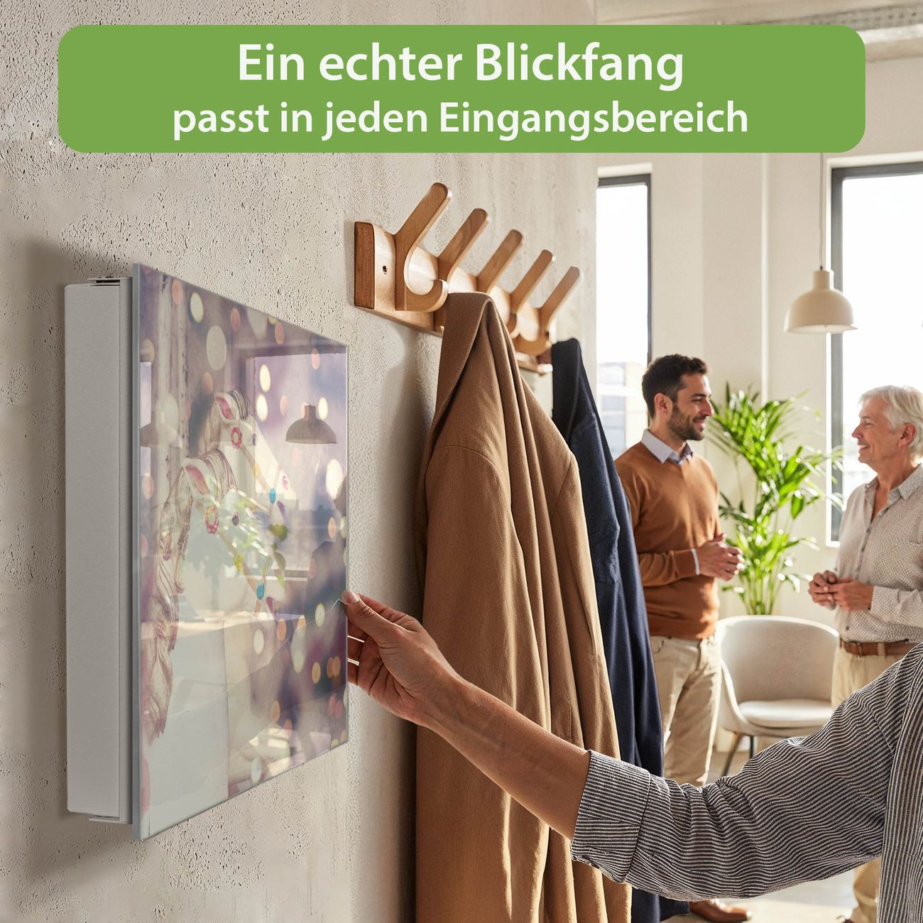 Bringe Ordnung und Eleganz in deinen Eingangsbereich mit dem banjado Schlüsselkasten Motiv Motiv Kinderkarussell. Die moderne Schlüsselbox kombiniert funktionales Design mit hochwertiger Verarbeitung und wird so zu einem echten Hingucker in Flur, Büro oder Ferienwohnung. ✅ Stilvolle Schlüsselaufbewahrung mit Glasfront im Motiv Motiv Kinderkarussell Der Design-Schlüsselkasten Motiv Motiv Kinderkarussell bietet Platz für bis zu 50 Schlüssel, die auf 5 stabilen Reihen mit je 10 Haken übersichtlich verstaut werden. Mit seinen kompakten Maßen von 30 x 30 x 5 cm passt die Schlüsselbox perfekt auch in kleinere Räume. Der weiß lackierte Stahlkorpus mit rechts angeschlagenem Türscharnier harmoniert mit der Glasfront und fügt sich nahtlos in jedes Wohnambiente ein. Ob als Schlüsselorganizer für Zuhause oder als praktische Lösung für Büros, Praxen und Gewerbe, der banjado Schlüsselkasten sorgt für Ordnung und Übersicht. Dank der magnetischen, mit Kreidestiften beschreibbaren Glasfront kannst du Notizen anheften oder Termine direkt auf der Oberfläche festhalten. Die Schlüsselbox Motiv Motiv Kinderkarussell zur Wandmontage wird inklusive Befestigungsmaterial geliefert und ist schnell angebracht. So hast du deine Schlüssel jederzeit griffbereit und zugleich stilvoll verstaut. Mit diesem banjado Schlüsselkasten Motiv Motiv Kinderkarussell kombinierst du praktische Aufbewahrung mit stilvollem Wohndesign. Ob privat oder geschäftlich, die Schlüsselbox sorgt für mehr Ordnung, Übersicht und ein wohnliches Ambiente.Vorteile im Überblick
