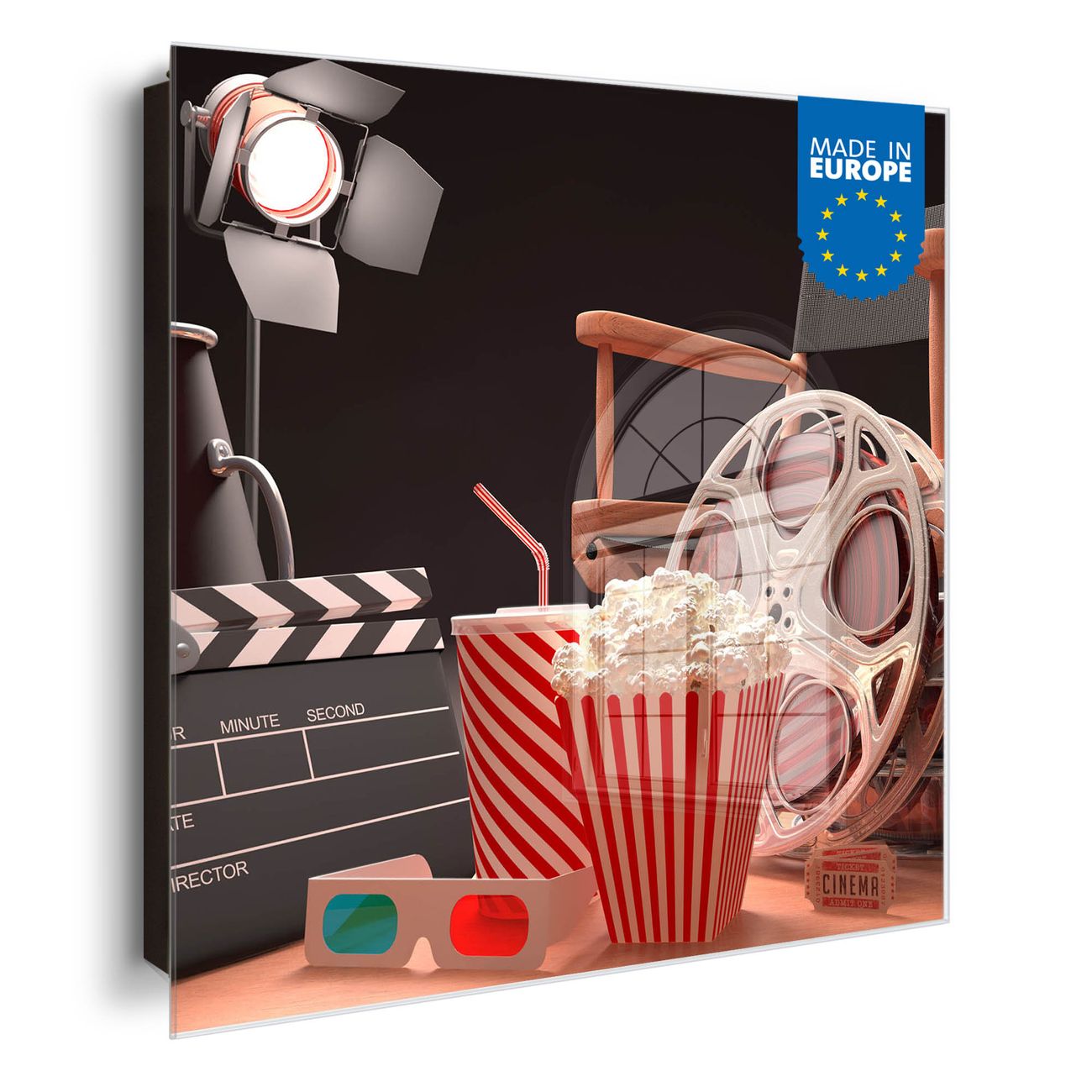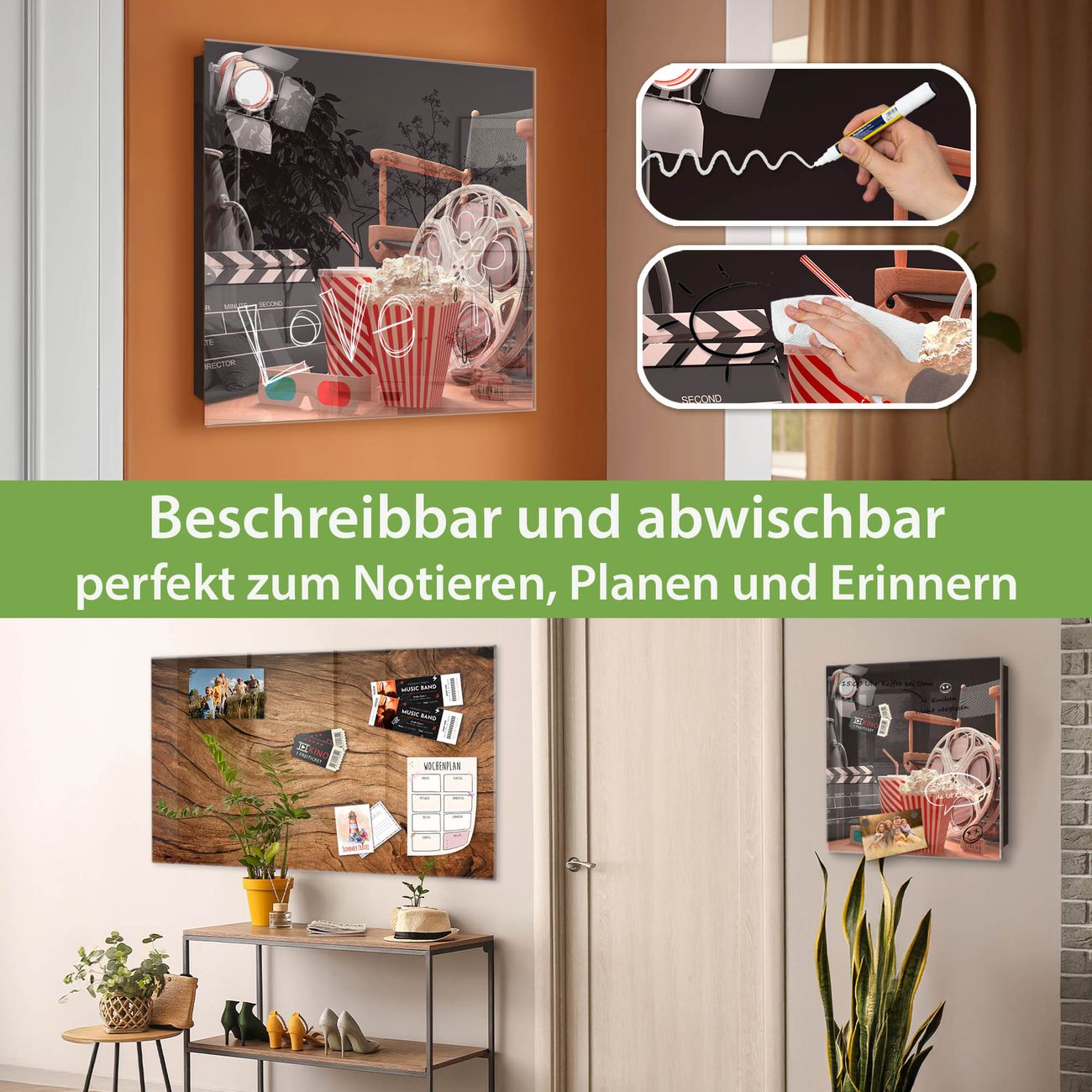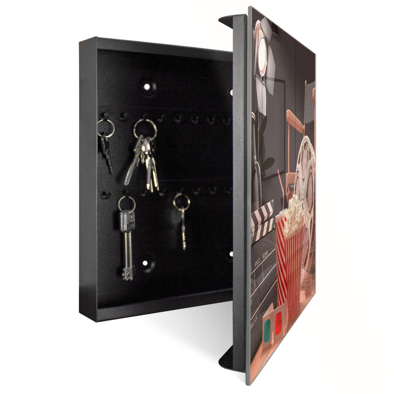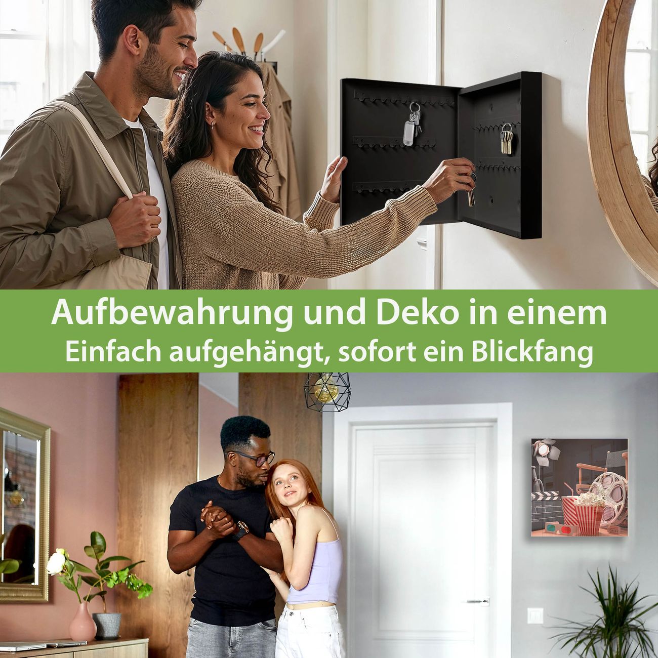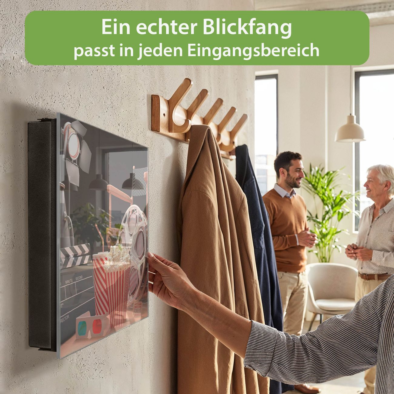 Bringe Ordnung und Eleganz in deinen Eingangsbereich mit dem banjado Schlüsselkasten Motiv Motiv Kino. Die moderne Schlüsselbox kombiniert funktionales Design mit hochwertiger Verarbeitung und wird so zu einem echten Hingucker in Flur, Büro oder Ferienwohnung. ✅ Stilvolle Schlüsselaufbewahrung mit Glasfront im Motiv Motiv Kino Der Design-Schlüsselkasten Motiv Motiv Kino bietet Platz für bis zu 50 Schlüssel, die auf 5 stabilen Reihen mit je 10 Haken übersichtlich verstaut werden. Mit seinen kompakten Maßen von 30 x 30 x 5 cm passt die Schlüsselbox perfekt auch in kleinere Räume. Der schwarz lackierte Stahlkorpus mit rechts angeschlagenem Türscharnier harmoniert mit der Glasfront und fügt sich nahtlos in jedes Wohnambiente ein. Ob als Schlüsselorganizer für Zuhause oder als praktische Lösung für Büros, Praxen und Gewerbe, der banjado Schlüsselkasten sorgt für Ordnung und Übersicht. Dank der magnetischen, mit Kreidestiften beschreibbaren Glasfront kannst du Notizen anheften oder Termine direkt auf der Oberfläche festhalten. Die Schlüsselbox Motiv Motiv Kino zur Wandmontage wird inklusive Befestigungsmaterial geliefert und ist schnell angebracht. So hast du deine Schlüssel jederzeit griffbereit und zugleich stilvoll verstaut. Mit diesem banjado Schlüsselkasten Motiv Motiv Kino kombinierst du praktische Aufbewahrung mit stilvollem Wohndesign. Ob privat oder geschäftlich, die Schlüsselbox sorgt für mehr Ordnung, Übersicht und ein wohnliches Ambiente.Vorteile im Überblick