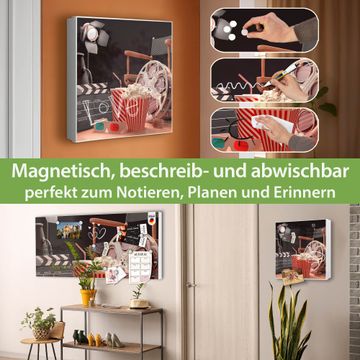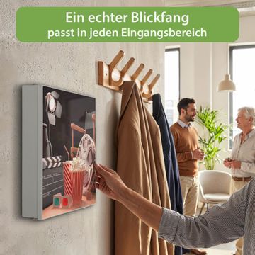 Bringe Ordnung und Eleganz in deinen Eingangsbereich mit dem banjado Schlüsselkasten Motiv Motiv Kino. Die moderne Schlüsselbox kombiniert funktionales Design mit hochwertiger Verarbeitung und wird so zu einem echten Hingucker in Flur, Büro oder Ferienwohnung. ✅ Stilvolle Schlüsselaufbewahrung mit Motiv Motiv Kino Der Design-Schlüsselkasten Motiv Motiv Kino bietet Platz für bis zu 32 Schlüssel, die auf 4 stabilen Reihen mit je 8 Haken übersichtlich verstaut werden. Mit seinen kompakten Maßen von 30 x 30 x 5 cm passt die Schlüsselbox perfekt auch in kleinere Räume. Der weiß lackierte Stahlkorpus mit rechts angeschlagenem Türscharnier harmoniert mit gedruckten Folie auf der Front und fügt sich nahtlos in jedes Wohnambiente ein. Ob als Schlüsselorganizer für Zuhause oder als praktische Lösung für Büros, Praxen und Gewerbe, der banjado Schlüsselkasten sorgt für Ordnung und Übersicht. Dank der magnetischen, mit Kreidestiften beschreibbaren Folie auf der Front kannst du Notizen anheften oder Termine direkt auf der Oberfläche festhalten. Die Schlüsselbox Motiv Motiv Kino zur Wandmontage wird inklusive Befestigungsmaterial geliefert und ist schnell angebracht. So hast du deine Schlüssel jederzeit griffbereit und zugleich stilvoll verstaut. Mit diesem banjado Schlüsselkasten Motiv Motiv Kino kombinierst du praktische Aufbewahrung mit stilvollem Wohndesign. Ob privat oder geschäftlich, die Schlüsselbox sorgt für mehr Ordnung, Übersicht und ein wohnliches Ambiente.Vorteile im Überblick