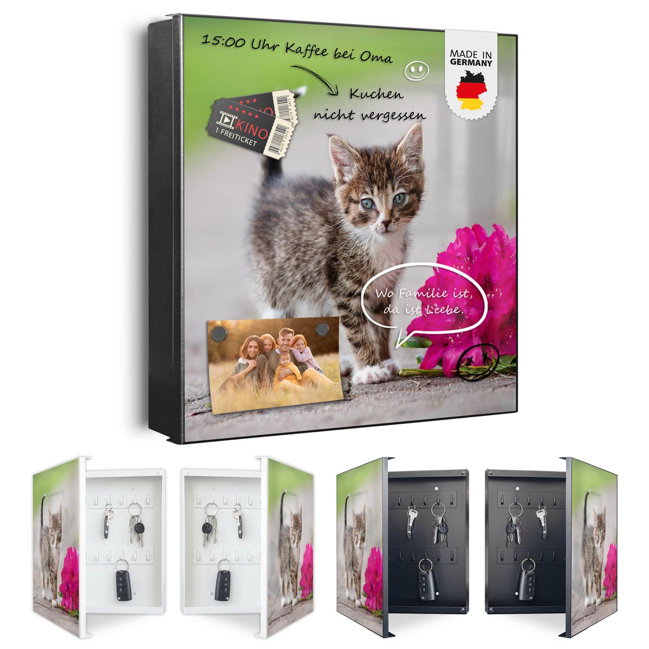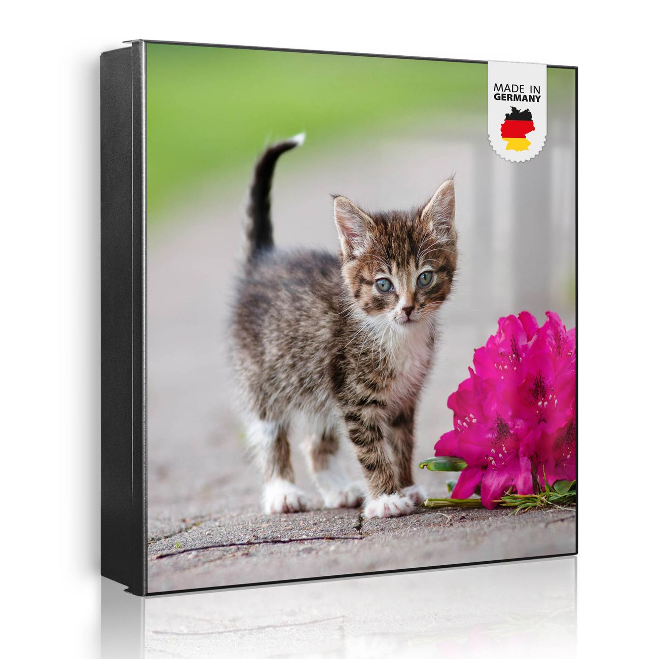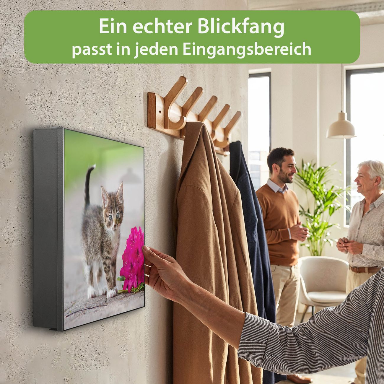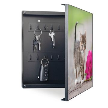 Bringe Ordnung und Eleganz in deinen Eingangsbereich mit dem banjado Schlüsselkasten Motiv Motiv Knut. Die moderne Schlüsselbox kombiniert funktionales Design mit hochwertiger Verarbeitung und wird so zu einem echten Hingucker in Flur, Büro oder Ferienwohnung. ✅ Stilvolle Schlüsselaufbewahrung mit Motiv Motiv Knut Der Design-Schlüsselkasten Motiv Motiv Knut bietet Platz für bis zu 32 Schlüssel, die auf 4 stabilen Reihen mit je 8 Haken übersichtlich verstaut werden. Mit seinen kompakten Maßen von 30 x 30 x 5 cm passt die Schlüsselbox perfekt auch in kleinere Räume. Der schwarz lackierte Stahlkorpus mit rechts angeschlagenem Türscharnier harmoniert mit gedruckten Folie auf der Front und fügt sich nahtlos in jedes Wohnambiente ein. Ob als Schlüsselorganizer für Zuhause oder als praktische Lösung für Büros, Praxen und Gewerbe, der banjado Schlüsselkasten sorgt für Ordnung und Übersicht. Dank der magnetischen, mit Kreidestiften beschreibbaren Folie auf der Front kannst du Notizen anheften oder Termine direkt auf der Oberfläche festhalten. Die Schlüsselbox Motiv Motiv Knut zur Wandmontage wird inklusive Befestigungsmaterial geliefert und ist schnell angebracht. So hast du deine Schlüssel jederzeit griffbereit und zugleich stilvoll verstaut. Mit diesem banjado Schlüsselkasten Motiv Motiv Knut kombinierst du praktische Aufbewahrung mit stilvollem Wohndesign. Ob privat oder geschäftlich, die Schlüsselbox sorgt für mehr Ordnung, Übersicht und ein wohnliches Ambiente.Vorteile im Überblick