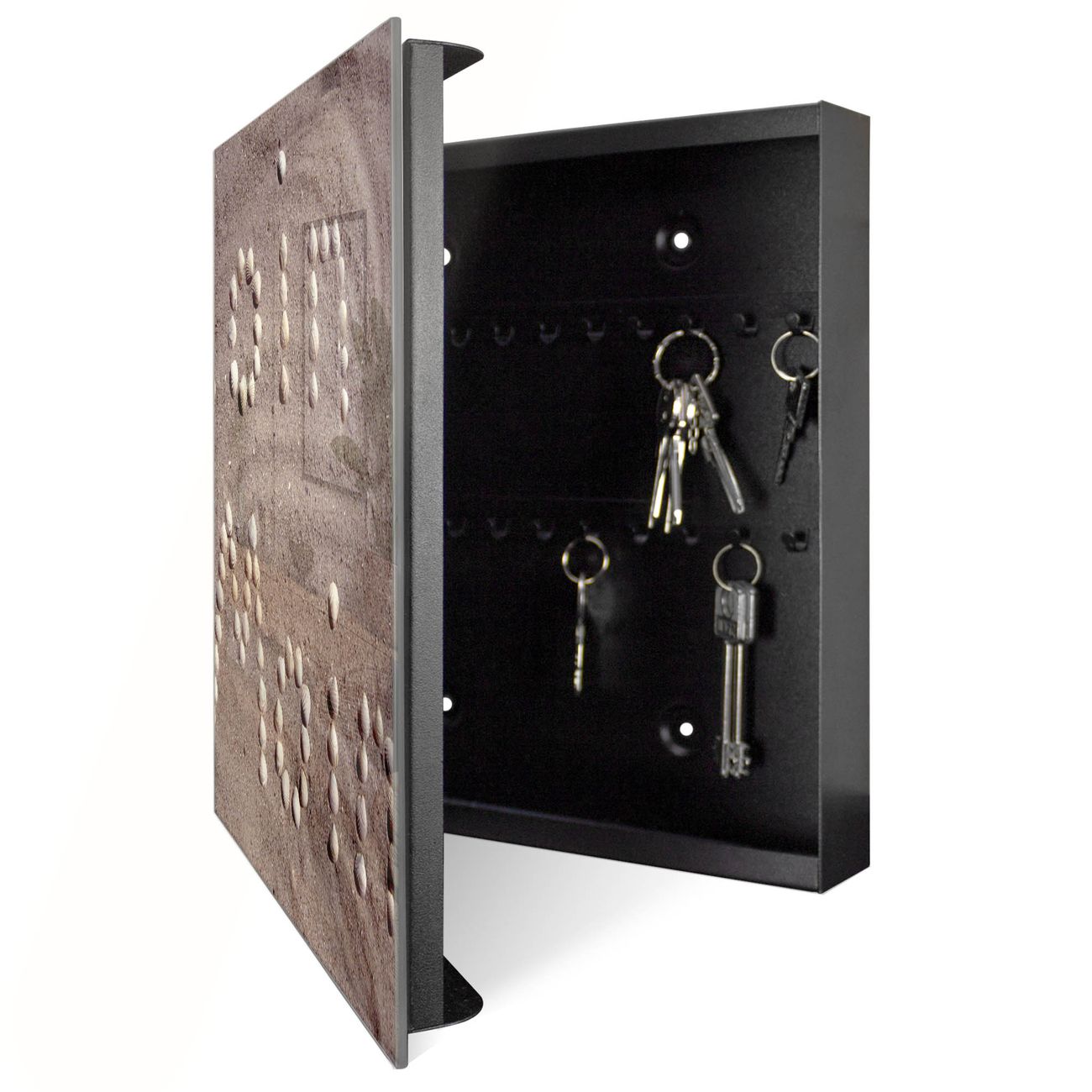Bringe Ordnung und Eleganz in deinen Eingangsbereich mit dem banjado Schlüsselkasten Motiv Motiv Moin Moin. Die moderne Schlüsselbox kombiniert funktionales Design mit hochwertiger Verarbeitung und wird so zu einem echten Hingucker in Flur, Büro oder Ferienwohnung. ✅ Stilvolle Schlüsselaufbewahrung mit Glasfront im Motiv Motiv Moin Moin Der Design-Schlüsselkasten Motiv Motiv Moin Moin bietet Platz für bis zu 50 Schlüssel, die auf 5 stabilen Reihen mit je 10 Haken übersichtlich verstaut werden. Mit seinen kompakten Maßen von 30 x 30 x 5 cm passt die Schlüsselbox perfekt auch in kleinere Räume. Der schwarz lackierte Stahlkorpus mit rechts angeschlagenem Türscharnier harmoniert mit der Glasfront und fügt sich nahtlos in jedes Wohnambiente ein. Ob als Schlüsselorganizer für Zuhause oder als praktische Lösung für Büros, Praxen und Gewerbe, der banjado Schlüsselkasten sorgt für Ordnung und Übersicht. Dank der magnetischen, mit Kreidestiften beschreibbaren Glasfront kannst du Notizen anheften oder Termine direkt auf der Oberfläche festhalten. Die Schlüsselbox Motiv Motiv Moin Moin zur Wandmontage wird inklusive Befestigungsmaterial geliefert und ist schnell angebracht. So hast du deine Schlüssel jederzeit griffbereit und zugleich stilvoll verstaut. Mit diesem banjado Schlüsselkasten Motiv Motiv Moin Moin kombinierst du praktische Aufbewahrung mit stilvollem Wohndesign. Ob privat oder geschäftlich, die Schlüsselbox sorgt für mehr Ordnung, Übersicht und ein wohnliches Ambiente.Vorteile im Überblick