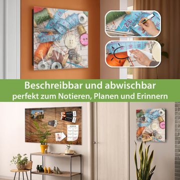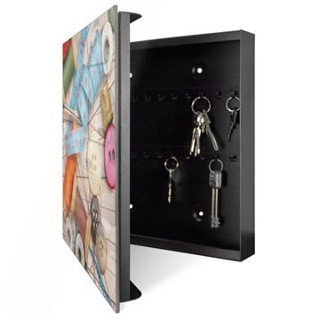 Bringe Ordnung und Eleganz in deinen Eingangsbereich mit dem banjado Schlüsselkasten Motiv Motiv Nähen. Die moderne Schlüsselbox kombiniert funktionales Design mit hochwertiger Verarbeitung und wird so zu einem echten Hingucker in Flur, Büro oder Ferienwohnung. ✅ Stilvolle Schlüsselaufbewahrung mit Glasfront im Motiv Motiv Nähen Der Design-Schlüsselkasten Motiv Motiv Nähen bietet Platz für bis zu 50 Schlüssel, die auf 5 stabilen Reihen mit je 10 Haken übersichtlich verstaut werden. Mit seinen kompakten Maßen von 30 x 30 x 5 cm passt die Schlüsselbox perfekt auch in kleinere Räume. Der schwarz lackierte Stahlkorpus mit rechts angeschlagenem Türscharnier harmoniert mit der Glasfront und fügt sich nahtlos in jedes Wohnambiente ein. Ob als Schlüsselorganizer für Zuhause oder als praktische Lösung für Büros, Praxen und Gewerbe, der banjado Schlüsselkasten sorgt für Ordnung und Übersicht. Dank der magnetischen, mit Kreidestiften beschreibbaren Glasfront kannst du Notizen anheften oder Termine direkt auf der Oberfläche festhalten. Die Schlüsselbox Motiv Motiv Nähen zur Wandmontage wird inklusive Befestigungsmaterial geliefert und ist schnell angebracht. So hast du deine Schlüssel jederzeit griffbereit und zugleich stilvoll verstaut. Mit diesem banjado Schlüsselkasten Motiv Motiv Nähen kombinierst du praktische Aufbewahrung mit stilvollem Wohndesign. Ob privat oder geschäftlich, die Schlüsselbox sorgt für mehr Ordnung, Übersicht und ein wohnliches Ambiente.Vorteile im Überblick