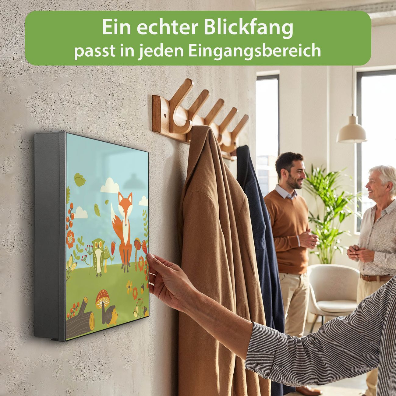 Bringe Ordnung und Eleganz in deinen Eingangsbereich mit dem banjado Schlüsselkasten Motiv Motiv Neulich Im Wald. Die moderne Schlüsselbox kombiniert funktionales Design mit hochwertiger Verarbeitung und wird so zu einem echten Hingucker in Flur, Büro oder Ferienwohnung. ✅ Stilvolle Schlüsselaufbewahrung mit Motiv Motiv Neulich Im Wald Der Design-Schlüsselkasten Motiv Motiv Neulich Im Wald bietet Platz für bis zu 32 Schlüssel, die auf 4 stabilen Reihen mit je 8 Haken übersichtlich verstaut werden. Mit seinen kompakten Maßen von 30 x 30 x 5 cm passt die Schlüsselbox perfekt auch in kleinere Räume. Der schwarz lackierte Stahlkorpus mit rechts angeschlagenem Türscharnier harmoniert mit gedruckten Folie auf der Front und fügt sich nahtlos in jedes Wohnambiente ein. Ob als Schlüsselorganizer für Zuhause oder als praktische Lösung für Büros, Praxen und Gewerbe, der banjado Schlüsselkasten sorgt für Ordnung und Übersicht. Dank der magnetischen, mit Kreidestiften beschreibbaren Folie auf der Front kannst du Notizen anheften oder Termine direkt auf der Oberfläche festhalten. Die Schlüsselbox Motiv Motiv Neulich Im Wald zur Wandmontage wird inklusive Befestigungsmaterial geliefert und ist schnell angebracht. So hast du deine Schlüssel jederzeit griffbereit und zugleich stilvoll verstaut. Mit diesem banjado Schlüsselkasten Motiv Motiv Neulich Im Wald kombinierst du praktische Aufbewahrung mit stilvollem Wohndesign. Ob privat oder geschäftlich, die Schlüsselbox sorgt für mehr Ordnung, Übersicht und ein wohnliches Ambiente.Vorteile im Überblick