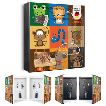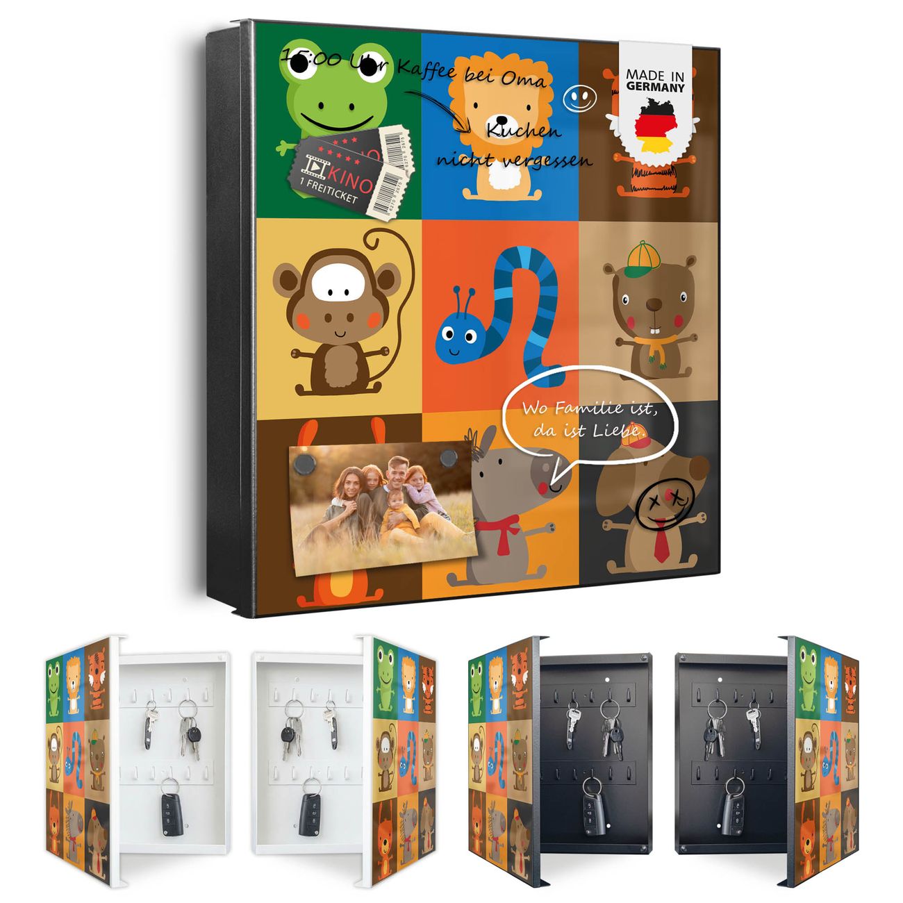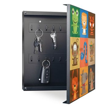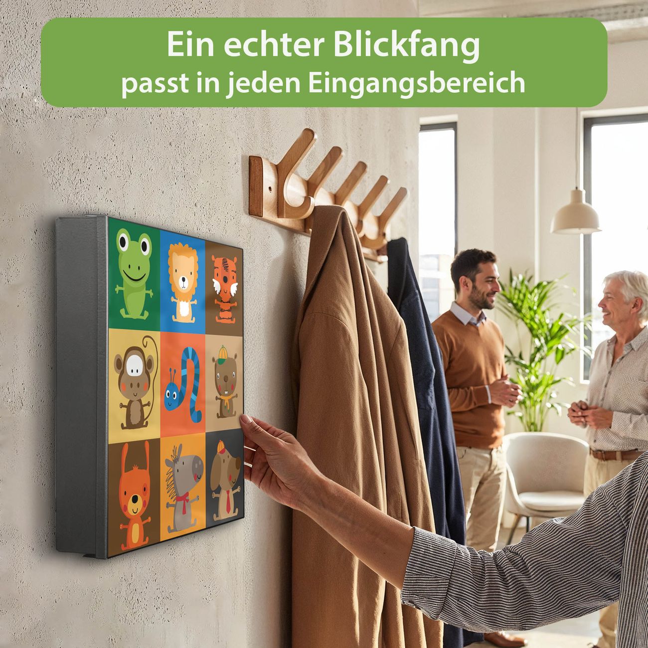 Bringe Ordnung und Eleganz in deinen Eingangsbereich mit dem banjado Schlüsselkasten Motiv Motiv Offene Arme. Die moderne Schlüsselbox kombiniert funktionales Design mit hochwertiger Verarbeitung und wird so zu einem echten Hingucker in Flur, Büro oder Ferienwohnung. ✅ Stilvolle Schlüsselaufbewahrung mit Motiv Motiv Offene Arme Der Design-Schlüsselkasten Motiv Motiv Offene Arme bietet Platz für bis zu 32 Schlüssel, die auf 4 stabilen Reihen mit je 8 Haken übersichtlich verstaut werden. Mit seinen kompakten Maßen von 30 x 30 x 5 cm passt die Schlüsselbox perfekt auch in kleinere Räume. Der schwarz lackierte Stahlkorpus mit rechts angeschlagenem Türscharnier harmoniert mit gedruckten Folie auf der Front und fügt sich nahtlos in jedes Wohnambiente ein. Ob als Schlüsselorganizer für Zuhause oder als praktische Lösung für Büros, Praxen und Gewerbe, der banjado Schlüsselkasten sorgt für Ordnung und Übersicht. Dank der magnetischen, mit Kreidestiften beschreibbaren Folie auf der Front kannst du Notizen anheften oder Termine direkt auf der Oberfläche festhalten. Die Schlüsselbox Motiv Motiv Offene Arme zur Wandmontage wird inklusive Befestigungsmaterial geliefert und ist schnell angebracht. So hast du deine Schlüssel jederzeit griffbereit und zugleich stilvoll verstaut. Mit diesem banjado Schlüsselkasten Motiv Motiv Offene Arme kombinierst du praktische Aufbewahrung mit stilvollem Wohndesign. Ob privat oder geschäftlich, die Schlüsselbox sorgt für mehr Ordnung, Übersicht und ein wohnliches Ambiente.Vorteile im Überblick