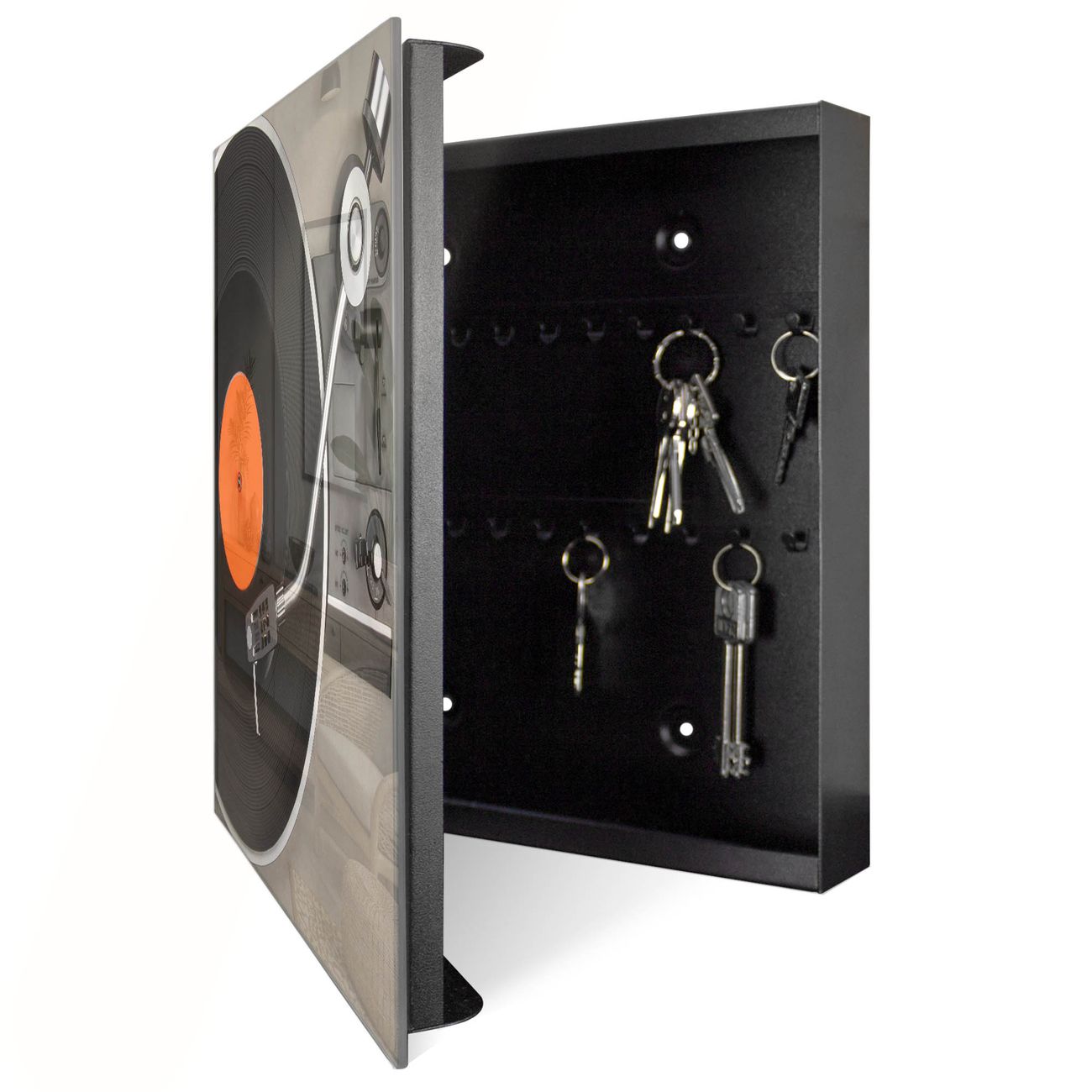 Bringe Ordnung und Eleganz in deinen Eingangsbereich mit dem banjado Schlüsselkasten Motiv Motiv Plattenspieler. Die moderne Schlüsselbox kombiniert funktionales Design mit hochwertiger Verarbeitung und wird so zu einem echten Hingucker in Flur, Büro oder Ferienwohnung. ✅ Stilvolle Schlüsselaufbewahrung mit Glasfront im Motiv Motiv Plattenspieler Der Design-Schlüsselkasten Motiv Motiv Plattenspieler bietet Platz für bis zu 50 Schlüssel, die auf 5 stabilen Reihen mit je 10 Haken übersichtlich verstaut werden. Mit seinen kompakten Maßen von 30 x 30 x 5 cm passt die Schlüsselbox perfekt auch in kleinere Räume. Der schwarz lackierte Stahlkorpus mit rechts angeschlagenem Türscharnier harmoniert mit der Glasfront und fügt sich nahtlos in jedes Wohnambiente ein. Ob als Schlüsselorganizer für Zuhause oder als praktische Lösung für Büros, Praxen und Gewerbe, der banjado Schlüsselkasten sorgt für Ordnung und Übersicht. Dank der magnetischen, mit Kreidestiften beschreibbaren Glasfront kannst du Notizen anheften oder Termine direkt auf der Oberfläche festhalten. Die Schlüsselbox Motiv Motiv Plattenspieler zur Wandmontage wird inklusive Befestigungsmaterial geliefert und ist schnell angebracht. So hast du deine Schlüssel jederzeit griffbereit und zugleich stilvoll verstaut. Mit diesem banjado Schlüsselkasten Motiv Motiv Plattenspieler kombinierst du praktische Aufbewahrung mit stilvollem Wohndesign. Ob privat oder geschäftlich, die Schlüsselbox sorgt für mehr Ordnung, Übersicht und ein wohnliches Ambiente.Vorteile im Überblick
