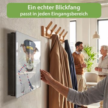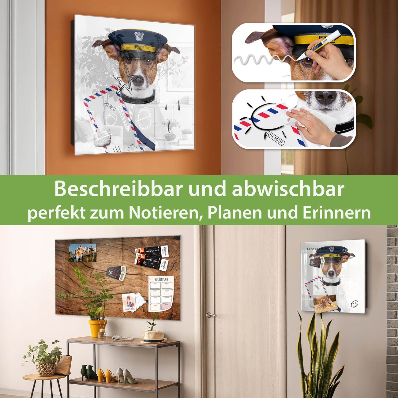 Bringe Ordnung und Eleganz in deinen Eingangsbereich mit dem banjado Schlüsselkasten Motiv Motiv Postbote Jack Russel. Die moderne Schlüsselbox kombiniert funktionales Design mit hochwertiger Verarbeitung und wird so zu einem echten Hingucker in Flur, Büro oder Ferienwohnung. ✅ Stilvolle Schlüsselaufbewahrung mit Glasfront im Motiv Motiv Postbote Jack Russel Der Design-Schlüsselkasten Motiv Motiv Postbote Jack Russel bietet Platz für bis zu 50 Schlüssel, die auf 5 stabilen Reihen mit je 10 Haken übersichtlich verstaut werden. Mit seinen kompakten Maßen von 30 x 30 x 5 cm passt die Schlüsselbox perfekt auch in kleinere Räume. Der schwarz lackierte Stahlkorpus mit rechts angeschlagenem Türscharnier harmoniert mit der Glasfront und fügt sich nahtlos in jedes Wohnambiente ein. Ob als Schlüsselorganizer für Zuhause oder als praktische Lösung für Büros, Praxen und Gewerbe, der banjado Schlüsselkasten sorgt für Ordnung und Übersicht. Dank der magnetischen, mit Kreidestiften beschreibbaren Glasfront kannst du Notizen anheften oder Termine direkt auf der Oberfläche festhalten. Die Schlüsselbox Motiv Motiv Postbote Jack Russel zur Wandmontage wird inklusive Befestigungsmaterial geliefert und ist schnell angebracht. So hast du deine Schlüssel jederzeit griffbereit und zugleich stilvoll verstaut. Mit diesem banjado Schlüsselkasten Motiv Motiv Postbote Jack Russel kombinierst du praktische Aufbewahrung mit stilvollem Wohndesign. Ob privat oder geschäftlich, die Schlüsselbox sorgt für mehr Ordnung, Übersicht und ein wohnliches Ambiente.Vorteile im Überblick