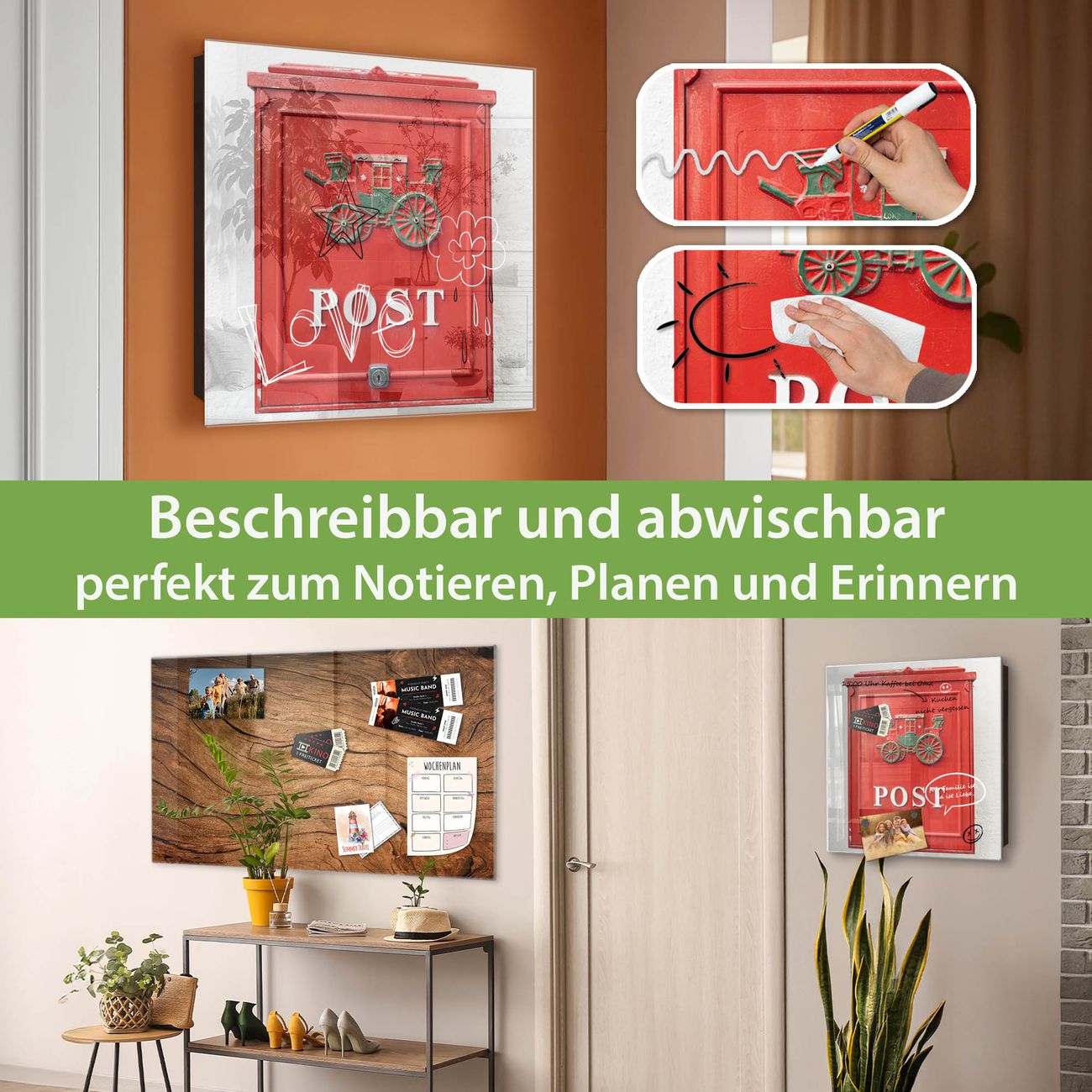 Bringe Ordnung und Eleganz in deinen Eingangsbereich mit dem banjado Schlüsselkasten Motiv Motiv Postkasten Nostalgie. Die moderne Schlüsselbox kombiniert funktionales Design mit hochwertiger Verarbeitung und wird so zu einem echten Hingucker in Flur, Büro oder Ferienwohnung. ✅ Stilvolle Schlüsselaufbewahrung mit Glasfront im Motiv Motiv Postkasten Nostalgie Der Design-Schlüsselkasten Motiv Motiv Postkasten Nostalgie bietet Platz für bis zu 50 Schlüssel, die auf 5 stabilen Reihen mit je 10 Haken übersichtlich verstaut werden. Mit seinen kompakten Maßen von 30 x 30 x 5 cm passt die Schlüsselbox perfekt auch in kleinere Räume. Der schwarz lackierte Stahlkorpus mit rechts angeschlagenem Türscharnier harmoniert mit der Glasfront und fügt sich nahtlos in jedes Wohnambiente ein. Ob als Schlüsselorganizer für Zuhause oder als praktische Lösung für Büros, Praxen und Gewerbe, der banjado Schlüsselkasten sorgt für Ordnung und Übersicht. Dank der magnetischen, mit Kreidestiften beschreibbaren Glasfront kannst du Notizen anheften oder Termine direkt auf der Oberfläche festhalten. Die Schlüsselbox Motiv Motiv Postkasten Nostalgie zur Wandmontage wird inklusive Befestigungsmaterial geliefert und ist schnell angebracht. So hast du deine Schlüssel jederzeit griffbereit und zugleich stilvoll verstaut. Mit diesem banjado Schlüsselkasten Motiv Motiv Postkasten Nostalgie kombinierst du praktische Aufbewahrung mit stilvollem Wohndesign. Ob privat oder geschäftlich, die Schlüsselbox sorgt für mehr Ordnung, Übersicht und ein wohnliches Ambiente.Vorteile im Überblick