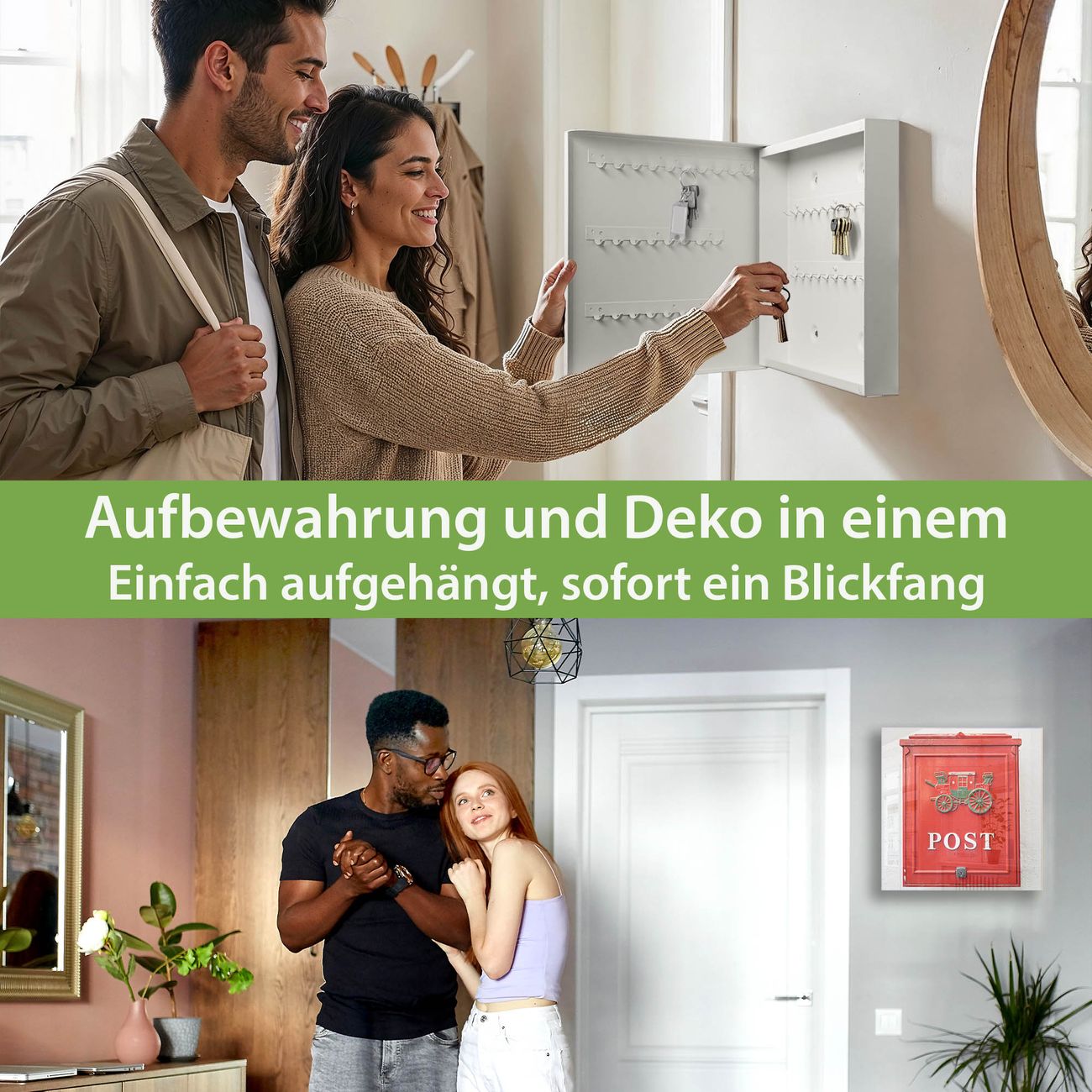 Bringe Ordnung und Eleganz in deinen Eingangsbereich mit dem banjado Schlüsselkasten Motiv Motiv Postkasten Nostalgie. Die moderne Schlüsselbox kombiniert funktionales Design mit hochwertiger Verarbeitung und wird so zu einem echten Hingucker in Flur, Büro oder Ferienwohnung. ✅ Stilvolle Schlüsselaufbewahrung mit Glasfront im Motiv Motiv Postkasten Nostalgie Der Design-Schlüsselkasten Motiv Motiv Postkasten Nostalgie bietet Platz für bis zu 50 Schlüssel, die auf 5 stabilen Reihen mit je 10 Haken übersichtlich verstaut werden. Mit seinen kompakten Maßen von 30 x 30 x 5 cm passt die Schlüsselbox perfekt auch in kleinere Räume. Der weiß lackierte Stahlkorpus mit rechts angeschlagenem Türscharnier harmoniert mit der Glasfront und fügt sich nahtlos in jedes Wohnambiente ein. Ob als Schlüsselorganizer für Zuhause oder als praktische Lösung für Büros, Praxen und Gewerbe, der banjado Schlüsselkasten sorgt für Ordnung und Übersicht. Dank der magnetischen, mit Kreidestiften beschreibbaren Glasfront kannst du Notizen anheften oder Termine direkt auf der Oberfläche festhalten. Die Schlüsselbox Motiv Motiv Postkasten Nostalgie zur Wandmontage wird inklusive Befestigungsmaterial geliefert und ist schnell angebracht. So hast du deine Schlüssel jederzeit griffbereit und zugleich stilvoll verstaut. Mit diesem banjado Schlüsselkasten Motiv Motiv Postkasten Nostalgie kombinierst du praktische Aufbewahrung mit stilvollem Wohndesign. Ob privat oder geschäftlich, die Schlüsselbox sorgt für mehr Ordnung, Übersicht und ein wohnliches Ambiente.Vorteile im Überblick
