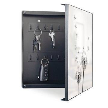 Bringe Ordnung und Eleganz in deinen Eingangsbereich mit dem banjado Schlüsselkasten Motiv Motiv Pusteblume 2. Die moderne Schlüsselbox kombiniert funktionales Design mit hochwertiger Verarbeitung und wird so zu einem echten Hingucker in Flur, Büro oder Ferienwohnung. ✅ Stilvolle Schlüsselaufbewahrung mit Motiv Motiv Pusteblume 2 Der Design-Schlüsselkasten Motiv Motiv Pusteblume 2 bietet Platz für bis zu 32 Schlüssel, die auf 4 stabilen Reihen mit je 8 Haken übersichtlich verstaut werden. Mit seinen kompakten Maßen von 30 x 30 x 5 cm passt die Schlüsselbox perfekt auch in kleinere Räume. Der schwarz lackierte Stahlkorpus mit rechts angeschlagenem Türscharnier harmoniert mit gedruckten Folie auf der Front und fügt sich nahtlos in jedes Wohnambiente ein. Ob als Schlüsselorganizer für Zuhause oder als praktische Lösung für Büros, Praxen und Gewerbe, der banjado Schlüsselkasten sorgt für Ordnung und Übersicht. Dank der magnetischen, mit Kreidestiften beschreibbaren Folie auf der Front kannst du Notizen anheften oder Termine direkt auf der Oberfläche festhalten. Die Schlüsselbox Motiv Motiv Pusteblume 2 zur Wandmontage wird inklusive Befestigungsmaterial geliefert und ist schnell angebracht. So hast du deine Schlüssel jederzeit griffbereit und zugleich stilvoll verstaut. Mit diesem banjado Schlüsselkasten Motiv Motiv Pusteblume 2 kombinierst du praktische Aufbewahrung mit stilvollem Wohndesign. Ob privat oder geschäftlich, die Schlüsselbox sorgt für mehr Ordnung, Übersicht und ein wohnliches Ambiente.Vorteile im Überblick