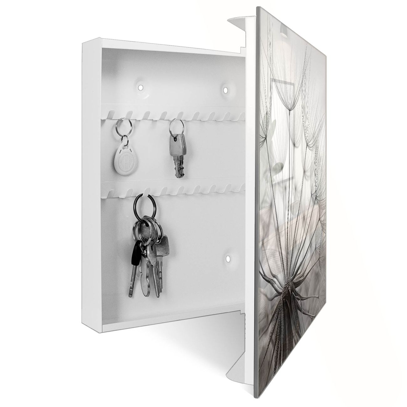 Bringe Ordnung und Eleganz in deinen Eingangsbereich mit dem banjado Schlüsselkasten Motiv Motiv Ready For Takeoff. Die moderne Schlüsselbox kombiniert funktionales Design mit hochwertiger Verarbeitung und wird so zu einem echten Hingucker in Flur, Büro oder Ferienwohnung. ✅ Stilvolle Schlüsselaufbewahrung mit Glasfront im Motiv Motiv Ready For Takeoff Der Design-Schlüsselkasten Motiv Motiv Ready For Takeoff bietet Platz für bis zu 50 Schlüssel, die auf 5 stabilen Reihen mit je 10 Haken übersichtlich verstaut werden. Mit seinen kompakten Maßen von 30 x 30 x 5 cm passt die Schlüsselbox perfekt auch in kleinere Räume. Der weiß lackierte Stahlkorpus mit rechts angeschlagenem Türscharnier harmoniert mit der Glasfront und fügt sich nahtlos in jedes Wohnambiente ein. Ob als Schlüsselorganizer für Zuhause oder als praktische Lösung für Büros, Praxen und Gewerbe, der banjado Schlüsselkasten sorgt für Ordnung und Übersicht. Dank der magnetischen, mit Kreidestiften beschreibbaren Glasfront kannst du Notizen anheften oder Termine direkt auf der Oberfläche festhalten. Die Schlüsselbox Motiv Motiv Ready For Takeoff zur Wandmontage wird inklusive Befestigungsmaterial geliefert und ist schnell angebracht. So hast du deine Schlüssel jederzeit griffbereit und zugleich stilvoll verstaut. Mit diesem banjado Schlüsselkasten Motiv Motiv Ready For Takeoff kombinierst du praktische Aufbewahrung mit stilvollem Wohndesign. Ob privat oder geschäftlich, die Schlüsselbox sorgt für mehr Ordnung, Übersicht und ein wohnliches Ambiente.Vorteile im Überblick