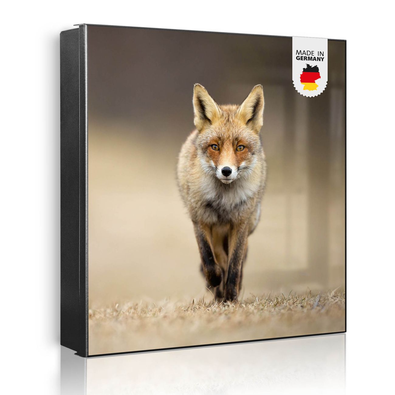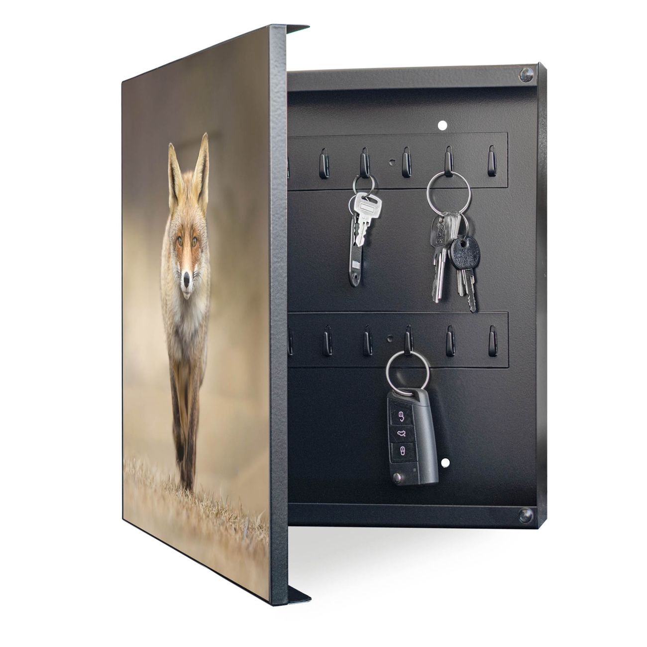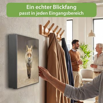 Bringe Ordnung und Eleganz in deinen Eingangsbereich mit dem banjado Schlüsselkasten Motiv Motiv Rosalie. Die moderne Schlüsselbox kombiniert funktionales Design mit hochwertiger Verarbeitung und wird so zu einem echten Hingucker in Flur, Büro oder Ferienwohnung. ✅ Stilvolle Schlüsselaufbewahrung mit Motiv Motiv Rosalie Der Design-Schlüsselkasten Motiv Motiv Rosalie bietet Platz für bis zu 32 Schlüssel, die auf 4 stabilen Reihen mit je 8 Haken übersichtlich verstaut werden. Mit seinen kompakten Maßen von 30 x 30 x 5 cm passt die Schlüsselbox perfekt auch in kleinere Räume. Der schwarz lackierte Stahlkorpus mit links angeschlagenem Türscharnier harmoniert mit gedruckten Folie auf der Front und fügt sich nahtlos in jedes Wohnambiente ein. Ob als Schlüsselorganizer für Zuhause oder als praktische Lösung für Büros, Praxen und Gewerbe, der banjado Schlüsselkasten sorgt für Ordnung und Übersicht. Dank der magnetischen, mit Kreidestiften beschreibbaren Folie auf der Front kannst du Notizen anheften oder Termine direkt auf der Oberfläche festhalten. Die Schlüsselbox Motiv Motiv Rosalie zur Wandmontage wird inklusive Befestigungsmaterial geliefert und ist schnell angebracht. So hast du deine Schlüssel jederzeit griffbereit und zugleich stilvoll verstaut. Mit diesem banjado Schlüsselkasten Motiv Motiv Rosalie kombinierst du praktische Aufbewahrung mit stilvollem Wohndesign. Ob privat oder geschäftlich, die Schlüsselbox sorgt für mehr Ordnung, Übersicht und ein wohnliches Ambiente.Vorteile im Überblick