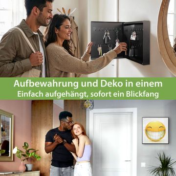 Bringe Ordnung und Eleganz in deinen Eingangsbereich mit dem banjado Schlüsselkasten Motiv Motiv Smile. Die moderne Schlüsselbox kombiniert funktionales Design mit hochwertiger Verarbeitung und wird so zu einem echten Hingucker in Flur, Büro oder Ferienwohnung. ✅ Stilvolle Schlüsselaufbewahrung mit Motiv Motiv Smile Der Design-Schlüsselkasten Motiv Motiv Smile bietet Platz für bis zu 32 Schlüssel, die auf 4 stabilen Reihen mit je 8 Haken übersichtlich verstaut werden. Mit seinen kompakten Maßen von 30 x 30 x 5 cm passt die Schlüsselbox perfekt auch in kleinere Räume. Der schwarz lackierte Stahlkorpus mit rechts angeschlagenem Türscharnier harmoniert mit gedruckten Folie auf der Front und fügt sich nahtlos in jedes Wohnambiente ein. Ob als Schlüsselorganizer für Zuhause oder als praktische Lösung für Büros, Praxen und Gewerbe, der banjado Schlüsselkasten sorgt für Ordnung und Übersicht. Dank der magnetischen, mit Kreidestiften beschreibbaren Folie auf der Front kannst du Notizen anheften oder Termine direkt auf der Oberfläche festhalten. Die Schlüsselbox Motiv Motiv Smile zur Wandmontage wird inklusive Befestigungsmaterial geliefert und ist schnell angebracht. So hast du deine Schlüssel jederzeit griffbereit und zugleich stilvoll verstaut. Mit diesem banjado Schlüsselkasten Motiv Motiv Smile kombinierst du praktische Aufbewahrung mit stilvollem Wohndesign. Ob privat oder geschäftlich, die Schlüsselbox sorgt für mehr Ordnung, Übersicht und ein wohnliches Ambiente.Vorteile im Überblick