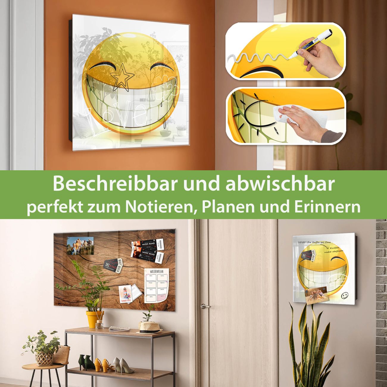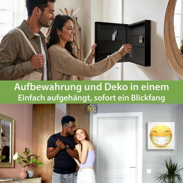 Bringe Ordnung und Eleganz in deinen Eingangsbereich mit dem banjado Schlüsselkasten Motiv Motiv Smile. Die moderne Schlüsselbox kombiniert funktionales Design mit hochwertiger Verarbeitung und wird so zu einem echten Hingucker in Flur, Büro oder Ferienwohnung. ✅ Stilvolle Schlüsselaufbewahrung mit Glasfront im Motiv Motiv Smile Der Design-Schlüsselkasten Motiv Motiv Smile bietet Platz für bis zu 50 Schlüssel, die auf 5 stabilen Reihen mit je 10 Haken übersichtlich verstaut werden. Mit seinen kompakten Maßen von 30 x 30 x 5 cm passt die Schlüsselbox perfekt auch in kleinere Räume. Der schwarz lackierte Stahlkorpus mit rechts angeschlagenem Türscharnier harmoniert mit der Glasfront und fügt sich nahtlos in jedes Wohnambiente ein. Ob als Schlüsselorganizer für Zuhause oder als praktische Lösung für Büros, Praxen und Gewerbe, der banjado Schlüsselkasten sorgt für Ordnung und Übersicht. Dank der magnetischen, mit Kreidestiften beschreibbaren Glasfront kannst du Notizen anheften oder Termine direkt auf der Oberfläche festhalten. Die Schlüsselbox Motiv Motiv Smile zur Wandmontage wird inklusive Befestigungsmaterial geliefert und ist schnell angebracht. So hast du deine Schlüssel jederzeit griffbereit und zugleich stilvoll verstaut. Mit diesem banjado Schlüsselkasten Motiv Motiv Smile kombinierst du praktische Aufbewahrung mit stilvollem Wohndesign. Ob privat oder geschäftlich, die Schlüsselbox sorgt für mehr Ordnung, Übersicht und ein wohnliches Ambiente.Vorteile im Überblick