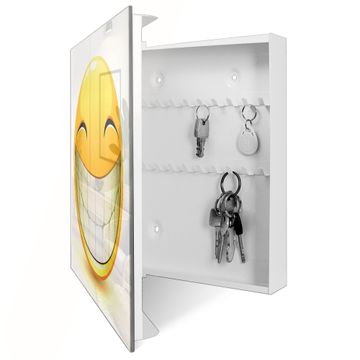 Bringe Ordnung und Eleganz in deinen Eingangsbereich mit dem banjado Schlüsselkasten Motiv Motiv Smile. Die moderne Schlüsselbox kombiniert funktionales Design mit hochwertiger Verarbeitung und wird so zu einem echten Hingucker in Flur, Büro oder Ferienwohnung. ✅ Stilvolle Schlüsselaufbewahrung mit Glasfront im Motiv Motiv Smile Der Design-Schlüsselkasten Motiv Motiv Smile bietet Platz für bis zu 50 Schlüssel, die auf 5 stabilen Reihen mit je 10 Haken übersichtlich verstaut werden. Mit seinen kompakten Maßen von 30 x 30 x 5 cm passt die Schlüsselbox perfekt auch in kleinere Räume. Der weiß lackierte Stahlkorpus mit rechts angeschlagenem Türscharnier harmoniert mit der Glasfront und fügt sich nahtlos in jedes Wohnambiente ein. Ob als Schlüsselorganizer für Zuhause oder als praktische Lösung für Büros, Praxen und Gewerbe, der banjado Schlüsselkasten sorgt für Ordnung und Übersicht. Dank der magnetischen, mit Kreidestiften beschreibbaren Glasfront kannst du Notizen anheften oder Termine direkt auf der Oberfläche festhalten. Die Schlüsselbox Motiv Motiv Smile zur Wandmontage wird inklusive Befestigungsmaterial geliefert und ist schnell angebracht. So hast du deine Schlüssel jederzeit griffbereit und zugleich stilvoll verstaut. Mit diesem banjado Schlüsselkasten Motiv Motiv Smile kombinierst du praktische Aufbewahrung mit stilvollem Wohndesign. Ob privat oder geschäftlich, die Schlüsselbox sorgt für mehr Ordnung, Übersicht und ein wohnliches Ambiente.Vorteile im Überblick