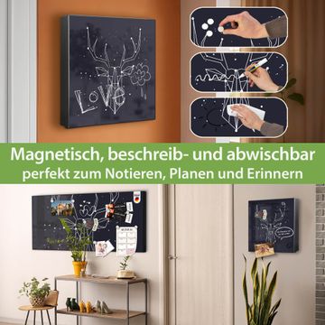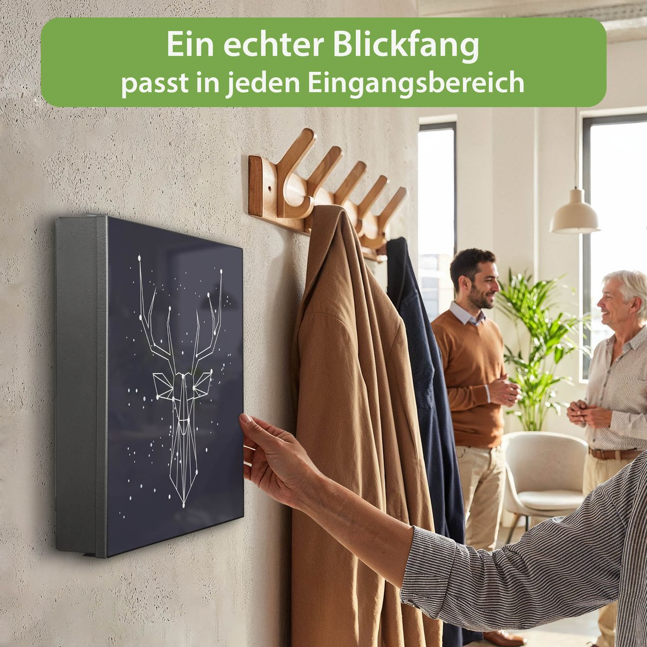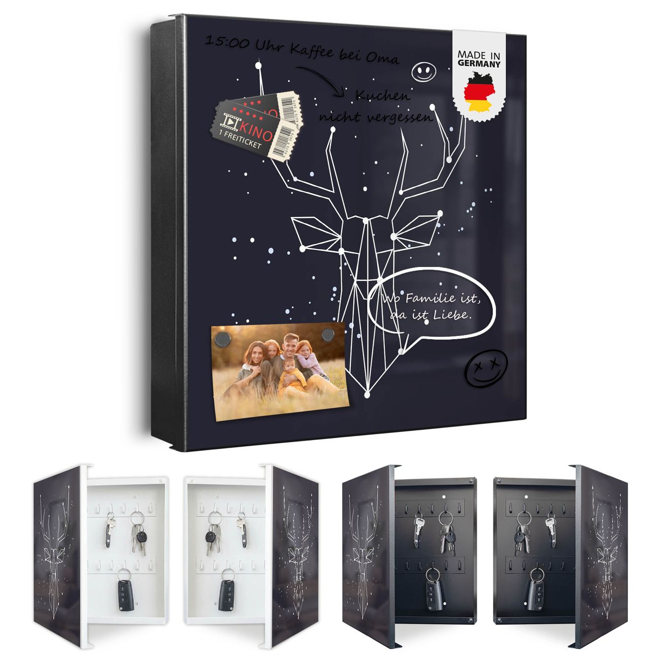 Bringe Ordnung und Eleganz in deinen Eingangsbereich mit dem banjado Schlüsselkasten Motiv Motiv Sternbild Hirsch. Die moderne Schlüsselbox kombiniert funktionales Design mit hochwertiger Verarbeitung und wird so zu einem echten Hingucker in Flur, Büro oder Ferienwohnung. ✅ Stilvolle Schlüsselaufbewahrung mit Motiv Motiv Sternbild Hirsch Der Design-Schlüsselkasten Motiv Motiv Sternbild Hirsch bietet Platz für bis zu 32 Schlüssel, die auf 4 stabilen Reihen mit je 8 Haken übersichtlich verstaut werden. Mit seinen kompakten Maßen von 30 x 30 x 5 cm passt die Schlüsselbox perfekt auch in kleinere Räume. Der schwarz lackierte Stahlkorpus mit rechts angeschlagenem Türscharnier harmoniert mit gedruckten Folie auf der Front und fügt sich nahtlos in jedes Wohnambiente ein. Ob als Schlüsselorganizer für Zuhause oder als praktische Lösung für Büros, Praxen und Gewerbe, der banjado Schlüsselkasten sorgt für Ordnung und Übersicht. Dank der magnetischen, mit Kreidestiften beschreibbaren Folie auf der Front kannst du Notizen anheften oder Termine direkt auf der Oberfläche festhalten. Die Schlüsselbox Motiv Motiv Sternbild Hirsch zur Wandmontage wird inklusive Befestigungsmaterial geliefert und ist schnell angebracht. So hast du deine Schlüssel jederzeit griffbereit und zugleich stilvoll verstaut. Mit diesem banjado Schlüsselkasten Motiv Motiv Sternbild Hirsch kombinierst du praktische Aufbewahrung mit stilvollem Wohndesign. Ob privat oder geschäftlich, die Schlüsselbox sorgt für mehr Ordnung, Übersicht und ein wohnliches Ambiente.Vorteile im Überblick