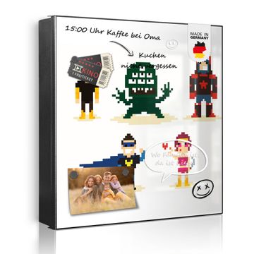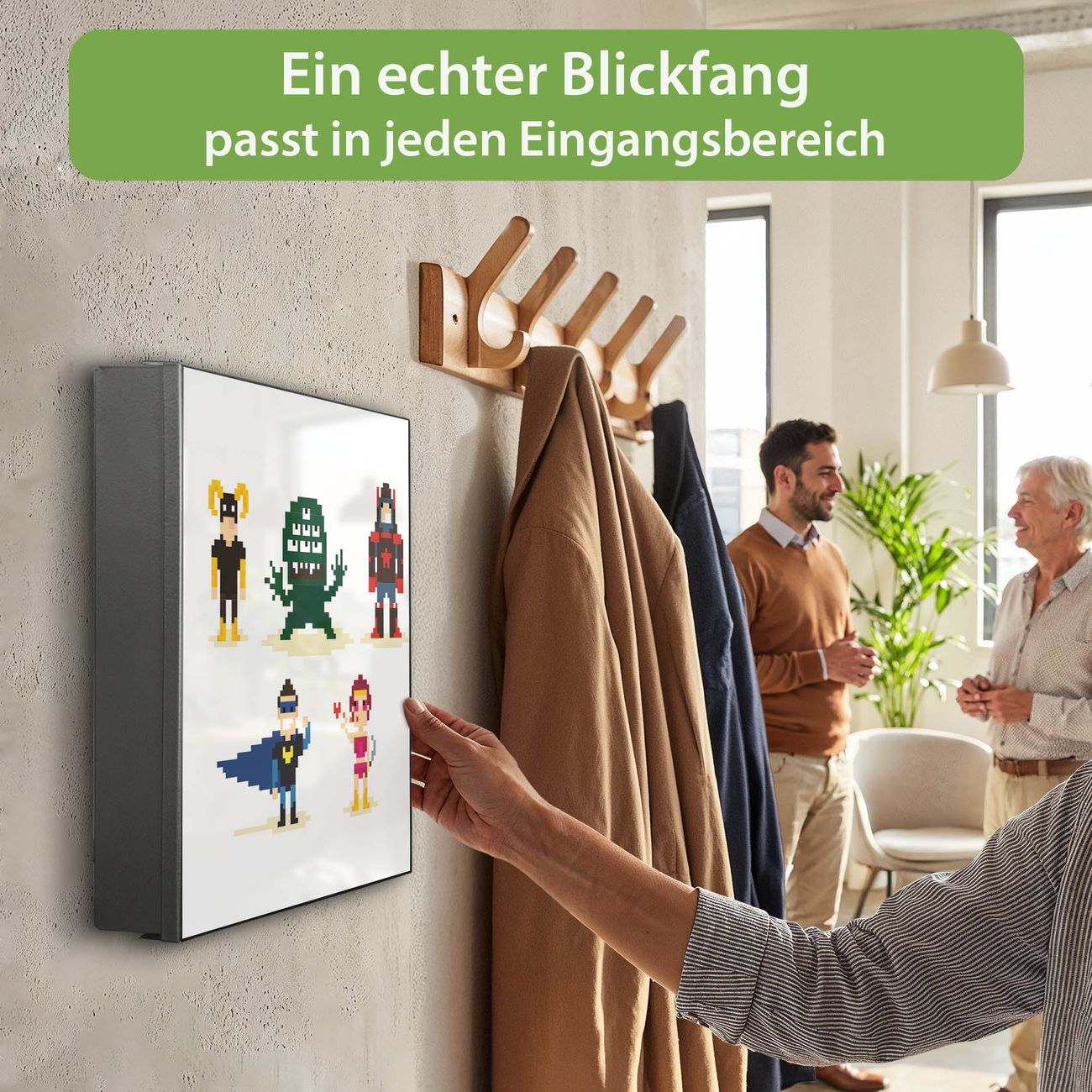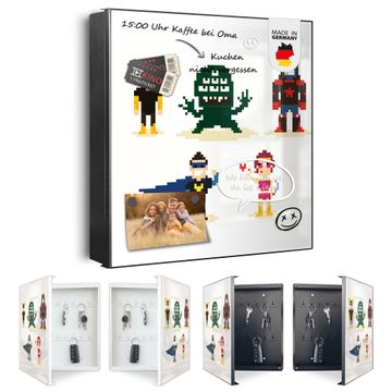 Bringe Ordnung und Eleganz in deinen Eingangsbereich mit dem banjado Schlüsselkasten Motiv Motiv Superhelden . Die moderne Schlüsselbox kombiniert funktionales Design mit hochwertiger Verarbeitung und wird so zu einem echten Hingucker in Flur, Büro oder Ferienwohnung. ✅ Stilvolle Schlüsselaufbewahrung mit Motiv Motiv Superhelden Der Design-Schlüsselkasten Motiv Motiv Superhelden bietet Platz für bis zu 32 Schlüssel, die auf 4 stabilen Reihen mit je 8 Haken übersichtlich verstaut werden. Mit seinen kompakten Maßen von 30 x 30 x 5 cm passt die Schlüsselbox perfekt auch in kleinere Räume. Der schwarz lackierte Stahlkorpus mit rechts angeschlagenem Türscharnier harmoniert mit gedruckten Folie auf der Front und fügt sich nahtlos in jedes Wohnambiente ein. Ob als Schlüsselorganizer für Zuhause oder als praktische Lösung für Büros, Praxen und Gewerbe, der banjado Schlüsselkasten sorgt für Ordnung und Übersicht. Dank der magnetischen, mit Kreidestiften beschreibbaren Folie auf der Front kannst du Notizen anheften oder Termine direkt auf der Oberfläche festhalten. Die Schlüsselbox Motiv Motiv Superhelden zur Wandmontage wird inklusive Befestigungsmaterial geliefert und ist schnell angebracht. So hast du deine Schlüssel jederzeit griffbereit und zugleich stilvoll verstaut. Mit diesem banjado Schlüsselkasten Motiv Motiv Superhelden kombinierst du praktische Aufbewahrung mit stilvollem Wohndesign. Ob privat oder geschäftlich, die Schlüsselbox sorgt für mehr Ordnung, Übersicht und ein wohnliches Ambiente.Vorteile im Überblick
