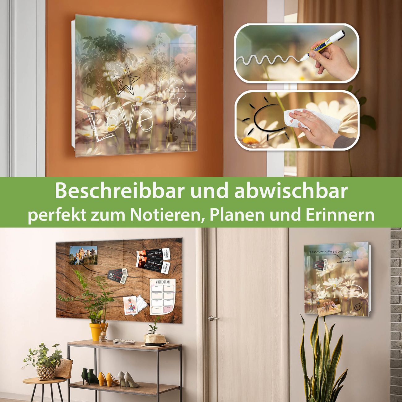 ✅ Magnetisch und mit Kreidestift beschreibbar, gehärtetes Glas, links angeschlagene TürOrdnung und Design in einem