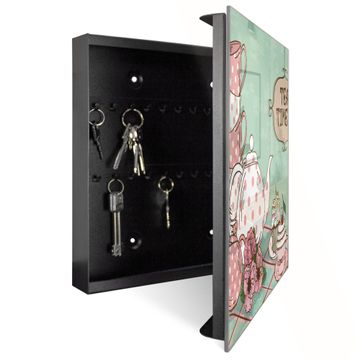 Bringe Ordnung und Eleganz in deinen Eingangsbereich mit dem banjado Schlüsselkasten Motiv Motiv Tea Time. Die moderne Schlüsselbox kombiniert funktionales Design mit hochwertiger Verarbeitung und wird so zu einem echten Hingucker in Flur, Büro oder Ferienwohnung. ✅ Stilvolle Schlüsselaufbewahrung mit Glasfront im Motiv Motiv Tea Time Der Design-Schlüsselkasten Motiv Motiv Tea Time bietet Platz für bis zu 50 Schlüssel, die auf 5 stabilen Reihen mit je 10 Haken übersichtlich verstaut werden. Mit seinen kompakten Maßen von 30 x 30 x 5 cm passt die Schlüsselbox perfekt auch in kleinere Räume. Der schwarz lackierte Stahlkorpus mit rechts angeschlagenem Türscharnier harmoniert mit der Glasfront und fügt sich nahtlos in jedes Wohnambiente ein. Ob als Schlüsselorganizer für Zuhause oder als praktische Lösung für Büros, Praxen und Gewerbe, der banjado Schlüsselkasten sorgt für Ordnung und Übersicht. Dank der magnetischen, mit Kreidestiften beschreibbaren Glasfront kannst du Notizen anheften oder Termine direkt auf der Oberfläche festhalten. Die Schlüsselbox Motiv Motiv Tea Time zur Wandmontage wird inklusive Befestigungsmaterial geliefert und ist schnell angebracht. So hast du deine Schlüssel jederzeit griffbereit und zugleich stilvoll verstaut. Mit diesem banjado Schlüsselkasten Motiv Motiv Tea Time kombinierst du praktische Aufbewahrung mit stilvollem Wohndesign. Ob privat oder geschäftlich, die Schlüsselbox sorgt für mehr Ordnung, Übersicht und ein wohnliches Ambiente.Vorteile im Überblick