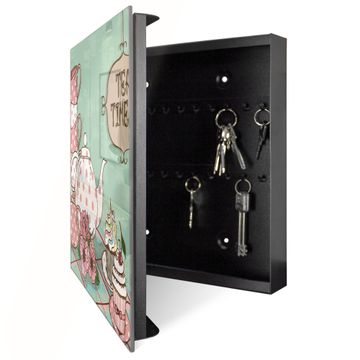 Bringe Ordnung und Eleganz in deinen Eingangsbereich mit dem banjado Schlüsselkasten Motiv Motiv Tea Time. Die moderne Schlüsselbox kombiniert funktionales Design mit hochwertiger Verarbeitung und wird so zu einem echten Hingucker in Flur, Büro oder Ferienwohnung. ✅ Stilvolle Schlüsselaufbewahrung mit Glasfront im Motiv Motiv Tea Time Der Design-Schlüsselkasten Motiv Motiv Tea Time bietet Platz für bis zu 50 Schlüssel, die auf 5 stabilen Reihen mit je 10 Haken übersichtlich verstaut werden. Mit seinen kompakten Maßen von 30 x 30 x 5 cm passt die Schlüsselbox perfekt auch in kleinere Räume. Der schwarz lackierte Stahlkorpus mit rechts angeschlagenem Türscharnier harmoniert mit der Glasfront und fügt sich nahtlos in jedes Wohnambiente ein. Ob als Schlüsselorganizer für Zuhause oder als praktische Lösung für Büros, Praxen und Gewerbe, der banjado Schlüsselkasten sorgt für Ordnung und Übersicht. Dank der magnetischen, mit Kreidestiften beschreibbaren Glasfront kannst du Notizen anheften oder Termine direkt auf der Oberfläche festhalten. Die Schlüsselbox Motiv Motiv Tea Time zur Wandmontage wird inklusive Befestigungsmaterial geliefert und ist schnell angebracht. So hast du deine Schlüssel jederzeit griffbereit und zugleich stilvoll verstaut. Mit diesem banjado Schlüsselkasten Motiv Motiv Tea Time kombinierst du praktische Aufbewahrung mit stilvollem Wohndesign. Ob privat oder geschäftlich, die Schlüsselbox sorgt für mehr Ordnung, Übersicht und ein wohnliches Ambiente.Vorteile im Überblick