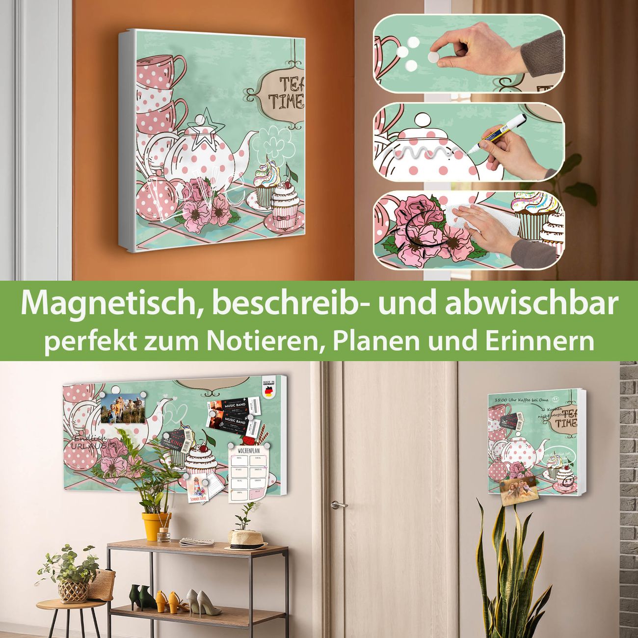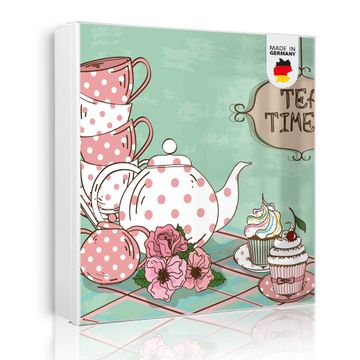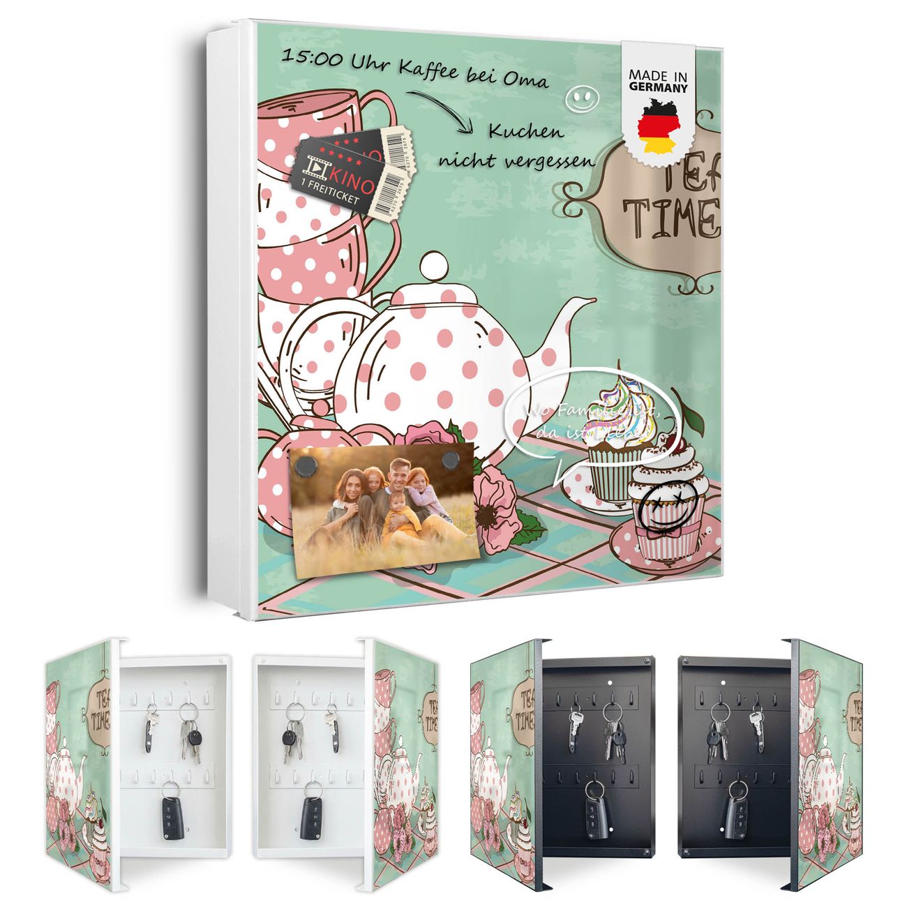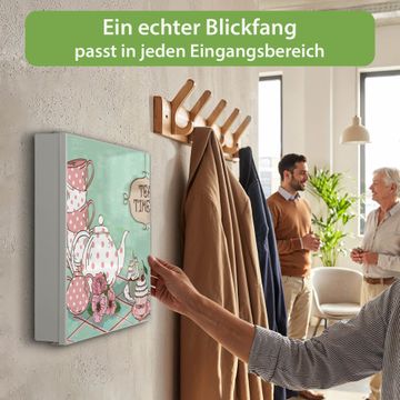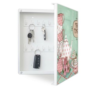 Bringe Ordnung und Eleganz in deinen Eingangsbereich mit dem banjado Schlüsselkasten Motiv Motiv Tea Time. Die moderne Schlüsselbox kombiniert funktionales Design mit hochwertiger Verarbeitung und wird so zu einem echten Hingucker in Flur, Büro oder Ferienwohnung. ✅ Stilvolle Schlüsselaufbewahrung mit Motiv Motiv Tea Time Der Design-Schlüsselkasten Motiv Motiv Tea Time bietet Platz für bis zu 32 Schlüssel, die auf 4 stabilen Reihen mit je 8 Haken übersichtlich verstaut werden. Mit seinen kompakten Maßen von 30 x 30 x 5 cm passt die Schlüsselbox perfekt auch in kleinere Räume. Der weiß lackierte Stahlkorpus mit rechts angeschlagenem Türscharnier harmoniert mit gedruckten Folie auf der Front und fügt sich nahtlos in jedes Wohnambiente ein. Ob als Schlüsselorganizer für Zuhause oder als praktische Lösung für Büros, Praxen und Gewerbe, der banjado Schlüsselkasten sorgt für Ordnung und Übersicht. Dank der magnetischen, mit Kreidestiften beschreibbaren Folie auf der Front kannst du Notizen anheften oder Termine direkt auf der Oberfläche festhalten. Die Schlüsselbox Motiv Motiv Tea Time zur Wandmontage wird inklusive Befestigungsmaterial geliefert und ist schnell angebracht. So hast du deine Schlüssel jederzeit griffbereit und zugleich stilvoll verstaut. Mit diesem banjado Schlüsselkasten Motiv Motiv Tea Time kombinierst du praktische Aufbewahrung mit stilvollem Wohndesign. Ob privat oder geschäftlich, die Schlüsselbox sorgt für mehr Ordnung, Übersicht und ein wohnliches Ambiente.Vorteile im Überblick