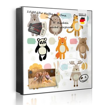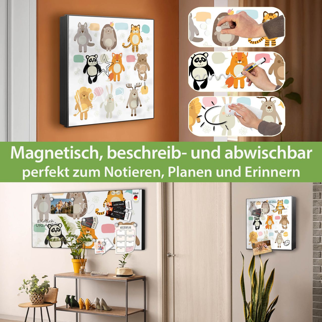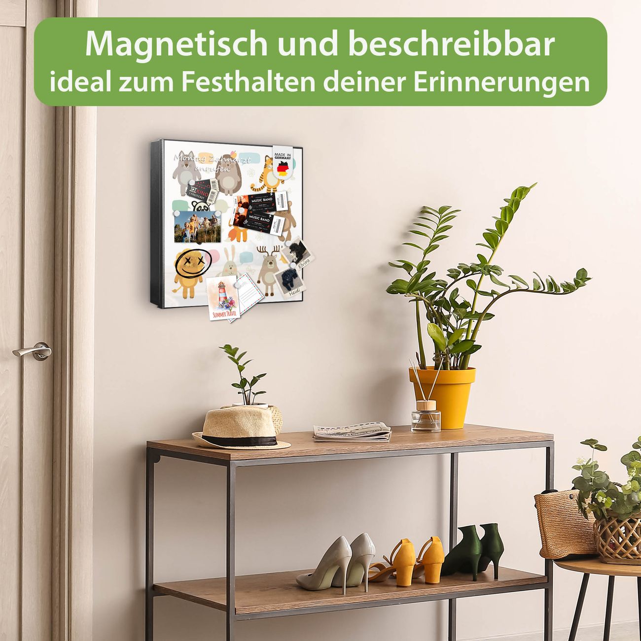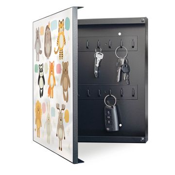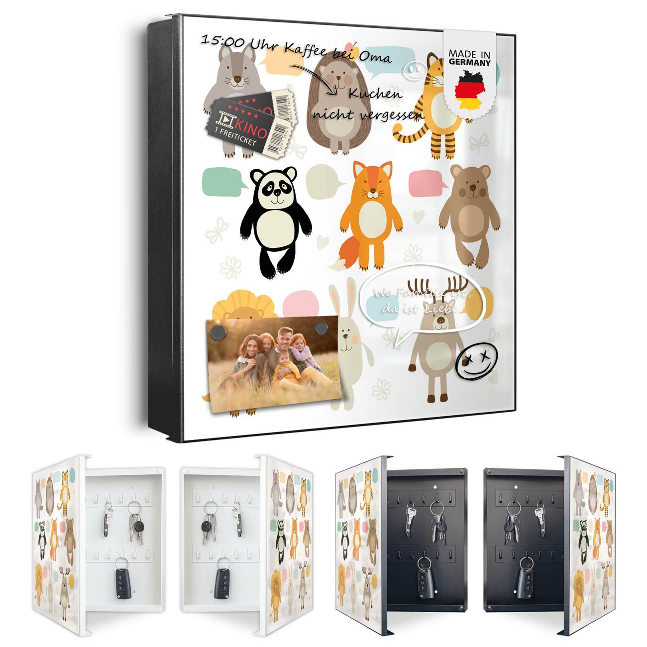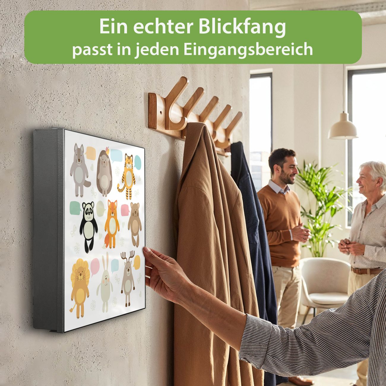 Bringe Ordnung und Eleganz in deinen Eingangsbereich mit dem banjado Schlüsselkasten Motiv Motiv Tierfreunde. Die moderne Schlüsselbox kombiniert funktionales Design mit hochwertiger Verarbeitung und wird so zu einem echten Hingucker in Flur, Büro oder Ferienwohnung. ✅ Stilvolle Schlüsselaufbewahrung mit Motiv Motiv Tierfreunde Der Design-Schlüsselkasten Motiv Motiv Tierfreunde bietet Platz für bis zu 32 Schlüssel, die auf 4 stabilen Reihen mit je 8 Haken übersichtlich verstaut werden. Mit seinen kompakten Maßen von 30 x 30 x 5 cm passt die Schlüsselbox perfekt auch in kleinere Räume. Der schwarz lackierte Stahlkorpus mit links angeschlagenem Türscharnier harmoniert mit gedruckten Folie auf der Front und fügt sich nahtlos in jedes Wohnambiente ein. Ob als Schlüsselorganizer für Zuhause oder als praktische Lösung für Büros, Praxen und Gewerbe, der banjado Schlüsselkasten sorgt für Ordnung und Übersicht. Dank der magnetischen, mit Kreidestiften beschreibbaren Folie auf der Front kannst du Notizen anheften oder Termine direkt auf der Oberfläche festhalten. Die Schlüsselbox Motiv Motiv Tierfreunde zur Wandmontage wird inklusive Befestigungsmaterial geliefert und ist schnell angebracht. So hast du deine Schlüssel jederzeit griffbereit und zugleich stilvoll verstaut. Mit diesem banjado Schlüsselkasten Motiv Motiv Tierfreunde kombinierst du praktische Aufbewahrung mit stilvollem Wohndesign. Ob privat oder geschäftlich, die Schlüsselbox sorgt für mehr Ordnung, Übersicht und ein wohnliches Ambiente.Vorteile im Überblick