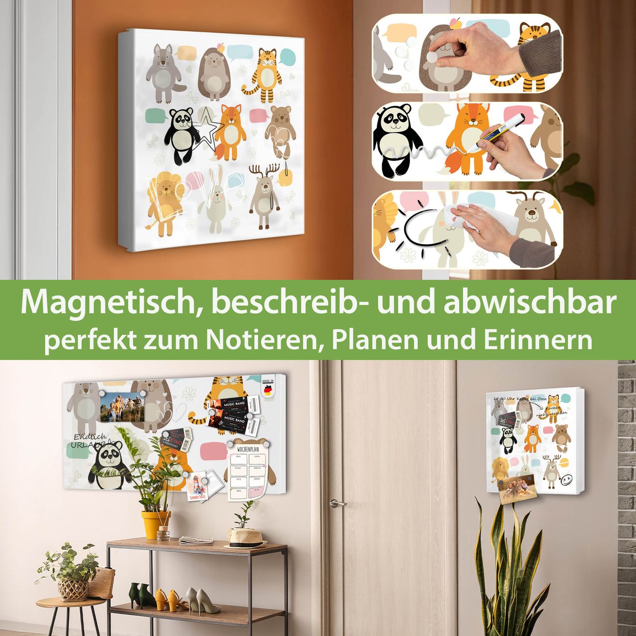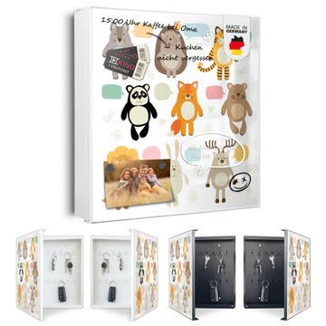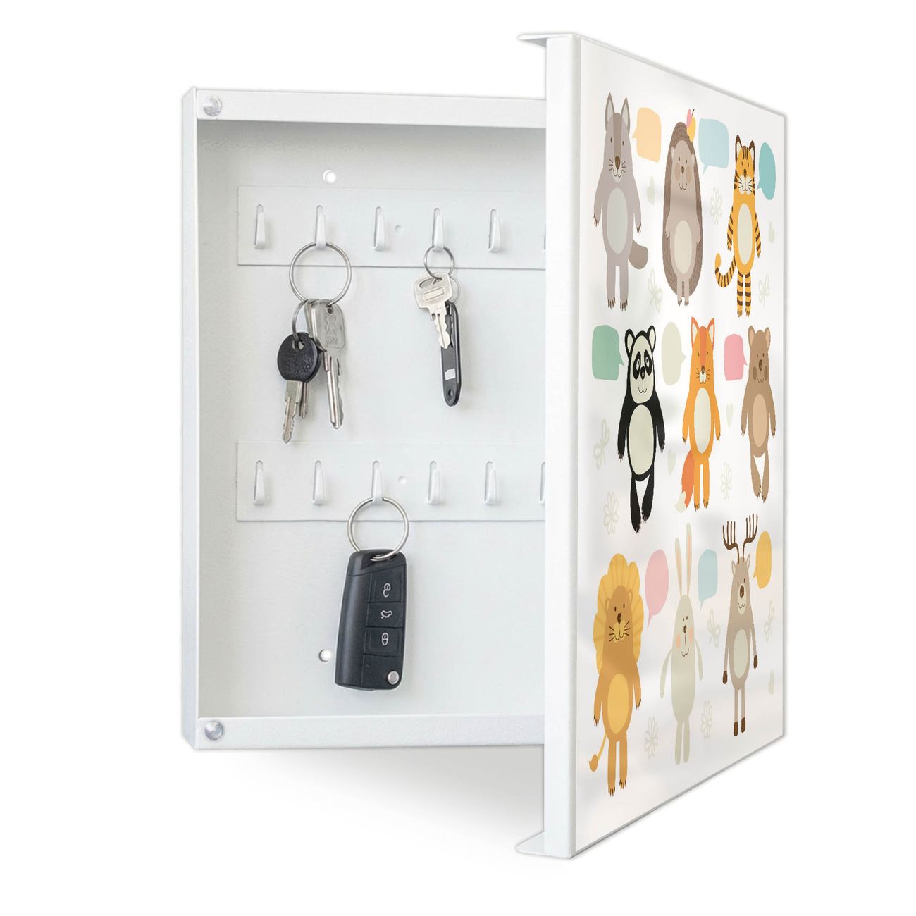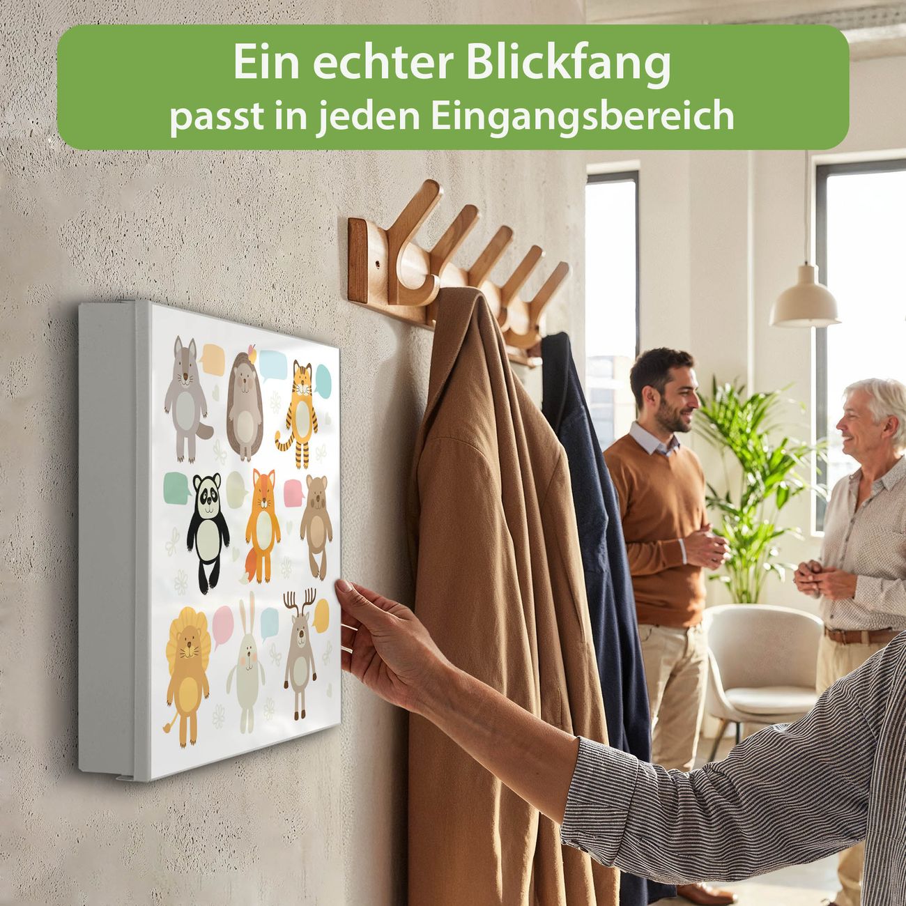 Bringe Ordnung und Eleganz in deinen Eingangsbereich mit dem banjado Schlüsselkasten Motiv Motiv Tierfreunde. Die moderne Schlüsselbox kombiniert funktionales Design mit hochwertiger Verarbeitung und wird so zu einem echten Hingucker in Flur, Büro oder Ferienwohnung. ✅ Stilvolle Schlüsselaufbewahrung mit Motiv Motiv Tierfreunde Der Design-Schlüsselkasten Motiv Motiv Tierfreunde bietet Platz für bis zu 32 Schlüssel, die auf 4 stabilen Reihen mit je 8 Haken übersichtlich verstaut werden. Mit seinen kompakten Maßen von 30 x 30 x 5 cm passt die Schlüsselbox perfekt auch in kleinere Räume. Der weiß lackierte Stahlkorpus mit rechts angeschlagenem Türscharnier harmoniert mit gedruckten Folie auf der Front und fügt sich nahtlos in jedes Wohnambiente ein. Ob als Schlüsselorganizer für Zuhause oder als praktische Lösung für Büros, Praxen und Gewerbe, der banjado Schlüsselkasten sorgt für Ordnung und Übersicht. Dank der magnetischen, mit Kreidestiften beschreibbaren Folie auf der Front kannst du Notizen anheften oder Termine direkt auf der Oberfläche festhalten. Die Schlüsselbox Motiv Motiv Tierfreunde zur Wandmontage wird inklusive Befestigungsmaterial geliefert und ist schnell angebracht. So hast du deine Schlüssel jederzeit griffbereit und zugleich stilvoll verstaut. Mit diesem banjado Schlüsselkasten Motiv Motiv Tierfreunde kombinierst du praktische Aufbewahrung mit stilvollem Wohndesign. Ob privat oder geschäftlich, die Schlüsselbox sorgt für mehr Ordnung, Übersicht und ein wohnliches Ambiente.Vorteile im Überblick