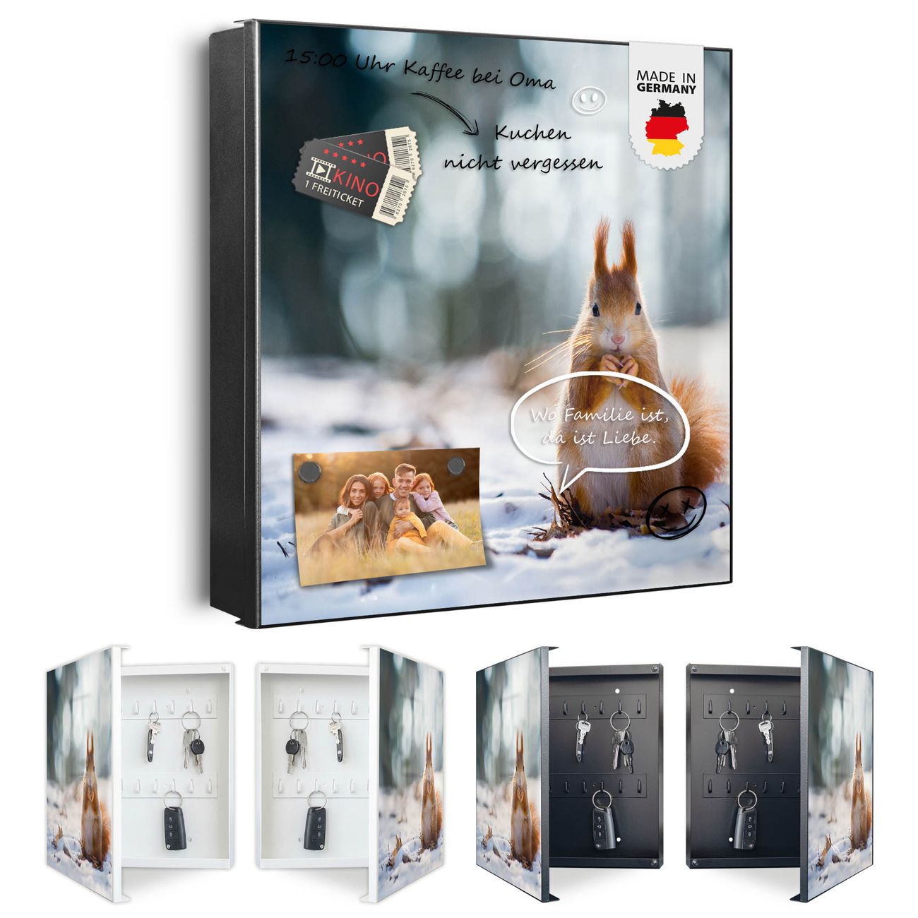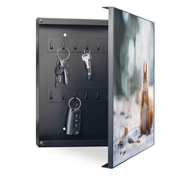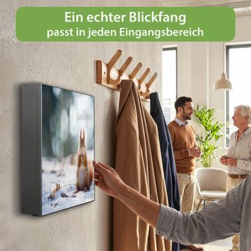 Bringe Ordnung und Eleganz in deinen Eingangsbereich mit dem banjado Schlüsselkasten Motiv Motiv Tiny Tim. Die moderne Schlüsselbox kombiniert funktionales Design mit hochwertiger Verarbeitung und wird so zu einem echten Hingucker in Flur, Büro oder Ferienwohnung. ✅ Stilvolle Schlüsselaufbewahrung mit Motiv Motiv Tiny Tim Der Design-Schlüsselkasten Motiv Motiv Tiny Tim bietet Platz für bis zu 32 Schlüssel, die auf 4 stabilen Reihen mit je 8 Haken übersichtlich verstaut werden. Mit seinen kompakten Maßen von 30 x 30 x 5 cm passt die Schlüsselbox perfekt auch in kleinere Räume. Der schwarz lackierte Stahlkorpus mit rechts angeschlagenem Türscharnier harmoniert mit gedruckten Folie auf der Front und fügt sich nahtlos in jedes Wohnambiente ein. Ob als Schlüsselorganizer für Zuhause oder als praktische Lösung für Büros, Praxen und Gewerbe, der banjado Schlüsselkasten sorgt für Ordnung und Übersicht. Dank der magnetischen, mit Kreidestiften beschreibbaren Folie auf der Front kannst du Notizen anheften oder Termine direkt auf der Oberfläche festhalten. Die Schlüsselbox Motiv Motiv Tiny Tim zur Wandmontage wird inklusive Befestigungsmaterial geliefert und ist schnell angebracht. So hast du deine Schlüssel jederzeit griffbereit und zugleich stilvoll verstaut. Mit diesem banjado Schlüsselkasten Motiv Motiv Tiny Tim kombinierst du praktische Aufbewahrung mit stilvollem Wohndesign. Ob privat oder geschäftlich, die Schlüsselbox sorgt für mehr Ordnung, Übersicht und ein wohnliches Ambiente.Vorteile im Überblick