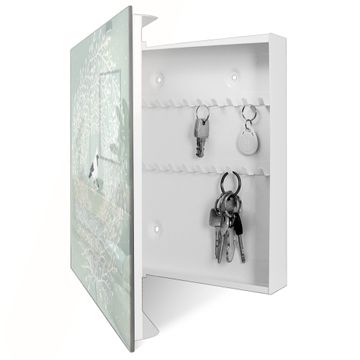 Bringe Ordnung und Eleganz in deinen Eingangsbereich mit dem banjado Schlüsselkasten Motiv Motiv Vogel im Kranz. Die moderne Schlüsselbox kombiniert funktionales Design mit hochwertiger Verarbeitung und wird so zu einem echten Hingucker in Flur, Büro oder Ferienwohnung. ✅ Stilvolle Schlüsselaufbewahrung mit Glasfront im Motiv Motiv Vogel im Kranz Der Design-Schlüsselkasten Motiv Motiv Vogel im Kranz bietet Platz für bis zu 50 Schlüssel, die auf 5 stabilen Reihen mit je 10 Haken übersichtlich verstaut werden. Mit seinen kompakten Maßen von 30 x 30 x 5 cm passt die Schlüsselbox perfekt auch in kleinere Räume. Der weiß lackierte Stahlkorpus mit rechts angeschlagenem Türscharnier harmoniert mit der Glasfront und fügt sich nahtlos in jedes Wohnambiente ein. Ob als Schlüsselorganizer für Zuhause oder als praktische Lösung für Büros, Praxen und Gewerbe, der banjado Schlüsselkasten sorgt für Ordnung und Übersicht. Dank der magnetischen, mit Kreidestiften beschreibbaren Glasfront kannst du Notizen anheften oder Termine direkt auf der Oberfläche festhalten. Die Schlüsselbox Motiv Motiv Vogel im Kranz zur Wandmontage wird inklusive Befestigungsmaterial geliefert und ist schnell angebracht. So hast du deine Schlüssel jederzeit griffbereit und zugleich stilvoll verstaut. Mit diesem banjado Schlüsselkasten Motiv Motiv Vogel im Kranz kombinierst du praktische Aufbewahrung mit stilvollem Wohndesign. Ob privat oder geschäftlich, die Schlüsselbox sorgt für mehr Ordnung, Übersicht und ein wohnliches Ambiente.Vorteile im Überblick